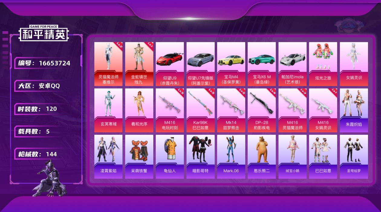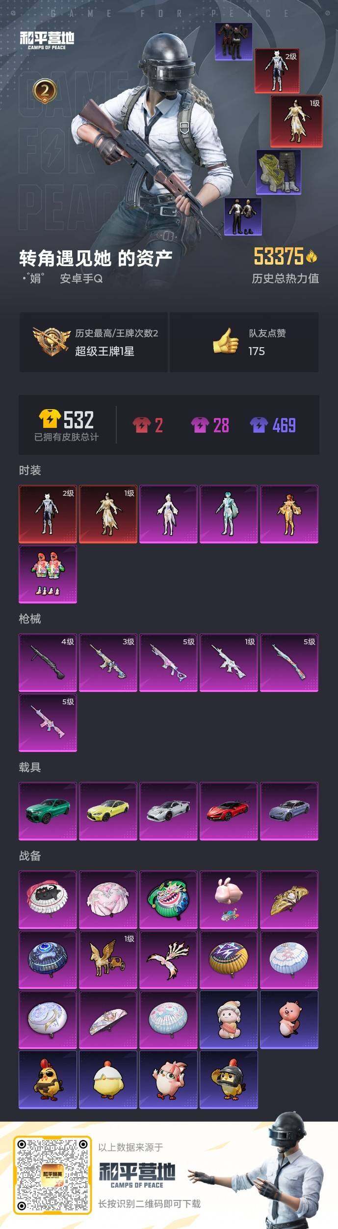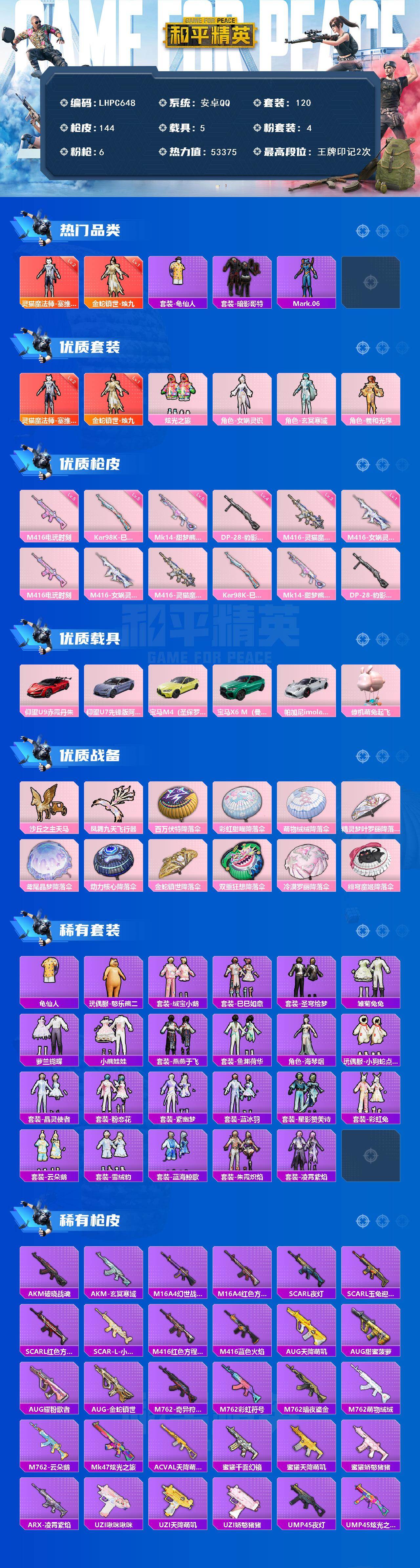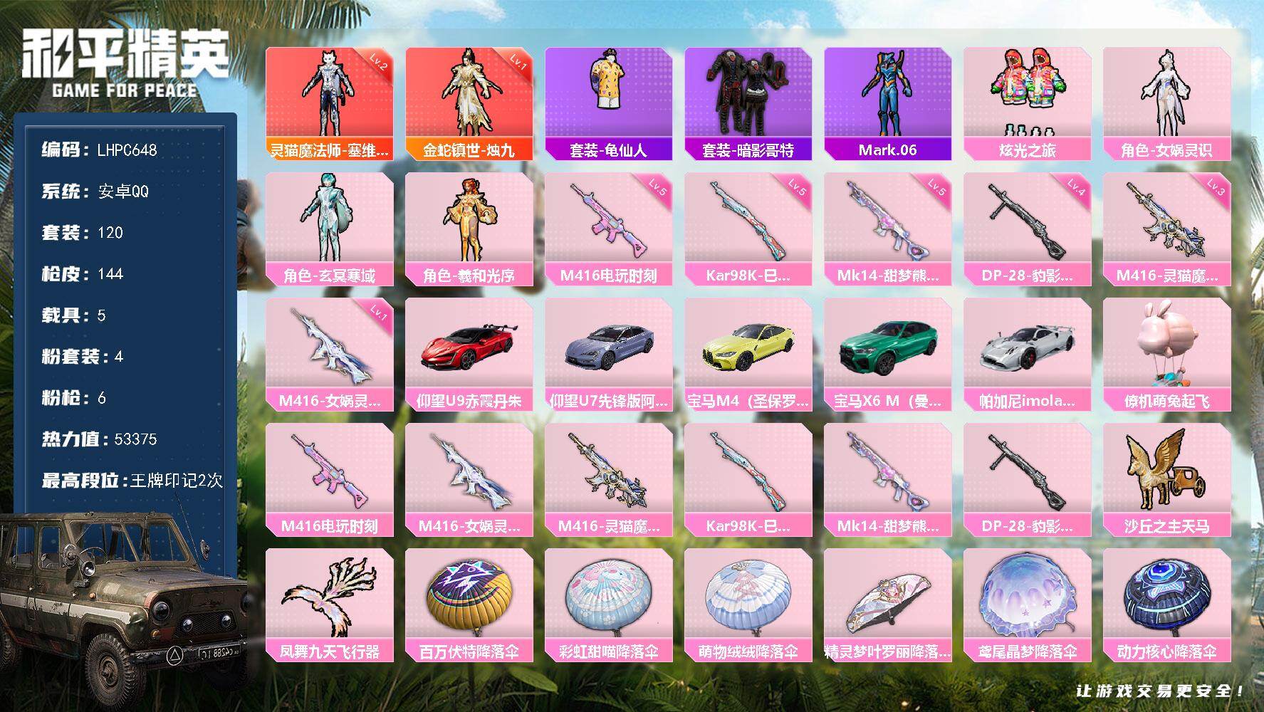 [16653724]【店主推荐捡漏号!可直接换绑】安卓 手Q-2神装-4粉装-6特效枪-5载具-2粉色飞行器-53375热力值-2王牌印记-120套装-144枪皮