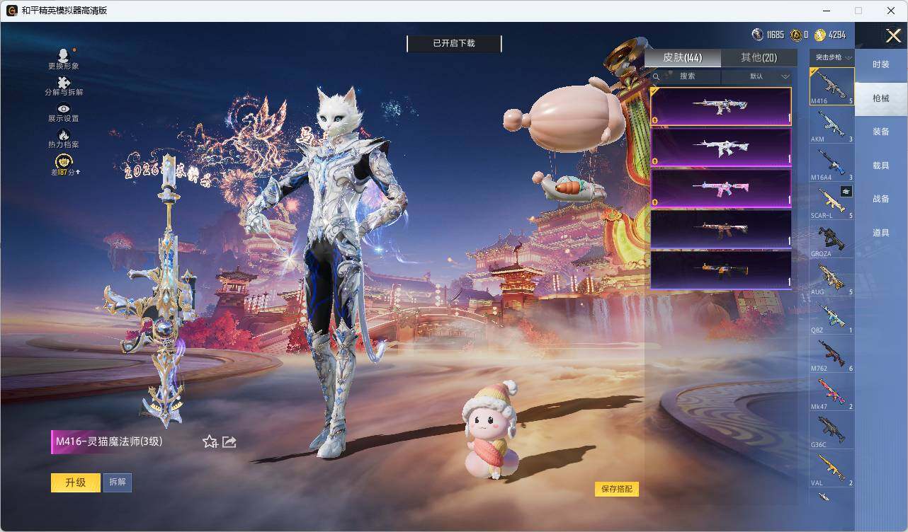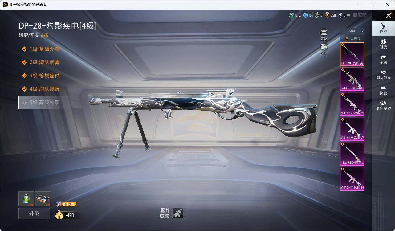 【粉色枪皮等级】:M416-电玩时刻(五级),M416-女娲灵识(一级),M416-灵猫魔法师(三级),Kar98K-巳巳如意(五级),Mk14-甜梦熊击(五级),DP-28-豹影疾电(四级)
