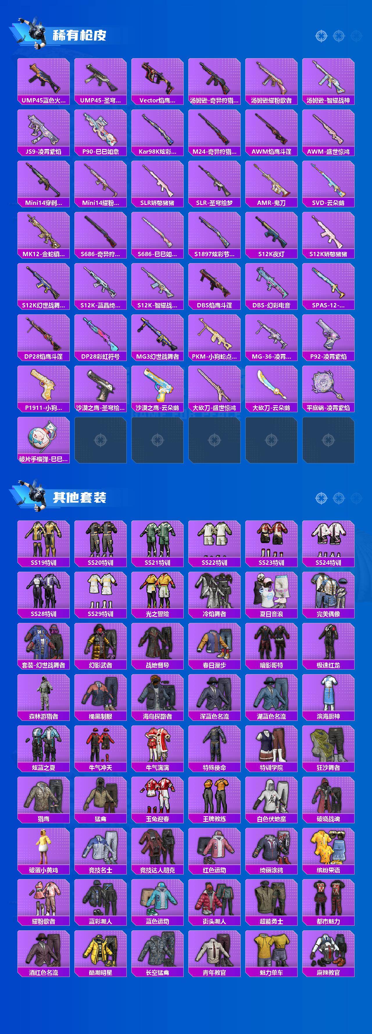 【稀有枪皮】:AKM-破晓战魂,AKM-玄冥寒域,M16A4-幻世战舞者,M16A4-红色方程式,SCAR-L-夜灯,SCAR-L-玉兔迎春,SCAR-L-红色方程式,SCAR-L-小狗蛇点点,M416-红色方程式,M416-蓝色火焰,AUG-天降萌叽,AUG-甜蜜菠萝,AUG-耀粉歌者,AUG-金蛇镇世,M762-奇异狩猎者,M762-彩虹符号,M762-暗夜鎏金,M762-萌物绒绒,M762-云朵鹅,Mk47-炫光之旅,AC-VAL-天降萌叽,蜜獾-千面幻镜,蜜獾-天降萌叽,蜜獾-娇憨猪猪,A