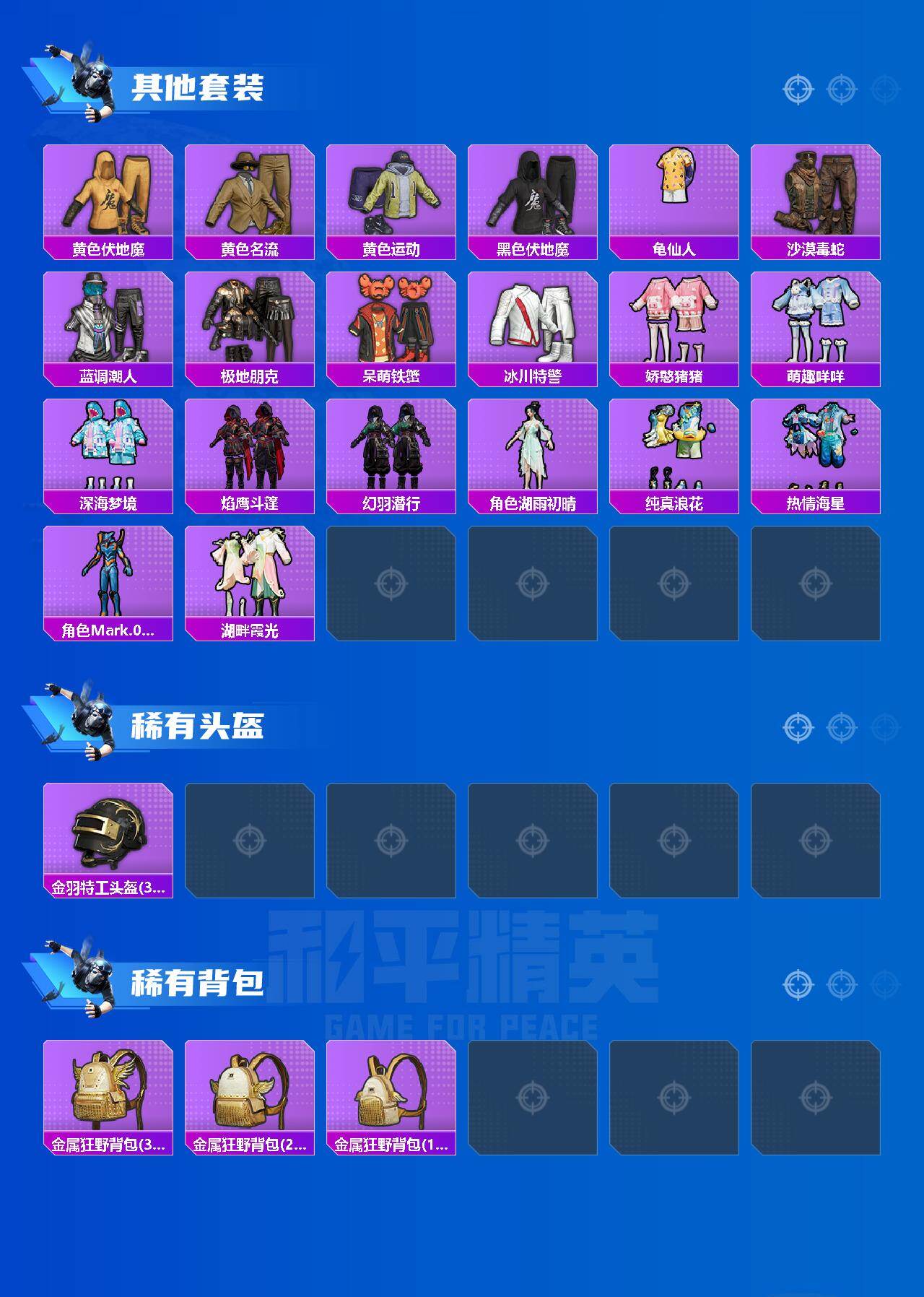 - [16542026]【特价出售/店主推荐】 251m总资产-24885k哈伏币-60烽火等级-青铜-1战场等级-无军衔 【干员外观】:红狼-电锯惊魂,露娜-金牌射手 【近战皮肤】:近战-黑鹰 【传说外观】:M4A1突击步枪-蚀金玫瑰,ASh-12战斗步枪-鹅鸭杀,SG552突击步枪-运动员,SCAR-H战斗步枪-启航,KC17突击步枪-电锯惊魂,QCQ171冲锋枪-鹅鸭杀,QJB201轻机枪-鹅鸭杀,R93狙击步枪-维什戴尔 【史诗外观】:M7战斗步枪-百步穿杨,SG552突击步枪-深海恐惧,G3战斗步枪-流沙送葬,AS Val突击步枪-百步穿杨,MP5冲锋枪-战术竞备,Vector冲锋枪-百步穿杨,M250通用机枪-囚徒,M700狙击步枪-百步穿杨,AWM狙击步枪-流沙送葬 【稀有外观】:M4A1突击步枪-繁盛,ASh-12战斗步枪-繁盛,M7战斗步枪-捣蛋鬼,SCAR-H战斗步枪-荣耀列队,腾龙突击步枪-冰天雪地,MP5冲锋枪-弄臣,MP5冲锋枪-哈夫克卫队,Vector冲锋枪-先锋,UZI冲锋枪-亚特兰蒂斯,SMG-45-行动开启,勇士冲锋枪-主宰,勇士冲锋枪-冰天雪地,M1014霰弹枪-幻影结构,QJB201轻机枪-哈夫克卫队,Mini-14射手步枪-荣耀列队,SR-25射手步枪-开拓,PSG-1射手步枪-主宰,G18-星链科技,G18-哈夫克航天 【普通外观】:G17-古铜,AKM突击步枪-噬菌体,M4A1突击步枪-粉色涂装,M4A1突击步枪-高雅黑,M4A1突击步枪-海色,QBZ95-1突击步枪-高雅黑,QBZ95-1突击步枪-海浪,QBZ95-1突击步枪-海色,K416突击步枪-高雅黑,M16A4突击步枪-高雅黑,AUG突击步枪-浅蓝涂装,M7战斗步枪-红色涂装,SG552突击步枪-浅蓝涂装,SG552突击步枪-海浪,AK-12突击步枪-变色龙,SCAR-H战斗步枪-数码迷彩,G3战斗步枪-高雅黑,PTR-32突击步枪-黄蜂,CAR-15突击步枪-变色龙,K437突击步枪-磐石,MP5冲锋枪-黄蜂,Vector冲锋枪-几何迷彩,UZI冲锋枪-海色,野牛冲锋枪-高雅黑,SR-3M紧凑突击步枪-变色龙,QCQ171冲锋枪-三角洲力量,M1014霰弹枪-高雅黑,M1014霰弹枪-变色龙,M250通用机枪-条纹,QJB201轻机枪-磐石,SVD狙击步枪-高雅黑,SR-25射手步