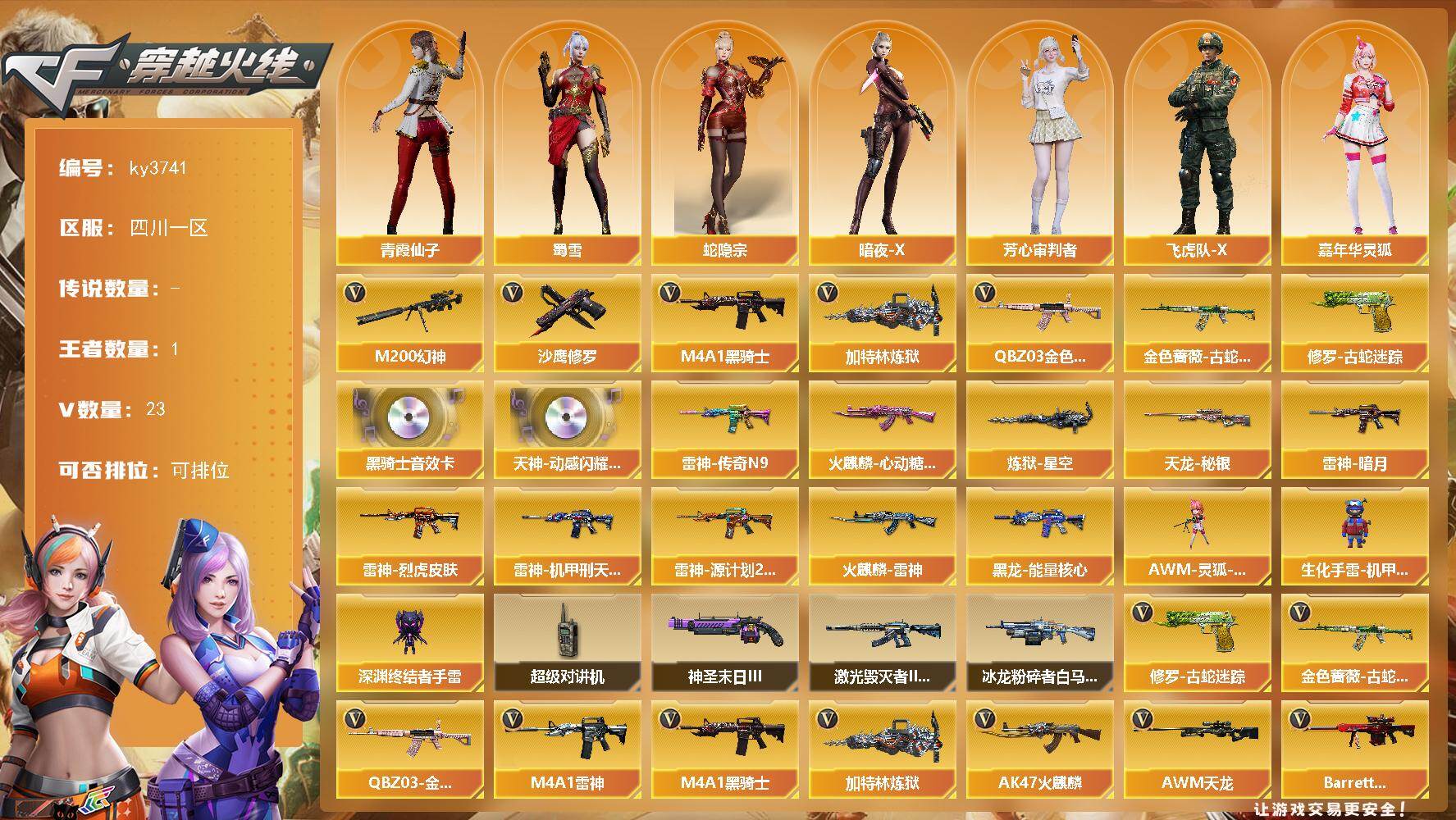 [16434398]四川一区-23V-1王者-0炫金 【热门武器】:QBZ03-金色蔷薇,M200-幻神,金色蔷薇-古蛇迷踪,修罗-古蛇迷踪,M4A1-黑骑士,加特林-炼狱,沙鹰-修罗 【音效卡】:天神-动感闪耀 音效卡,M4A1-黑骑士音效卡 【皮肤】:雷神-暗月,雷神-传奇N9,雷神-烈虎皮肤,雷神-机甲刑天皮肤,雷神-源计划2.0专属 皮肤,火麒麟-雷神,火麒麟-心动糖果,黑龙-能量核心,天龙-秘银,炼狱-星空 【角色】:蛇隐宗,暗夜-X,芳心审判者,飞虎队-X,嘉年华灵狐,娟娟,兰-新年限定,灵狐者-X,麻雀,曼陀罗-X,潘多拉-X,青霞仙子,蛇姬,斯沃特-X,蜀雪,兔囡囡,雪莉杨-摸金校尉,樱-战斗天使,游珑儿 【人偶武器】:AWM-灵狐-15周年嘉年华,生化手雷-机甲核心,深渊终结者手雷 【暴走生化】:超级对讲机 【挑战大师】:冰龙粉碎者-白马银枪,激光毁灭者III-白马银枪,神圣爆裂者-末日III 【英雄级武器】:AK47-火麒麟,M4A1-雷神*2,M4A1-黑骑士,无影-神兵利器,QBZ03-云龙,黑武士-锦绣游龙,金色蔷薇-古蛇迷踪,QBZ03-金色蔷薇,黑骑士-海王*2,AWM-天龙,Barrett-极光,M200-幻神,加特林-炼狱,沙鹰-修罗,沙鹰-天神,COP 357-雷霆王者-觉醒版,修罗-古蛇迷踪,屠龙*2,幻灵之锋,高爆手雷-幻灵,高爆手雷-古蛇迷踪,闪光弹-幻灵,烟雾弹-幻灵,烟雾弹-古蛇迷踪 【道具】:云山科技背包,全能枪王背包,古蛇迷踪炫彩背包,战舰背包,超级背包,绿色巨人,灵魂忍者,变异宝贝,迷雾幽灵,生化弹匣,夺命之镰,防化服*2,金色流光-枪王排位*2,星辰流光-枪王排位,枪王排位28赛季金色流光,枪王排位29赛季金色流光,古蛇迷踪打击特效,蛇隐宗表情,斯沃特表情,防弹头盔*3,防弹衣*4,C4工具钳*2,手雷包*2 【特殊枪械】:1黑骑士,1炼狱