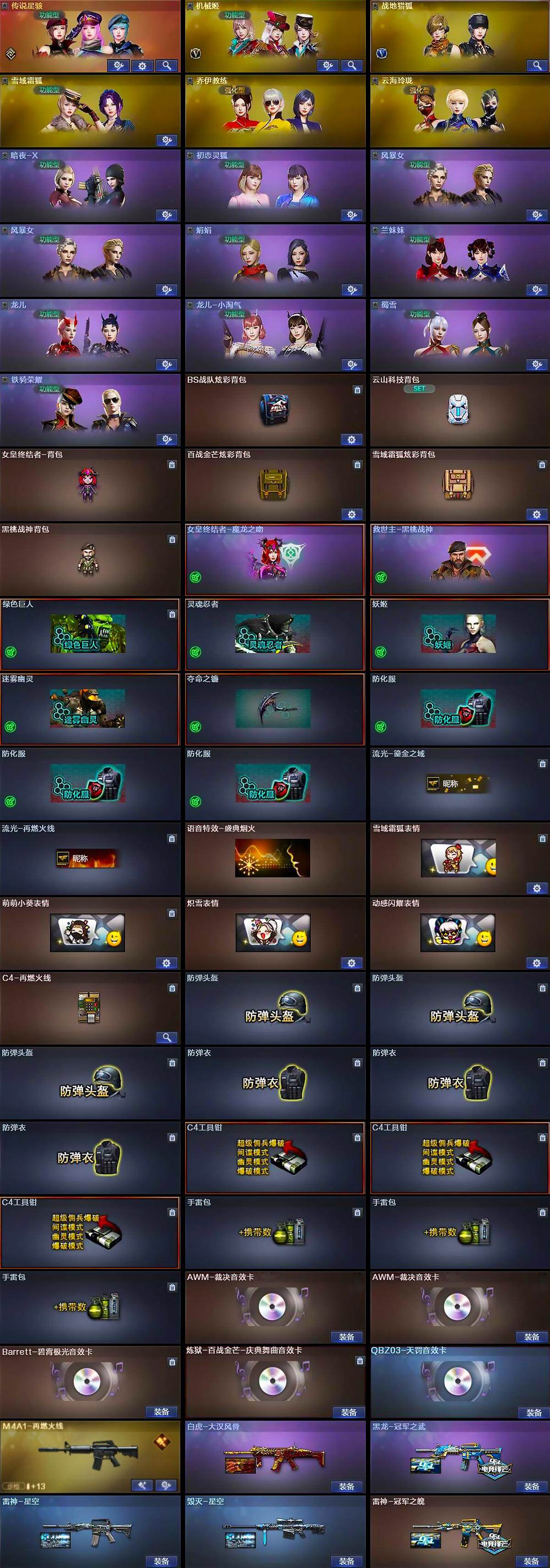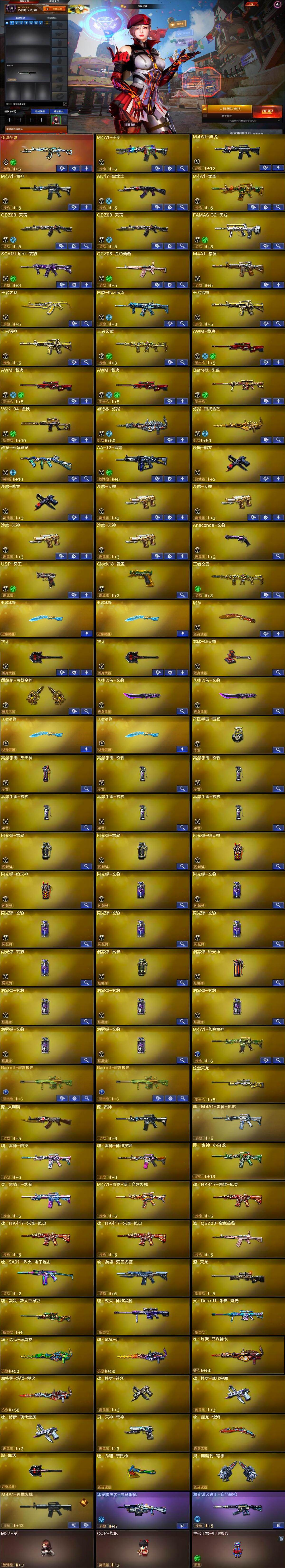 【英雄级武器】:M4A1-千变,M4A1-黑龙,M4A1-雷神,AK47-黑武士,M4A1-武圣,QBZ03-天罚*2,FAMAS G2-天戎,SCAR Light-玄豹,QBZ03-独角-III,QBZ03-金色蔷薇,M4A1-猎神,王者之鲨-觉醒版,白虎-电玩蓝兔,王者猎神-觉醒版*2,王者玄武-觉醒版,AWM-裁决*3,Barrett-朱雀,VSK-94-金蚀,加特林-炼狱,炼狱-百战金芒,烈龙-云海游龙,AA-12-雷霆,沙鹰-修罗*2,沙鹰-天神*4,Anaconda-玄豹,USP-冥王,Glock18-武圣,屠龙,擎天*2,龙啸-堕天神,麒麟刺-百战金芒,丛林匕首-玄豹*2,王者冰锋-觉醒版*2,高爆手雷-雷暴,高爆手雷-堕天神,高爆手雷-玄豹*5,闪光弹-雷暴*2,闪光弹-堕天神*2,闪光弹-玄豹*6,烟雾弹-雷暴,烟雾弹-堕天神,烟雾弹-玄豹*5,M4A1-苍鸣雷神,Barrett-碧霄极光*2
