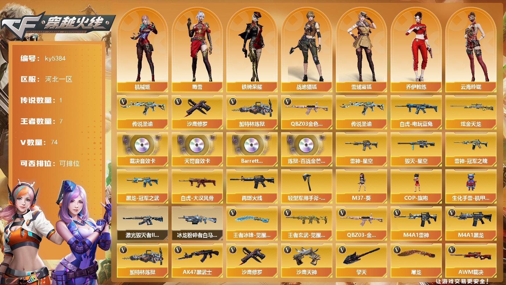 [16479294]河北一区-75V-7王者武器数-1炫金武器数 【传说武器】:传说圣谕 【传说角色】:传说星骇 【热门武器】:传说圣谕,QBZ03-金色蔷薇,白虎-电玩蓝兔,加特林-炼狱,沙鹰-修罗*2 【王者炫金武器】:炫金天龙 【音效卡】:AWM-裁决音效卡*2,QBZ03-天罚音效卡,Barrett-碧霄极光音效卡,炼狱-百战金芒-庆典舞曲音效卡 【皮肤】:白虎-大汉风骨,雷神-星空,雷神-冠军之魄,M4A1-再燃火线,毁灭-星空,黑龙-冠军之武,轻型军用手斧-再燃火线 【角色】:机械姬,战地猎狐,雪域霜狐,乔伊教练,云海玲珑,暗夜-X,初恋灵狐,风暴女*2,娟娟,兰妹妹,龙儿,龙儿-小淘气,蜀雪,铁骑荣耀 【人偶武器】:M37-葵,COP-旗袍,生化手雷-机甲核心 【挑战大师】:冰龙粉碎者-白马银枪,激光毁灭者III-白马银枪 【英雄级武器】:M4A1-千变,M4A1-黑龙,M4A1-雷神,AK47-黑武士,M4A1-武圣,QBZ03-天罚*2,FAMAS G2-天戎,SCAR Light-玄豹,QBZ03-独角-III,QBZ03-金色蔷薇,M4A1-猎神,王者之鲨-觉醒版,白虎-电玩蓝兔,王者猎神-觉醒版*2,王者玄武-觉醒版,AWM-裁决*3,Barrett-朱雀,VSK-94-金蚀,加特林-炼狱,炼狱-百战金芒,烈龙-云海游龙,AA-12-雷霆,沙鹰-修罗*2,沙鹰-天神*4,Anaconda-玄豹,USP-冥王,Glock18-武圣,屠龙,擎天*2,龙啸-堕天神,麒麟刺-百战金芒,丛林匕首-玄豹*2,王者冰锋-觉醒版*2,高爆手雷-雷暴,高爆手雷-堕天神,高爆手雷-玄豹*5,闪光弹-雷暴*2,闪光弹-堕天神*2,闪光弹-玄豹*6,烟雾弹-雷暴,烟雾弹-堕天神,烟雾弹-玄豹*5,M4A1-苍鸣雷神,Barrett-碧霄极光*2 【道具】:BS战队炫彩背包,云山科技背包,女皇终结者-背包,百战金芒炫彩背包,雪域霜狐炫彩背包,黑桃战神背包,女皇终结者-魔龙之吻,救世主-黑桃战神,绿色巨人,灵魂忍者,妖姬,迷雾幽灵,夺命之镰,防化服*3,流光-鎏金之域,流光-再燃火线,语音特效-盛典烟火,雪域霜狐表情,萌萌小葵表情,炽雪表情,动感闪耀表情,C4-再燃火线,防弹头盔*3,防弹衣*3,C4工具钳*3,手雷包*3 【特殊枪械】:1炼狱