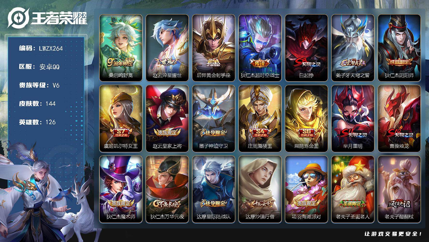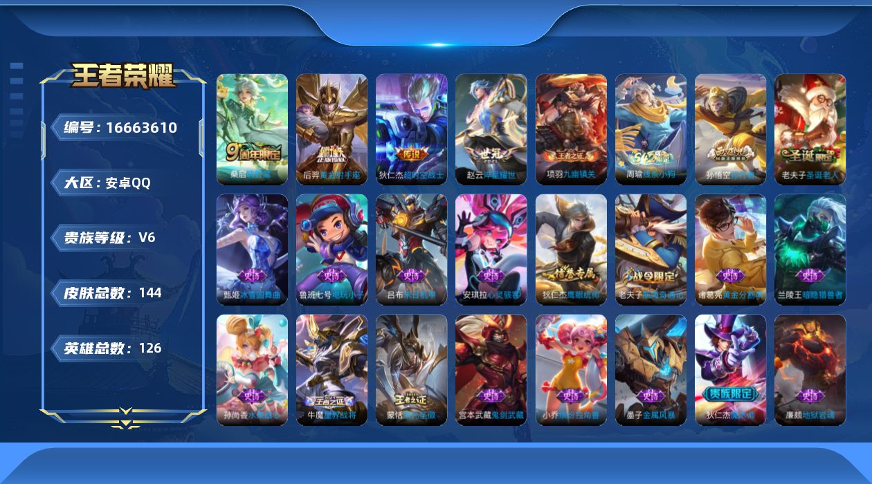 [16663610]【特价出售/店主推荐】安卓Q-V6-至尊星耀IV段位-126英雄-144皮肤-4传说-27史诗 【传说皮肤】:桑启鸣野蒿,赵云淬星耀世,后羿黄金射手座,狄仁杰超时空战士 【限定皮肤】:白起狰,姜子牙天穹之誓,狄仁杰阴阳师,虞姬凯尔特女王,赵云皇家上将,墨子神迹守卫,庄周蜃楼王,扁鹊炼金王,芈月重明,曹操烛龙,狄仁杰魔术师,狄仁杰万华元夜,达摩星际陆战队,达摩沙漠行僧,项羽海滩派对,老夫子圣诞老人,老夫子醍醐杖,老夫子航海奇遇记,程咬金演武夺筹,兰陵王金庭之子,亚瑟潮玩骑士王,孙悟空孙行者,牛魔御旌,李元芳云中旅人,钟馗驱傩正仪,雅典娜单词大作战,太乙真人饕餮,鬼谷子原初探秘者,苏烈千军破阵,沈梦溪大漠名商,蒙犽狂想玩偶喵,桑启海盐诗旅,艾琳女武神,张良古海寻踪,蒙恬荣光圣徽,鬼谷子天穹祈灯,沈梦溪龙舞盛年,刘邦剑破天穹,周瑜熔金海岸 【赛季限定】:庄周蜃楼王,扁鹊炼金王,虞姬凯尔特女王,白起狰,太乙真人饕餮,曹操烛龙,芈月重明,牛魔御旌,老夫子醍醐杖,鬼谷子原初探秘者,狄仁杰万华元夜,程咬金演武夺筹,钟馗驱傩正仪,苏烈千军破阵,达摩沙漠行僧,兰陵王金庭之子,沈梦溪大漠名商,李元芳云中旅人,桑启海盐诗旅,张良古海寻踪,鬼谷子天穹祈灯,刘邦剑破天穹,姜子牙天穹之誓,东皇太一噬灭天穹,太乙真人谧流熔炉,钟馗虚灵犬护,亚瑟荣光之誓,蒙恬荣光圣徽,牛魔星界战将,项羽九幽镇关 【战令限定】:蒙犽狂想玩偶喵,雅典娜单词大作战,亚瑟潮玩骑士王,达摩星际陆战队,老夫子航海奇遇记,墨子神迹守卫,周瑜线条小狗 【史诗皮肤】:鲁班七号电玩小子,赵云皇家上将,老夫子圣诞老人,甄姬冰雪圆舞曲,狄仁杰魔术师,廉颇地狱岩魂,宫本武藏鬼剑武藏,孙尚香水果甜心,嬴政摇滚巨星,妲己魅力维加斯,墨子金属风暴,吕布末日机甲,小乔缤纷独角兽,兰陵王暗隐猎兽者,诸葛亮黄金分割率,雅典娜冰冠公主,安琪拉心灵骇客,刘禅天才门将,李元芳逐浪之夏,程咬金功夫厨神,狄仁杰鹰眼统帅,蒙犽狂想玩偶喵,老夫子航海奇遇记,孙悟空孙行者,蒙恬荣光圣徽,牛魔星界战将,项羽九幽镇关,周瑜线条小狗 【其他皮肤】:项羽海滩派对,韩信教廷特使,韩信街头霸王,赵云白执事,赵云忍炎影,芈月红桃皇后,艾琳女武神,程咬金爱与正义,武则天东方不败,扁鹊化身博士,扁鹊救世之瞳,宫本武藏未来纪元,安琪拉玩偶对对碰,孙膑天使之翼,妲己少女阿狸,典韦黄金武