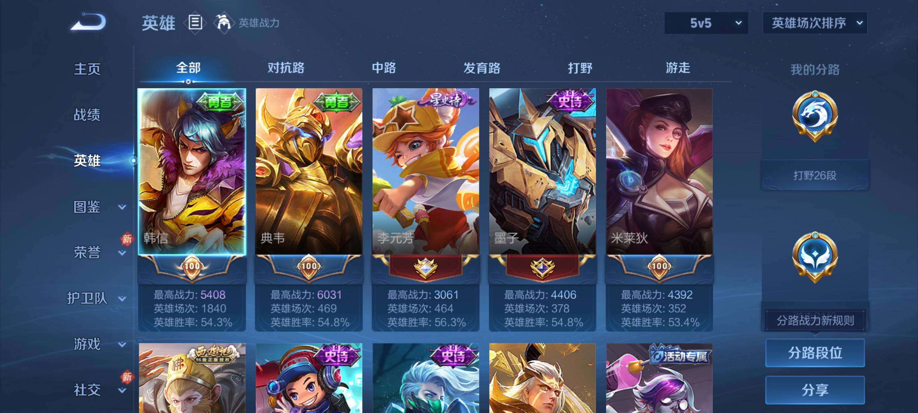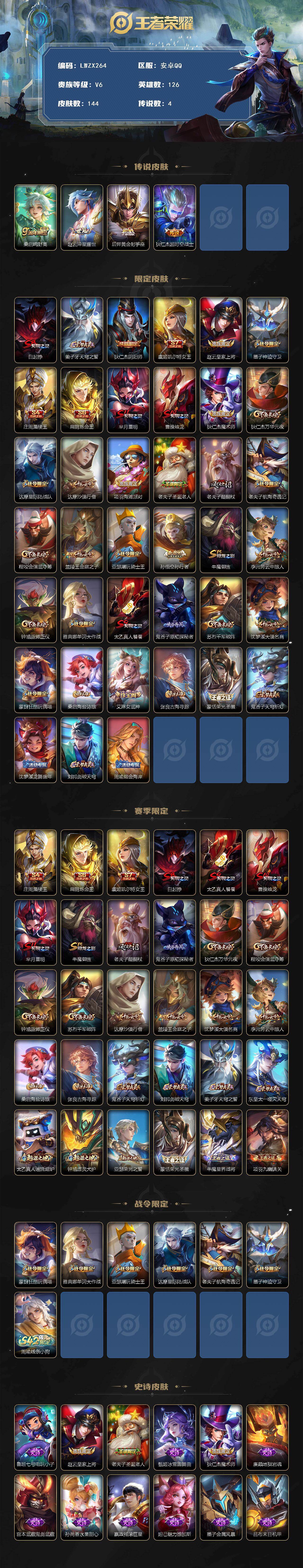 [16663610]【特价出售/店主推荐】安卓Q-V6-至尊星耀IV段位-126英雄-144皮肤-4传说-27史诗