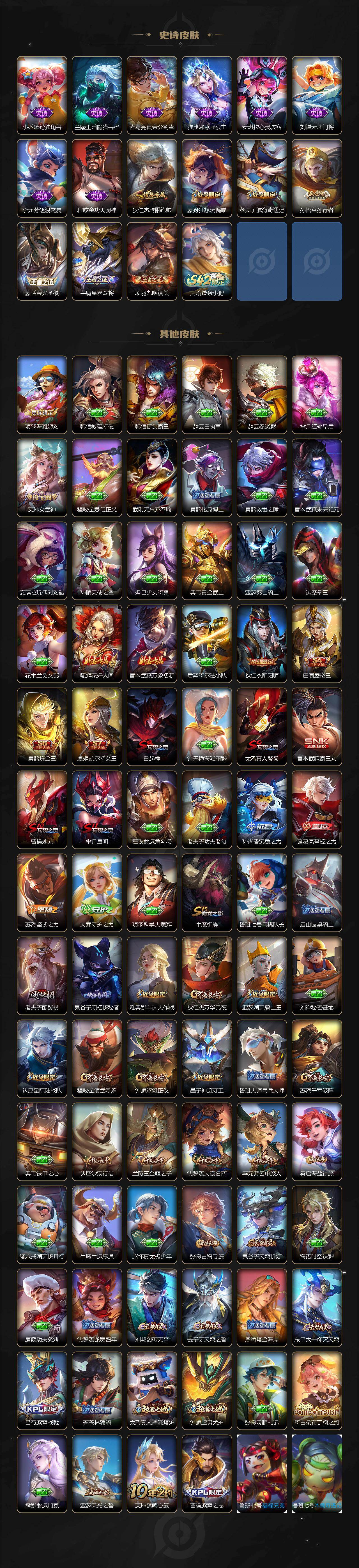 【史诗皮肤】:鲁班七号电玩小子,赵云皇家上将,老夫子圣诞老人,甄姬冰雪圆舞曲,狄仁杰魔术师,廉颇地狱岩魂,宫本武藏鬼剑武藏,孙尚香水果甜心,嬴政摇滚巨星,妲己魅力维加斯,墨子金属风暴,吕布末日机甲,小乔缤纷独角兽,兰陵王暗隐猎兽者,诸葛亮黄金分割率,雅典娜冰冠公主,安琪拉心灵骇客,刘禅天才门将,李元芳逐浪之夏,程咬金功夫厨神,狄仁杰鹰眼统帅,蒙犽狂想玩偶喵,老夫子航海奇遇记,孙悟空孙行者,蒙恬荣光圣徽,牛魔星界战将,项羽九幽镇关,周瑜线条小狗