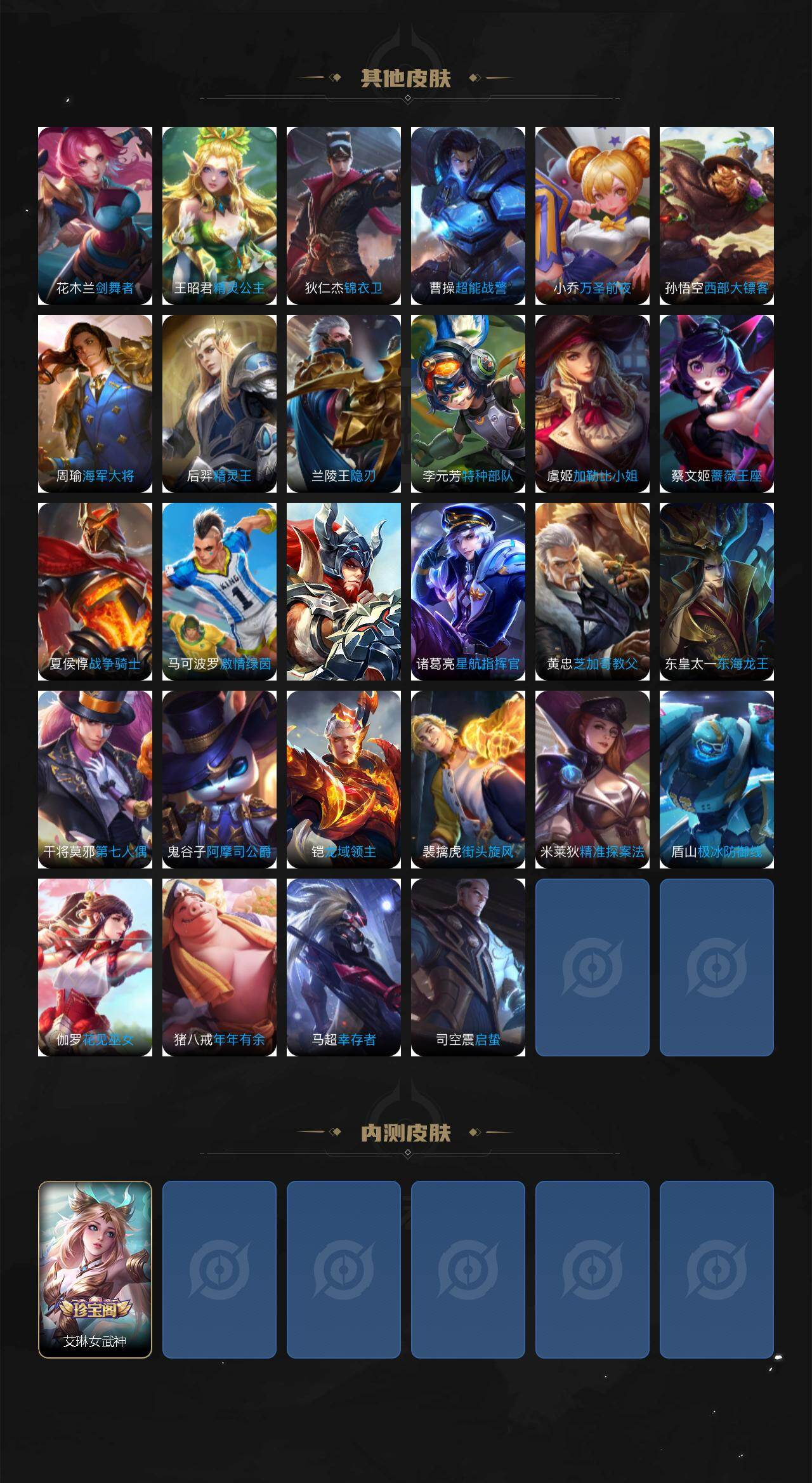 【限定皮肤】:白起狰,姜子牙天穹之誓,狄仁杰阴阳师,虞姬凯尔特女王,赵云皇家上将,墨子神迹守卫,庄周蜃楼王,扁鹊炼金王,芈月重明,曹操烛龙,狄仁杰魔术师,狄仁杰万华元夜,达摩星际陆战队,达摩沙漠行僧,项羽海滩派对,老夫子圣诞老人,老夫子醍醐杖,老夫子航海奇遇记,程咬金演武夺筹,兰陵王金庭之子,亚瑟潮玩骑士王,孙悟空孙行者,牛魔御旌,李元芳云中旅人,钟馗驱傩正仪,雅典娜单词大作战,太乙真人饕餮,鬼谷子原初探秘者,苏烈千军破阵,沈梦溪大漠名商,蒙犽狂想玩偶喵,桑启海盐诗旅,艾琳女武神,张良古海寻踪,蒙恬荣光圣徽,鬼谷子天穹祈灯,沈梦溪龙舞盛年,刘邦剑破天穹,周瑜熔金海岸
