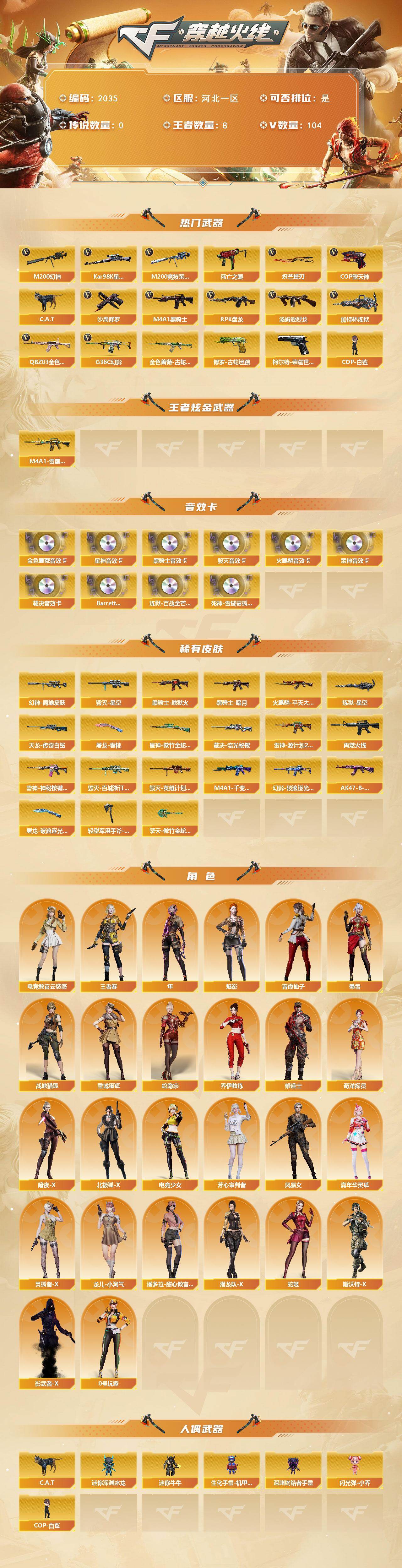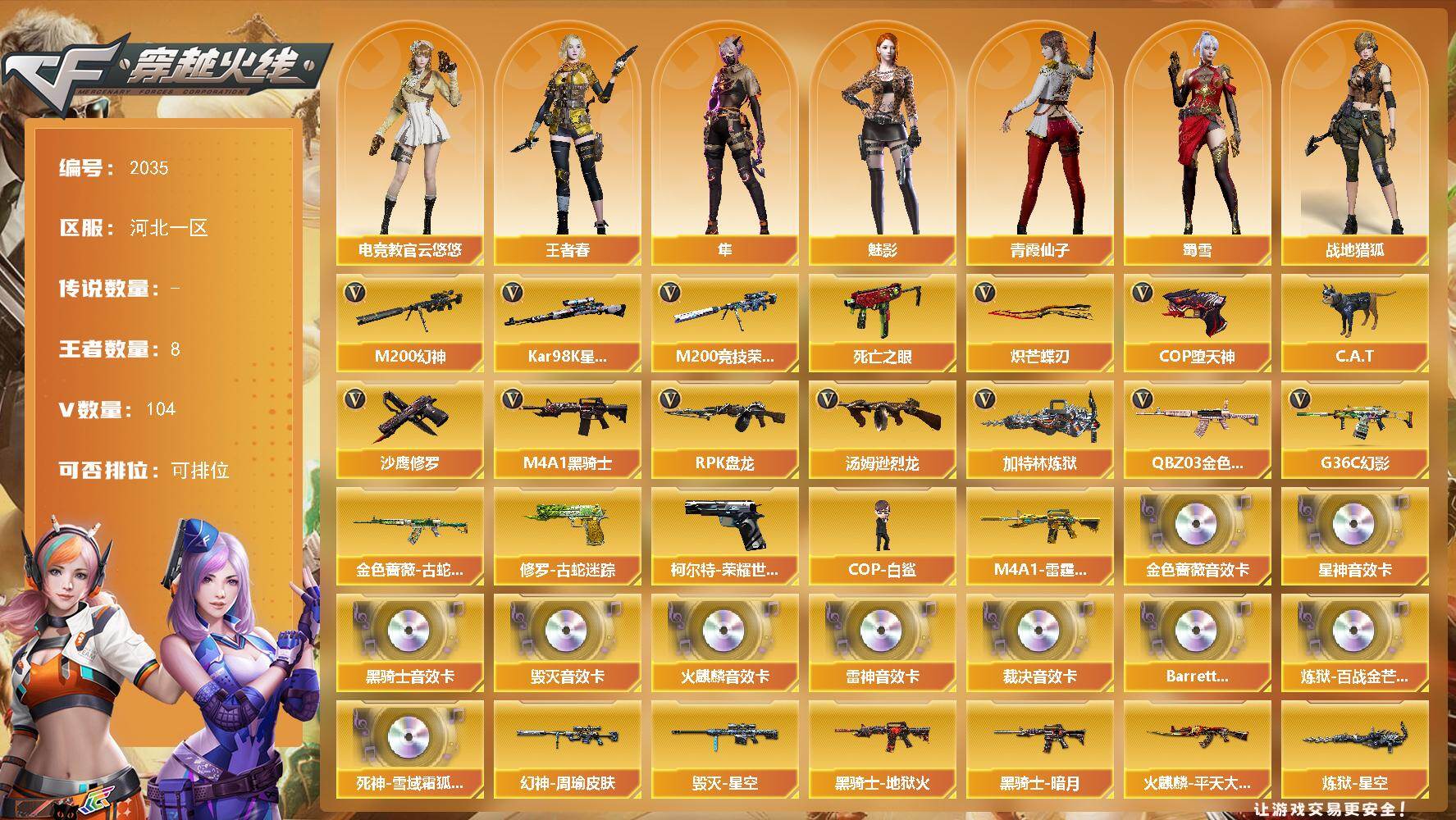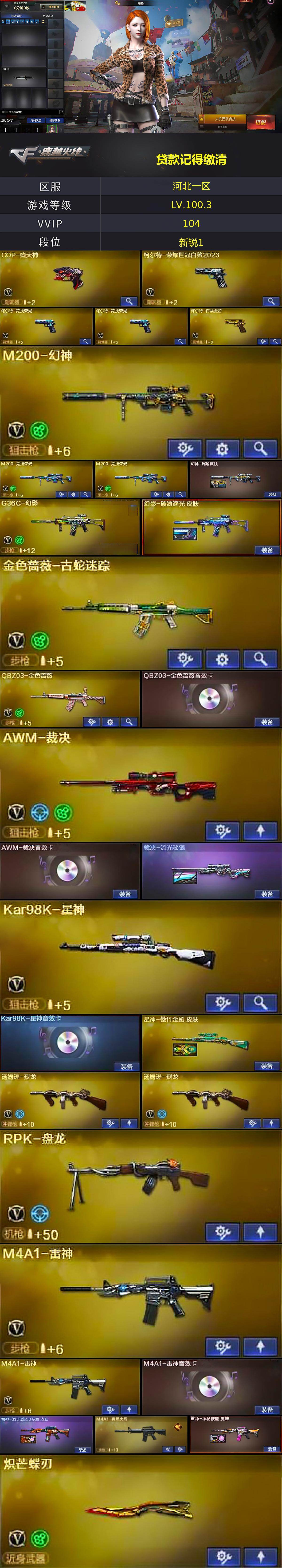 [16665466]河北一区-107V-8王者武器数-0炫金武器数 【热门武器】:G36C-幻影,QBZ03-金色蔷薇,M200-幻神,柯尔特-荣耀世冠白鲨2023,金色蔷薇-古蛇迷踪,修罗-古蛇迷踪,M200-竞技荣光*2,死亡之眼,Kar98K-星神,C.A.T,M4A1-黑骑士*2,汤姆逊-烈龙*2,RPK-盘龙,加特林-炼狱,COP-白鲨,COP-堕天神,沙鹰-修罗*3,炽芒蝶刃 【王者炫金武器】:M4A1-雷霆王者 【音效卡】:AK47-火麒麟音效卡,M4A1-雷神音效卡,M4A1-黑骑士音效卡,Barrett-毁灭音效卡,QBZ03-金色蔷薇音效卡,AWM-裁决音效卡,Kar98K-星神音效卡,Barrett-碧霄极光音效卡,炼狱-百战金芒-庆典舞曲音效卡,死神-雪域霜狐-怀旧音效卡 【皮肤】:幻神-周瑜皮肤,裁决-流光秘银,星神-傲竹金蛇 皮肤,雷神-源计划2.0专属 皮肤,M4A1-再燃火线,雷神-神秘按键 皮肤,火麒麟-平天大圣*2,毁灭-星空,毁灭-百城浙江 皮肤,毁灭-英雄计划 皮肤,M4A1-千变-孔明皮肤,黑骑士-暗月,黑骑士-地狱火,幻影-破浪逐光 皮肤,AK47-B-常胜将军-曹操,AWM-天龙-传奇白鲨,炼狱-星空,屠龙-春桃 皮肤,屠龙-破浪逐光 皮肤,轻型军用手斧-再燃火线,擎天-傲竹金蛇 皮肤 【角色】:魅影,电竞教官-云悠悠,隼,战地猎狐,王者春,雪域霜狐,蛇隐宗,奇洋探员,乔伊教练,修道士,暗夜-X,北极狐-X,电竞少女,芳心审判者,风暴女,嘉年华灵狐,0号玩家,灵狐者-X,龙儿-小淘气,潘多拉-甜心教官,潜龙队-X,青霞仙子,蛇姬,斯沃特-X,蜀雪,影武者-X 【人偶武器】:COP-白鲨,C.A.T,迷你深渊冰龙,迷你牛牛,生化手雷-机甲核心*2,深渊终结者手雷,闪光弹-小乔 【暴走生化】:死亡之眼,超级对讲机 【挑战大师】:AK47-冰龙粉碎者,激光毁灭者III,KAC-圣炎切割者III 【英雄级武器】:M4A1-千变,AK47-火麒麟*2,M4A1-黑龙,M4A1-雷神*2,M4A1-黑骑士*2,AK47-无影,AK47-黑武士,AN94-超新星,M4A1-龙血*2,G36C-幻影,金色蔷薇-古蛇迷踪,死神-雪域霜狐,QBZ03-金色蔷薇,M4A1-猎神,王者之心-觉醒版,AK47-B-战神,黑骑士-海王,黑武士-CF网剧冠军*2,AW
