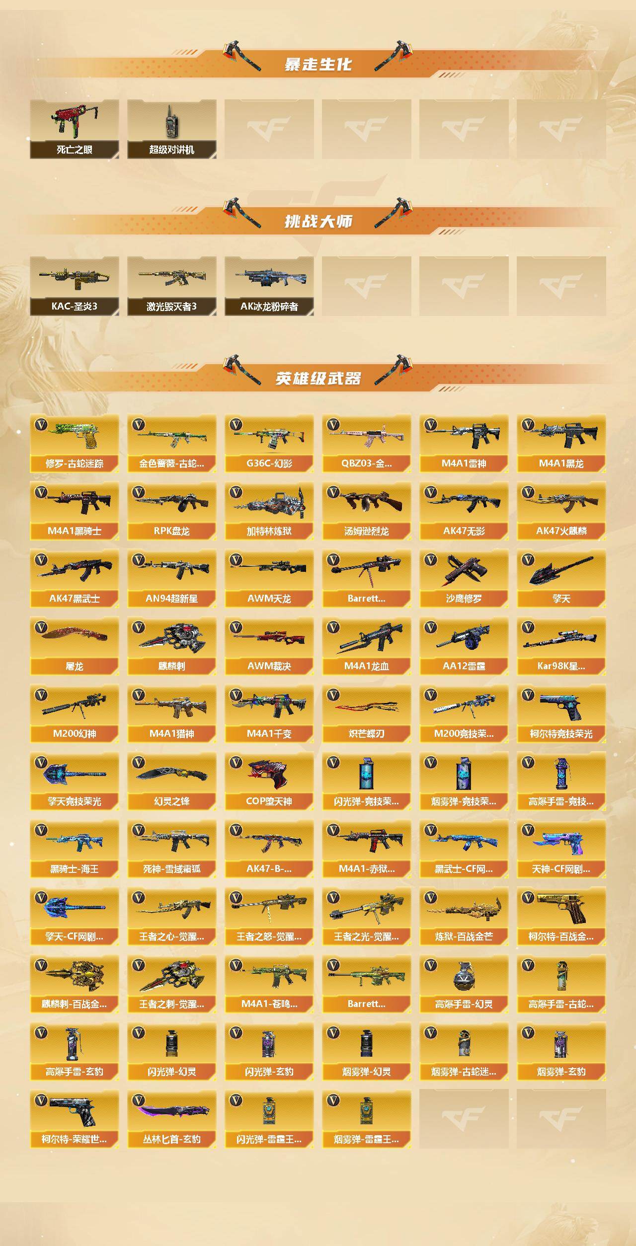 【英雄级武器】:M4A1-千变,AK47-火麒麟*2,M4A1-黑龙,M4A1-雷神*2,M4A1-黑骑士*2,AK47-无影,AK47-黑武士,AN94-超新星,M4A1-龙血*2,G36C-幻影,金色蔷薇-古蛇迷踪,死神-雪域霜狐,QBZ03-金色蔷薇,M4A1-猎神,王者之心-觉醒版,AK47-B-战神,黑骑士-海王,黑武士-CF网剧冠军*2,AW