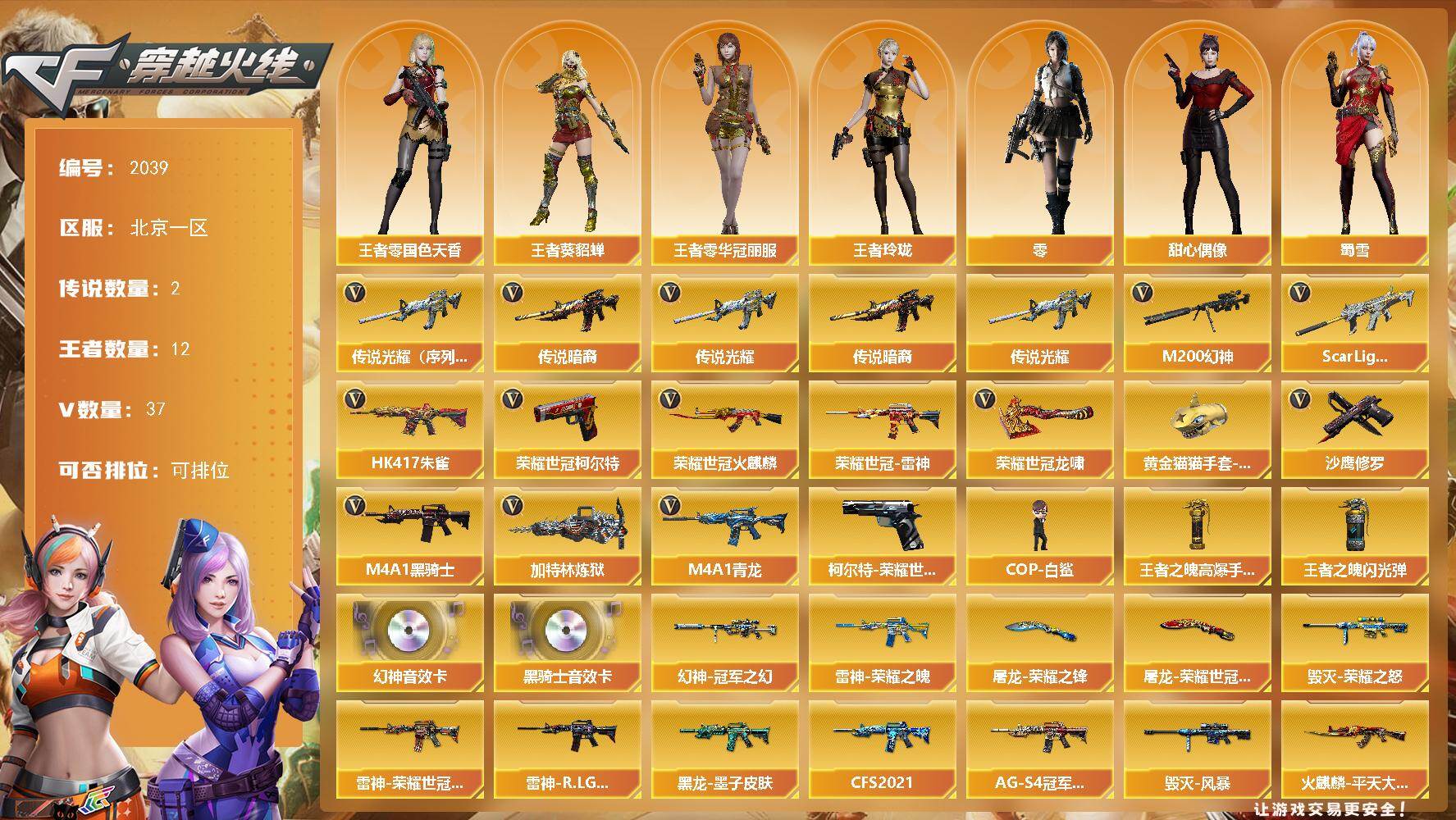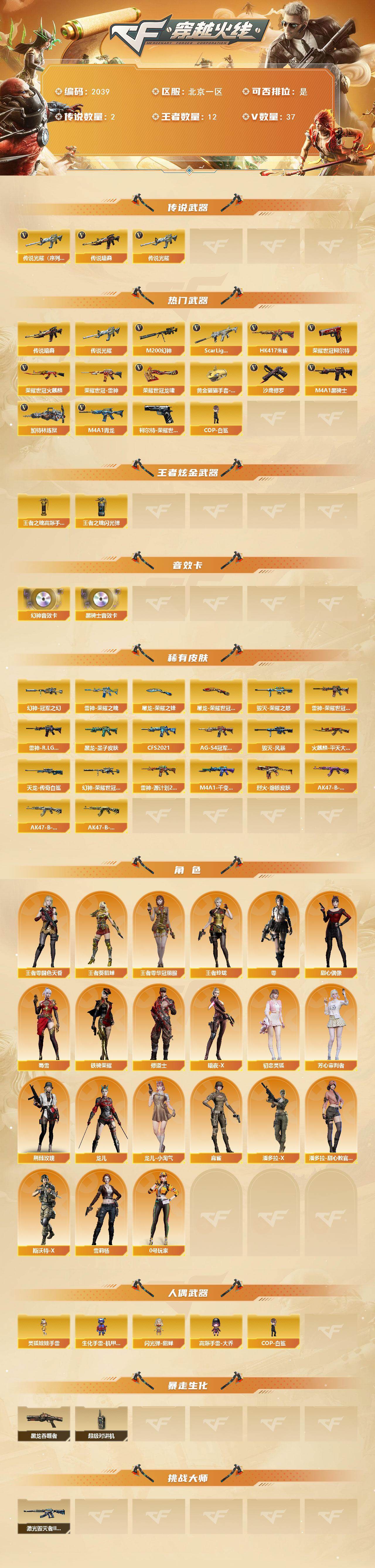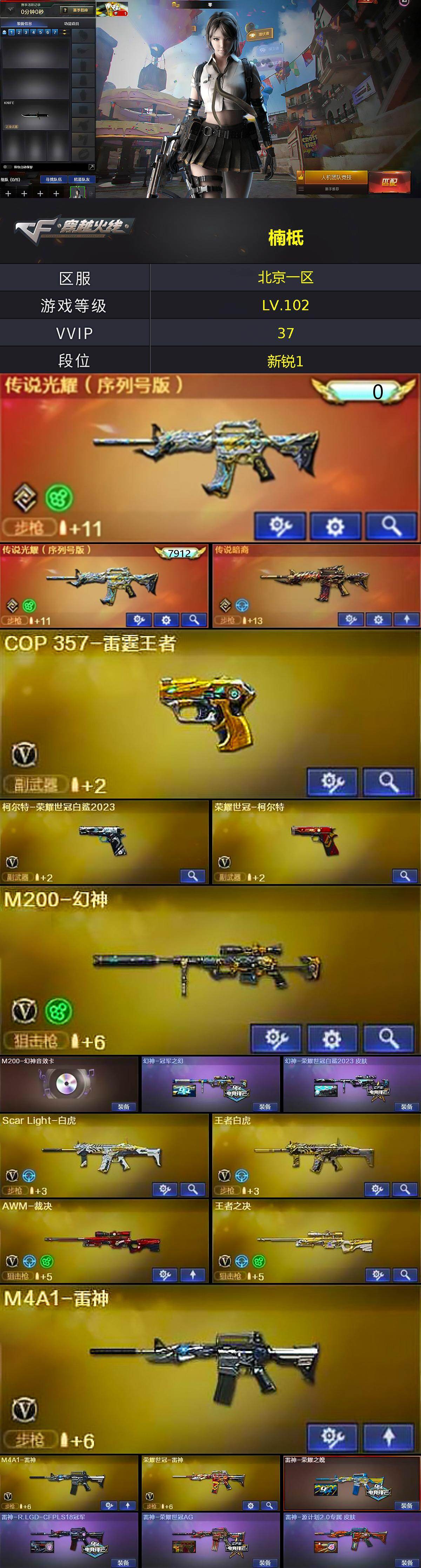 [16665656]北京一区-45V-12王者武器数-0炫金武器数 【传说武器】:传说光耀(序列号版),传说光耀,传说暗裔 【热门武器】:传说光耀,传说暗裔,Scar Light-白虎,HK417-朱雀,M4A1-青龙,M200-幻神,柯尔特-荣耀世冠白鲨2023,荣耀世冠-火麒麟,荣耀世冠-雷神,荣耀世冠-柯尔特,M4A1-黑骑士*2,加特林-炼狱,COP-白鲨,沙鹰-修罗,荣耀世冠-龙啸,黄金猫猫手套-白鲨 【王者炫金武器】:王者之魄高爆手雷,王者之魄闪光弹*2 【音效卡】:M200-幻神音效卡,M4A1-黑骑士音效卡 【皮肤】:幻神-冠军之幻,幻神-荣耀世冠白鲨2023 皮肤,雷神-荣耀之魄,雷神-R.LGD-CFPLS18冠军,雷神-荣耀世冠AG,雷神-源计划2.0专属 皮肤,火麒麟-平天大圣,毁灭-荣耀之怒,毁灭-风暴,M4A1-千变-孔明皮肤,黑龙-墨子皮肤,黑骑士-CFS2021,黑骑士-AG-S4冠军典藏,烈火-熔核皮肤,AK47-B-常胜将军-曹操*2,AK47-B-常胜将军-刘备*2,AK47-B-常胜将军-孙权,AWM-天龙-传奇白鲨,屠龙-荣耀之锋,屠龙-荣耀世冠AG 【角色】:零,王者零-华冠丽服,王者-零-国色天香,王者-葵-貂蝉,王者玲珑,修道士,暗夜-X,初恋灵狐,芳心审判者,荆棘玫瑰,0号玩家,龙儿,龙儿-小淘气,麻雀,潘多拉-X,潘多拉-甜心教官,斯沃特-X,甜心偶像,蜀雪,铁骑荣耀,雪莉杨 【人偶武器】:COP-白鲨,生化手雷-机甲核心,闪光弹-貂蝉,高爆手雷-大乔,灵狐娃娃手雷 【暴走生化】:黑龙吞噬者,超级对讲机 【挑战大师】:激光毁灭者III-白马银枪 【英雄级武器】:M4A1-黑龙,M4A1-雷神*2,M4A1-黑骑士*2,M4A1-青龙,HK417-朱雀,Scar Light-白虎,黑骑士-海王,王者白虎-觉醒版,荣耀世冠-火麒麟,荣耀世冠-雷神,Barrett-极光,AWM-裁决,M200-幻神,Barrett-朱雀,王者之决-觉醒版,加特林-炼狱,炼狱-风暴,沙鹰-修罗,沙鹰-天神*5,COP 357-雷霆王者-觉醒版,柯尔特-荣耀世冠白鲨2023,荣耀世冠-柯尔特,屠龙*2,擎天*3,荣耀世冠-龙啸,王者之锋-觉醒版,王者之啸-觉醒版,王者之击-觉醒版,闪光弹-雷霆王者-觉醒版,烟雾弹-雷霆王者-觉醒版,M4A1-赤狱骑士 【道具