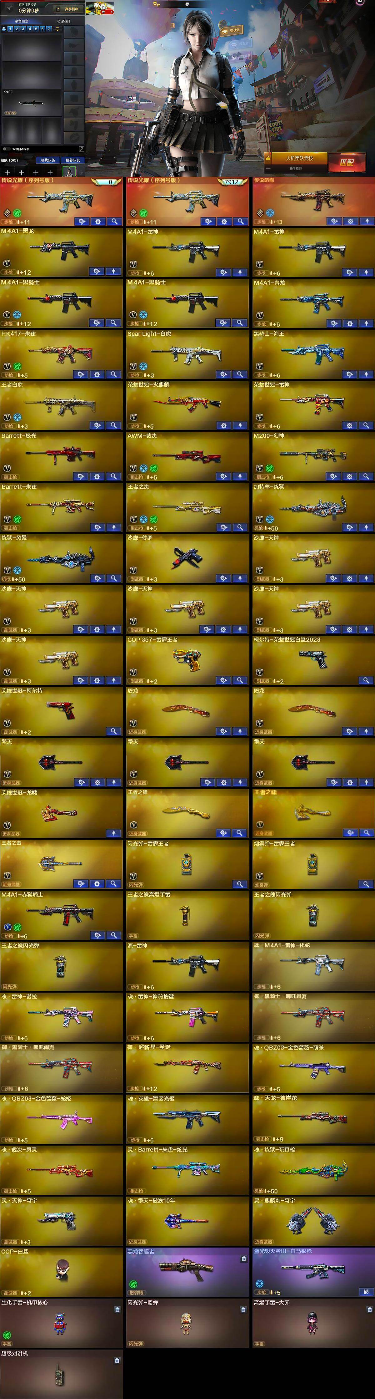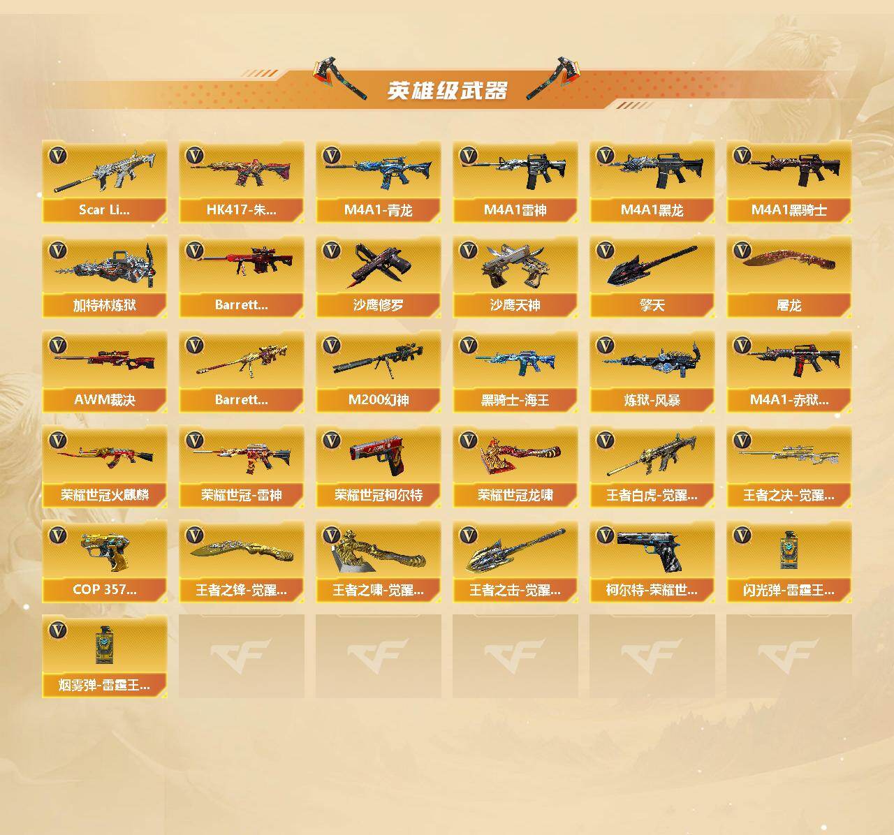【英雄级武器】:M4A1-黑龙,M4A1-雷神*2,M4A1-黑骑士*2,M4A1-青龙,HK417-朱雀,Scar Light-白虎,黑骑士-海王,王者白虎-觉醒版,荣耀世冠-火麒麟,荣耀世冠-雷神,Barrett-极光,AWM-裁决,M200-幻神,Barrett-朱雀,王者之决-觉醒版,加特林-炼狱,炼狱-风暴,沙鹰-修罗,沙鹰-天神*5,COP 357-雷霆王者-觉醒版,柯尔特-荣耀世冠白鲨2023,荣耀世冠-柯尔特,屠龙*2,擎天*3,荣耀世冠-龙啸,王者之锋-觉醒版,王者之啸-觉醒版,王者之击-觉醒版,闪光弹-雷霆王者-觉醒版,烟雾弹-雷霆王者-觉醒版,M4A1-赤狱骑士