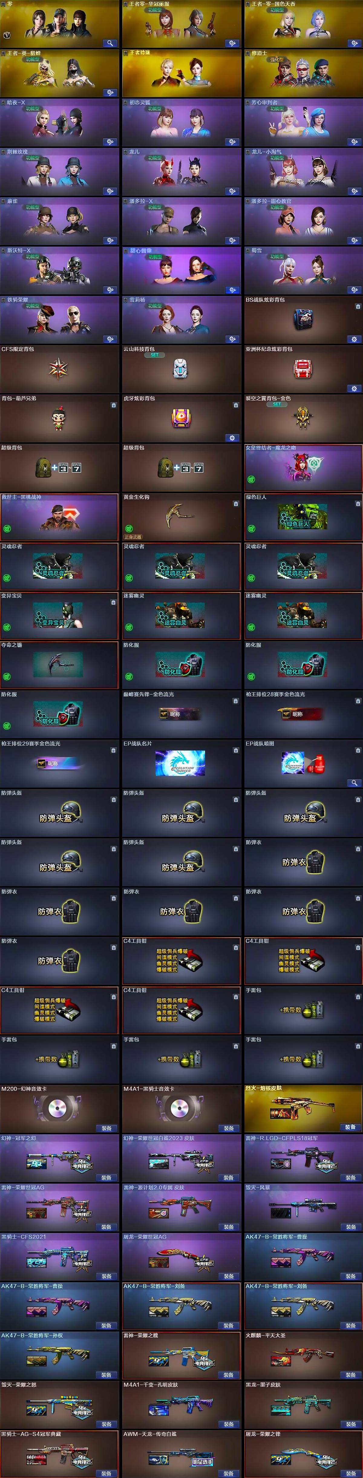 【皮肤】:幻神-冠军之幻,幻神-荣耀世冠白鲨2023 皮肤,雷神-荣耀之魄,雷神-R.LGD-CFPLS18冠军,雷神-荣耀世冠AG,雷神-源计划2.0专属 皮肤,火麒麟-平天大圣,毁灭-荣耀之怒,毁灭-风暴,M4A1-千变-孔明皮肤,黑龙-墨子皮肤,黑骑士-CFS2021,黑骑士-AG-S4冠军典藏,烈火-熔核皮肤,AK47-B-常胜将军-曹操*2,AK47-B-常胜将军-刘备*2,AK47-B-常胜将军-孙权,AWM-天龙-传奇白鲨,屠龙-荣耀之锋,屠龙-荣耀世冠AG