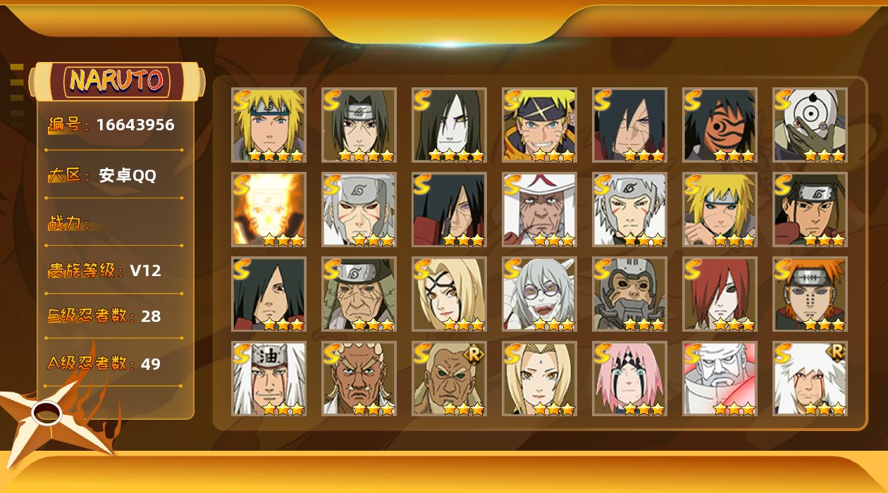 [16643956] VIP12,1210W战力,S忍28个,A忍49个,通灵熊猫,螃蟹,三尾。神威卡卡西88片,无72片。满级霸体,时空间。多点券A