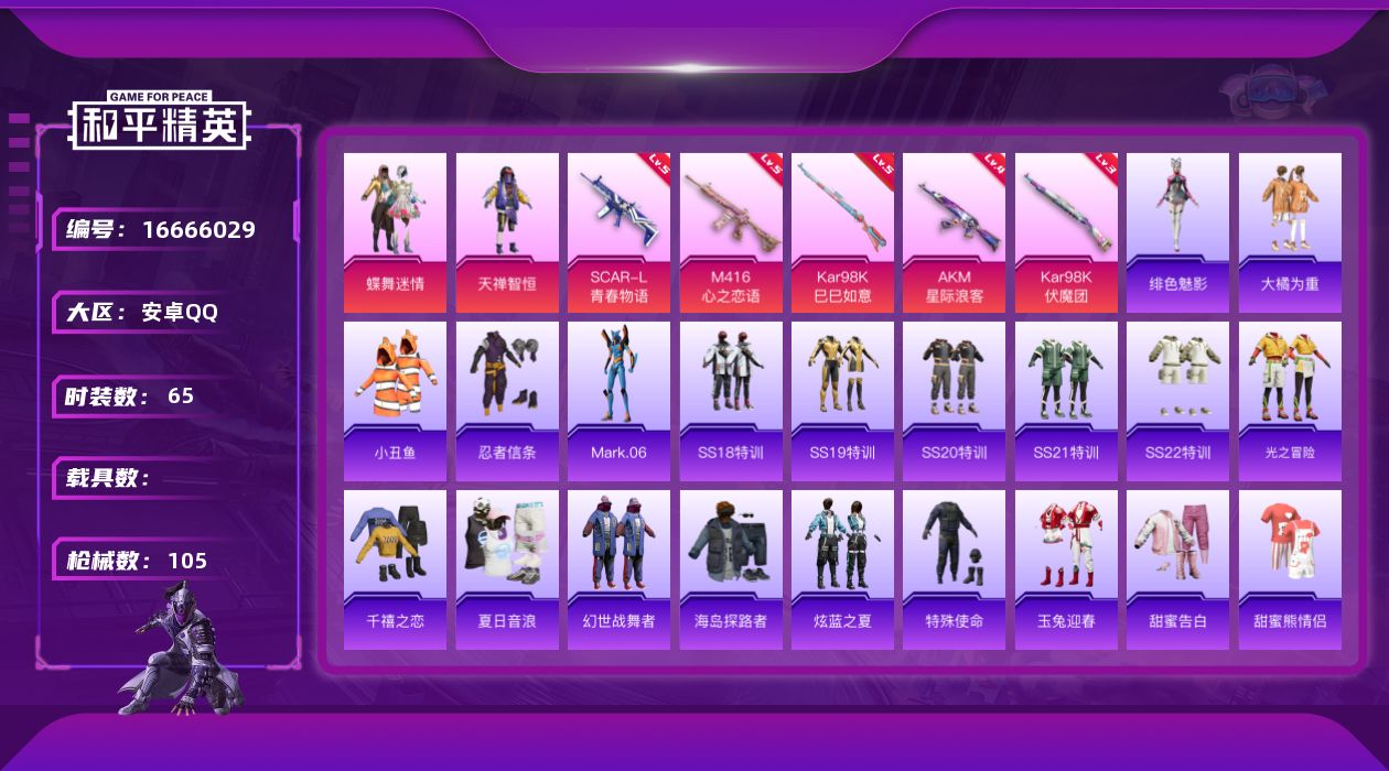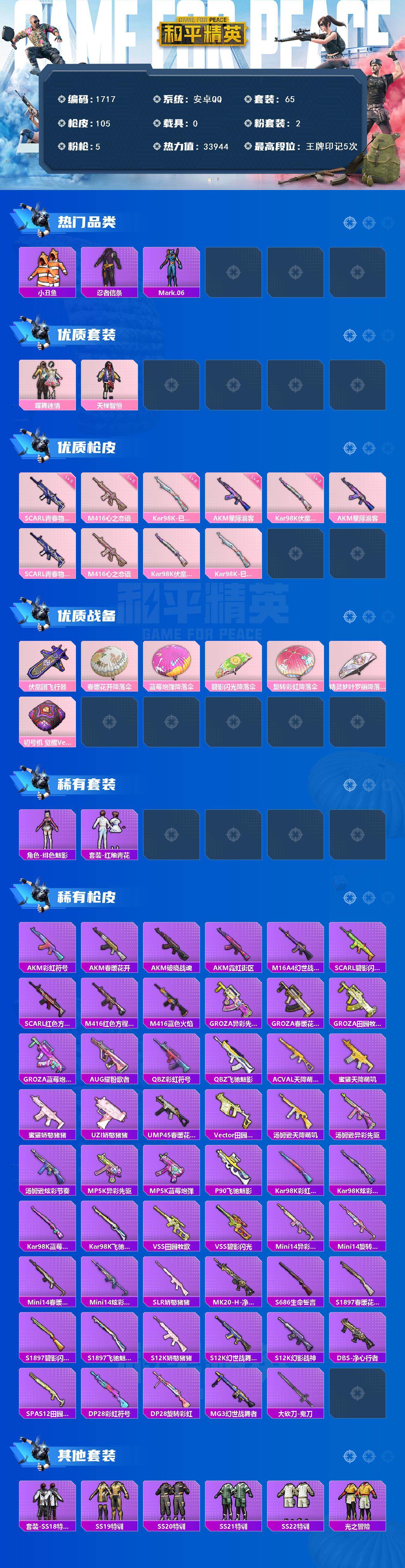 [16666029]【1717】安卓 手Q-2粉装-5特效枪-0载具-1粉色飞行器-33944热力值-5王牌印记-65套装-105枪皮 【热门品类】:套装-小丑鱼,套装-忍者信条,角色-Mark.06 【粉色套装】:粉装-蝶舞迷情,粉装-天禅智恒 【粉色枪皮等级】:AKM-星际浪客(四级),SCAR-L-青春物语(五级),M416-心之恋语(五级),Kar98K-伏魔团(三级),Kar98K-巳巳如意(五级) 【粉色枪皮】:AKM-星际浪客,SCAR-L-青春物语,M416-心之恋语,Kar98K-伏魔团,Kar98K-巳巳如意 【粉色飞行器】:伏魔团飞行器 【粉色降落伞】:春暖花开降落伞,蓝莓炮弹降落伞,碧影闪光降落伞,旋转彩虹降落伞,精灵梦叶罗丽降落伞,初号机 觉醒Ver.降落伞 【稀有套装】:角色-绯色魅影,套装-红釉青花 【稀有枪皮】:AKM-彩虹符号,AKM-春暖花开,AKM-破晓战魂,AKM-霓虹街区,M16A4-幻世战舞者,SCAR-L-碧影闪光,SCAR-L-红色方程式,M416-红色方程式,M416-蓝色火焰,GROZA-异彩先驱,GROZA-春暖花开,GROZA-田园牧歌,GROZA-蓝莓炮弹,AUG-耀粉歌者,QBZ-彩虹符号,QBZ-飞驰魅影,AC-VAL-天降萌叽,蜜獾-天降萌叽,蜜獾-娇憨猪猪,UZI-娇憨猪猪,UMP45-春暖花开,Vector-田园牧歌,汤姆逊-天降萌叽,汤姆逊-异彩先驱,汤姆逊-炫彩节奏,MP5K-异彩先驱,MP5K-蓝莓炮弹,P90-飞驰魅影,Kar98K-彩虹符号,Kar98K-炫彩节奏,Kar98K-蓝莓炮弹,Kar98K-飞驰魅影,VSS-田园牧歌,VSS-碧影闪光,Mini14-异彩先驱,Mini14-旋转彩虹,Mini14-春暖花开,Mini14-炫彩节奏,SLR-娇憨猪猪,MK20-H-净心行者,S686-生命誓言,S1897-春暖花开,S1897-碧影闪光,S1897-飞驰魅影,S12K-娇憨猪猪,S12K-幻世战舞者,S12K-幻影战神,DBS-净心行者,SPAS-12-田园牧歌,DP-28-彩虹符号,DP-28-旋转彩虹,MG3-幻世战舞者,大砍刀-鬼刀 【其他套装】:套装-SS18特训,套装-SS19特训,套装-SS20特训,套装-SS21特训,套装-SS22特训,套装-光之冒险,套装-千禧之恋,套装-夏日音浪,