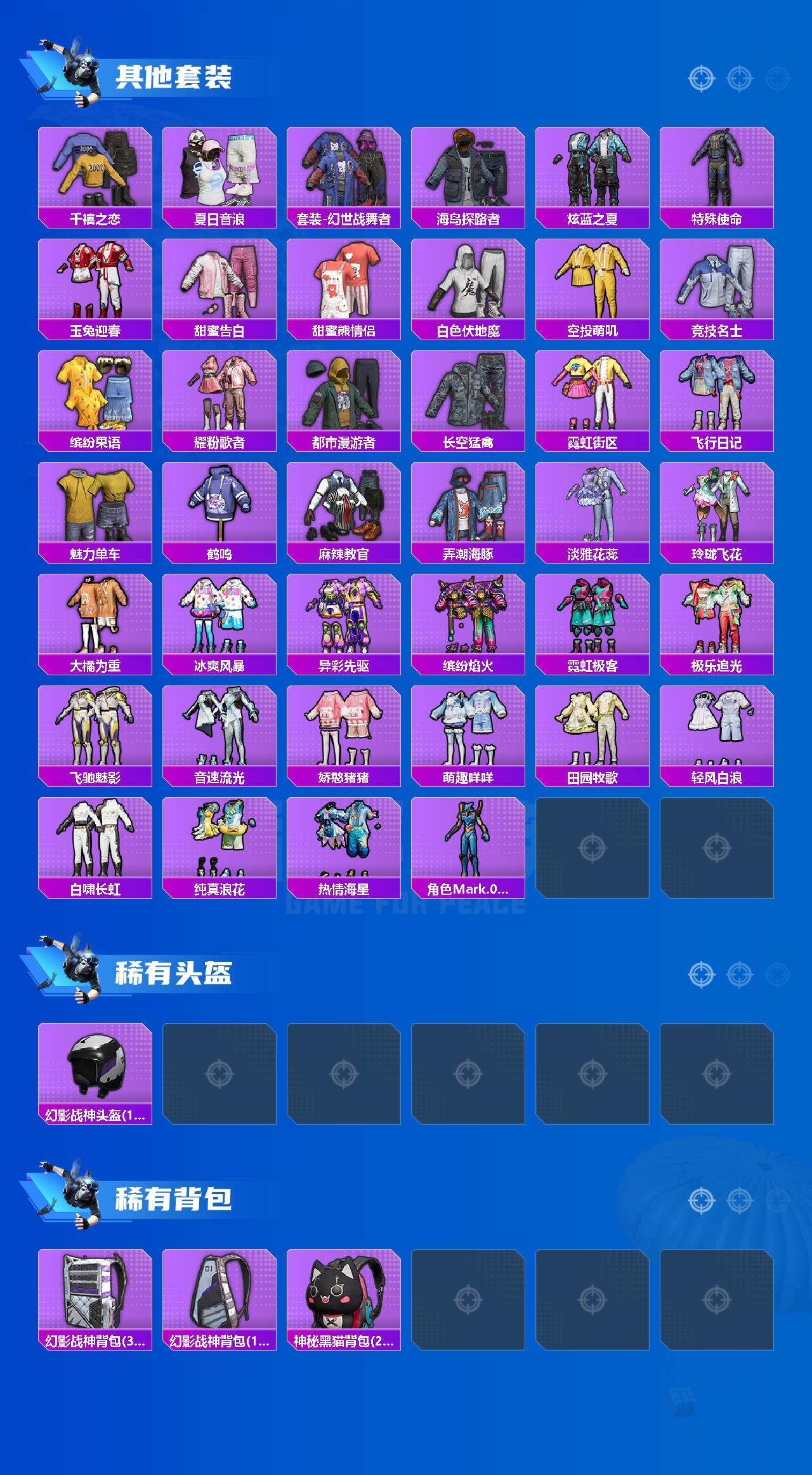 - [12031622]1粉装 7特效枪 10印记 可二次 可修改实名 优质装备:AMR炫光之旅,AKM绿萝繁花,SCAR-L-锦绣绵绵,七级AMR-炫光之旅,GROZA-镜光银凌,AUG-暖羊咩咩,雪月幻音,Kar98K-巳巳如意 热门装扮:呆萌铁蟹 稀有枪皮:DP-28-豹影疾电 五级特效枪:五级GROZA-镜光银凌,五级Kar98K-巳巳如意,五级DP-28-豹影疾电,五级AUG-暖羊咩咩,五级SCAR-L-锦绣绵绵,五级AKM-绿萝繁花 紫色装扮:田园牧歌,轻风白浪,SS22特训,飞狐塔尔斯,SS23特训,幻彩翩翩,妙红点点,娇憨猪猪,萌趣咩咩,SS21特训,熠彩粉晶,SS31特训套装,人气偶像,军械专家,冰川特警,SS30特训套装,云朵鹅,雪绒豹,SS33特训套装,青涩时光,顶瓜瓜,SS20特训,酒红色名流,长空猛禽,雪山精英,雪鹰学院,霓虹街区,青年教官,缤纷果语,耀眼新星,荣耀,蓝彩潮人,蓝色守护者,蓝色运动,虎虎生威吉莉,飞行日记,龙腾端午,骑行爱好者,魅力单车,鹤鸣,麻辣教官,黄色伏地魔,黄色名流,黄色运动,黑色伏地魔,龙的传人,龟仙人,冰河战士,龙魂突击队,蝶变,柠萌假日,橘黑制服,海岛探路者,涂山之恋,深蓝色名流,清新柠檬,夏日倾情,完美偶像,帅气教官,幻世战舞者,湖蓝色名流,绮丽涂鸦,甜蜜菠萝,白色伏地魔,破蛋小黄鸡,空岛之星,空投萌叽,竞技达人朋克,红色运动,王牌教练,牛气冲天,猛禽,特战英豪,猎鹰,SS29特训,星途旅人,SS28特训,鱼渊荷华,玉兔迎春,燕燕于飞,巳巳如意,森林游猎者,竞技名士,许七安,怀庆长公主,惊鸿侠骨,SS24特训(SS24特训套装),SS25特训,锦衣飞扬,SS27特训,Alan Walker,浪漫天命,SS26特训,智谋强哥,精神漫游,大橘大利,春日漫步,SS32特训服(SS32特训套装),猎影月神,绯格组合,萌黄之夏,白糯汤圆,冰冻风暴,光之冒险,青羽突袭者 优质战备:星途旅人降落伞,临安公主降落伞,炫光之旅降落伞,纯梦嫁纱降落伞