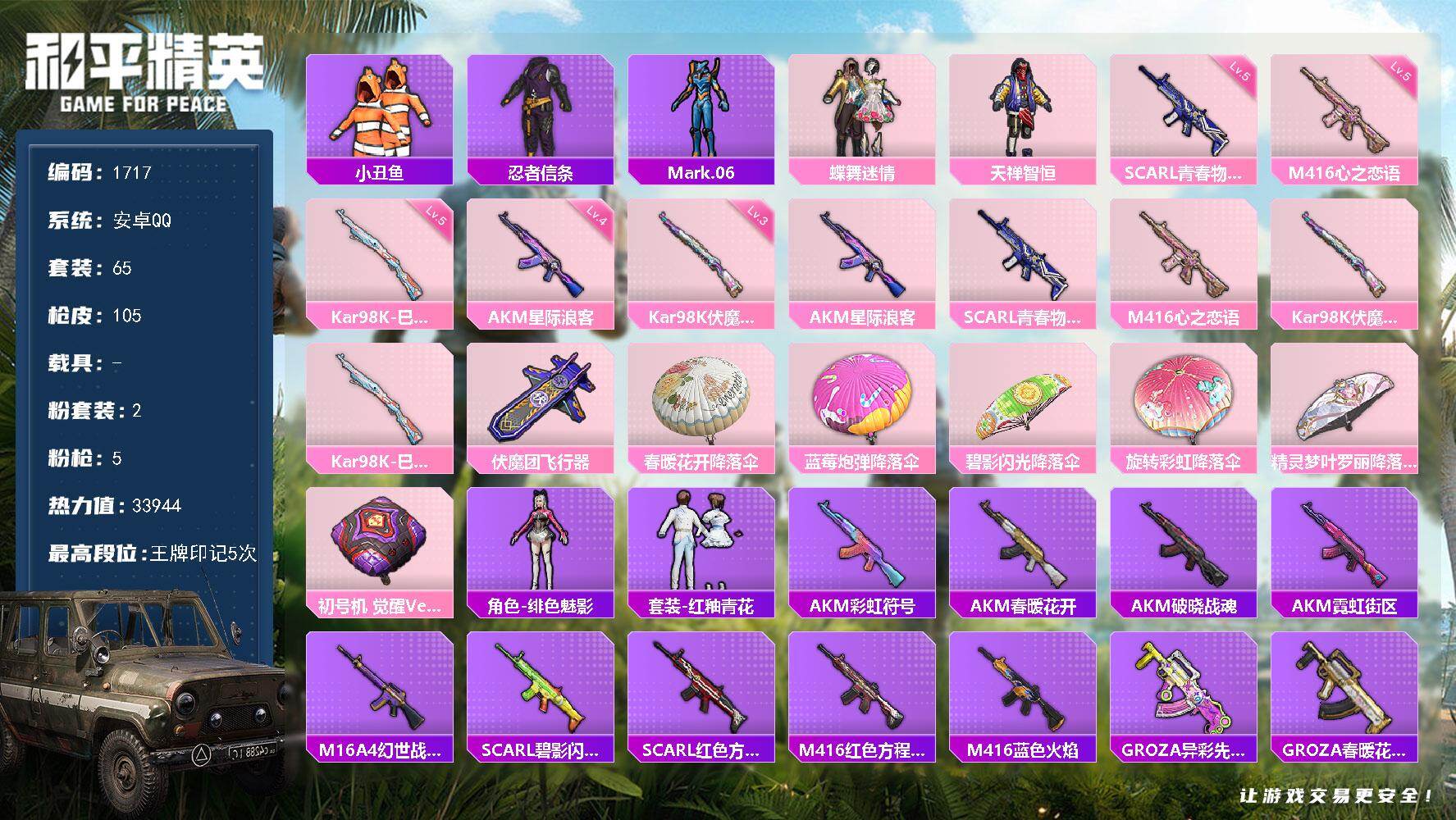 [16666029]【1717】安卓 手Q-2粉装-5特效枪-0载具-1粉色飞行器-33944热力值-5王牌印记-65套装-105枪皮