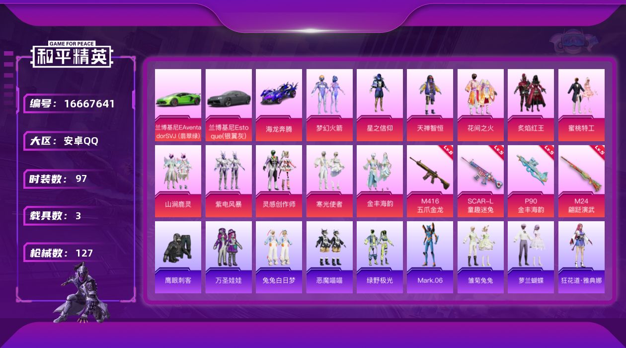[16667641]【特价出售/店主推荐】安卓 手Q-11粉装-4特效枪-3载具-1粉色飞行器-44428热力值-5王牌印记-97套装-127枪皮 【热门品类】:粉装-梦幻火箭,角色-Mark.06 【粉色套装】:粉装-梦幻火箭,粉装-星之信仰,粉装-天禅智恒,粉装-花间之火,粉装-炙焰红王,粉装-蜜桃特工,粉装-山涧鹿灵,粉装-紫电风暴,粉装-灵感创作师,粉装-寒光使者,粉装-金丰海韵 【粉色枪皮等级】:SCAR-L-童趣迷兔(五级),M416-五爪金龙(六级),P90-金丰海韵(五级),M24-翩跹演武(五级) 【粉色载具】:兰博基尼Aventador SVJ(翡翠绿),兰博基尼Estoque(银翼灰),海龙奔腾 【粉色枪皮】:SCAR-L-童趣迷兔,M416-五爪金龙,P90-金丰海韵,M24-翩跹演武 【粉色飞行器】:齐天大圣飞行器 【粉色降落伞】:梦幻火箭降落伞,童趣迷兔降落伞,暗夜玫瑰降落伞,恐龙拽拽降落伞,幻梦音符降落伞,冷魅冰骑降落伞,甜梦小狐降落伞,环太平洋降落伞,灵感创作师降落伞,彩虹甜喵降落伞,金丰海韵降落伞 【稀有套装】:套装-雏菊兔兔,套装-萝兰蝴蝶,角色-狂花道·雅典娜 【稀有枪皮】:AKM-彩虹符号,AKM-影袭,AKM-灼热熔岩,AKM-王牌投手,AKM-环太平洋,AKM-破晓战魂,AKM-虎虎生威,AKM-霓虹街区,AKM-龙的传人,M16A4-甜心亚梦,SCAR-L-炫彩节奏,SCAR-L-玉兔迎春,SCAR-L-红色方程式,M416-暗夜行者,M416-糯团青竹,M416-红色方程式,GROZA-异彩先驱,GROZA-影袭,GROZA-田园牧歌,AUG-圣光天使,AUG-耀粉歌者,QBZ-飞驰魅影,M762-天降萌叽,M762-枪炮玫瑰,M762-瑞龙福将,Mk47-妙红点点,Mk47-林间仙鹿,Mk47-洛神天依,G36C-炙焰牛王,AC-VAL-天降萌叽,AC-VAL-灵感创作师,AC-VAL-甜心亚梦,蜜獾-天降萌叽,蜜獾-娇憨猪猪,UZI-娇憨猪猪,UZI-影袭,UZI-炫彩节奏,UZI-红色方程式,UMP45-生命誓言,UMP45-蓝色火焰,Vector-田园牧歌,汤姆逊-异彩先驱,汤姆逊-林间仙鹿,汤姆逊-炫彩节奏,汤姆逊-环太平洋,野牛-夜灯,MP5K-异彩先驱,MP5K-甜蜜誓约,P90-筑梦精灵,P90-飞驰魅影,Kar98K-