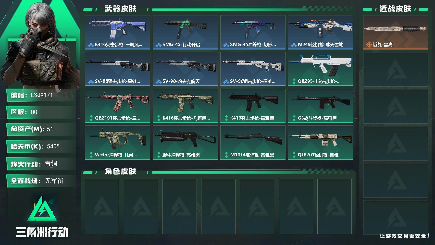 [16667706]【特价出售/店主推荐】51m总资产-5405k哈伏币-35烽火等级-青铜-1战场等级-无军衔 【近战皮肤】:近战-黑鹰 【稀有外观】:K416突击步枪-一帆风顺,SMG-45-行动开启,SMG-45冲锋枪-幻影结构,M249轻机枪-冰天雪地,SV-98狙击步枪-星链科技,SV-98狙击步枪-哈夫克航天,SV-98狙击步枪-精英联盟 【普通外观】:QBZ95-1突击步枪-海色,QBZ191突击步枪-三角洲力量,K416突击步枪-几何迷彩,K416突击步枪-高雅黑,G3战斗步枪-高雅黑,Vector冲锋枪-几何迷彩,野牛冲锋枪-高雅黑,M1014霰弹枪-高雅黑,QJB201轻机枪-典雅