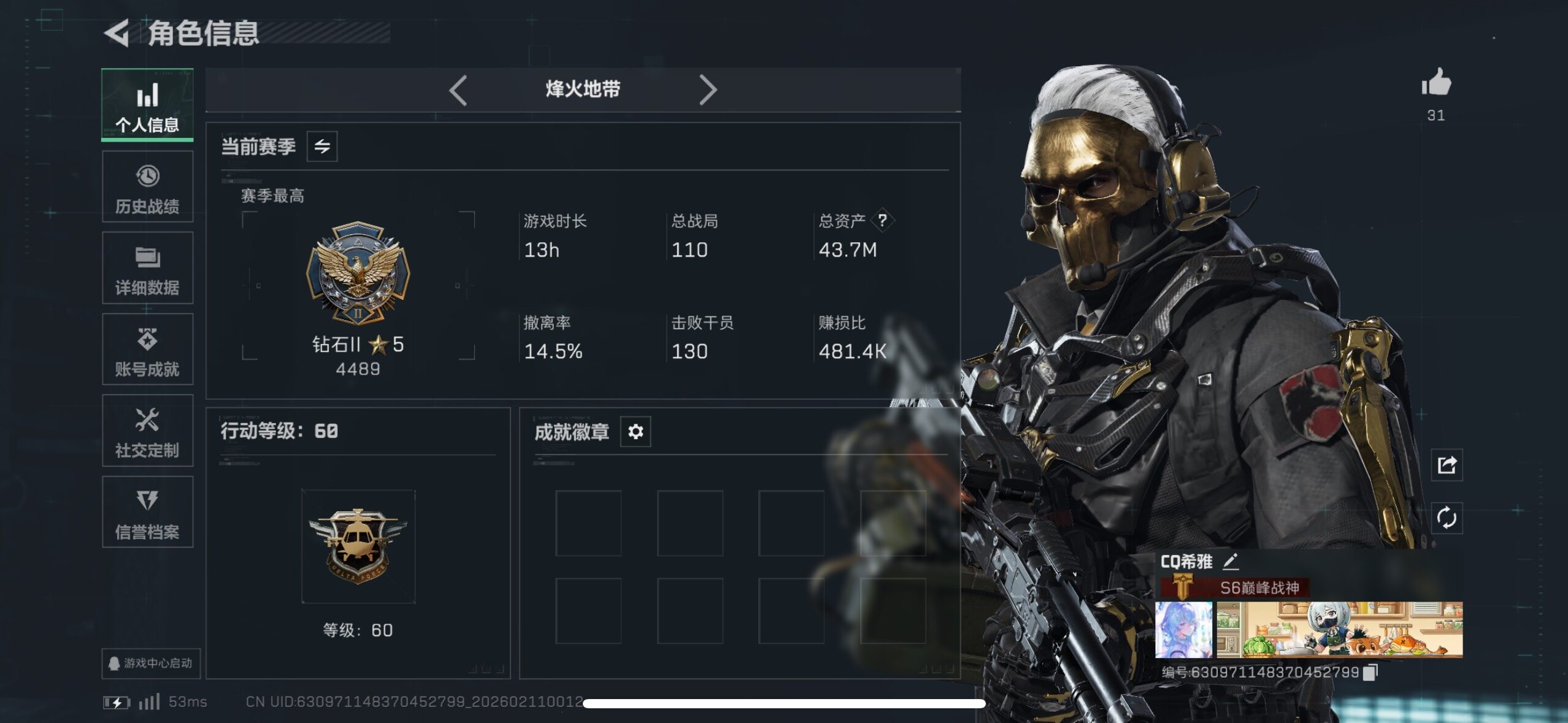[16667779]【特价出售/店主推荐】43m总资产-280k哈伏币-60烽火等级-钻石-5战场等级-无军衔