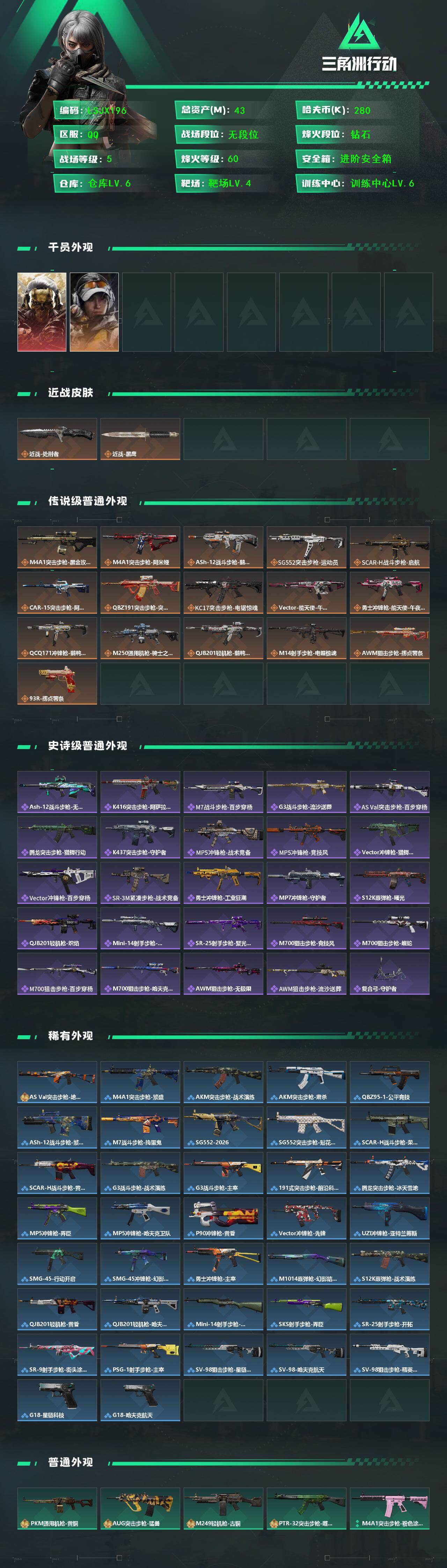 [16667779]【特价出售/店主推荐】43m总资产-280k哈伏币-60烽火等级-钻石-5战场等级-无军衔 【干员外观】:红狼-蚀金玫瑰,露娜-金牌射手 【近战皮肤】:近战-处刑者,近战-黑鹰 【传说外观】:M4A1突击步枪-蚀金玫瑰,M4A1突击步枪-阿米娅,ASh-12战斗步枪-鹅鸭杀,SG552突击步枪-运动员,SCAR-H战斗步枪-启航,CAR-15突击步枪-阿米娅,腾龙突击步枪-捞点薯条,KC17突击步枪-电锯惊魂,Vector冲锋枪-能天使-午夜邮差,勇士冲锋枪-能天使-午夜邮差,QCQ171冲锋枪-鹅鸭杀,M250通用机枪-骑士之心,QJB201轻机枪-鹅鸭杀,M14射手步枪-电锯惊魂,AWM狙击步枪-捞点薯条,93R-捞点薯条 【史诗外观】:ASh-12战斗步枪-无极限,K416突击步枪-阿萨拉特攻,M7战斗步枪-百步穿杨,G3战斗步枪-流沙送葬,AS Val突击步枪-百步穿杨,腾龙突击步枪-猎鳄行动,K437突击步枪-守护者,MP5冲锋枪-战术竞备,MP5冲锋枪-竞技风,Vector冲锋枪-猎鳄行动,Vector冲锋枪-百步穿杨,SR-3M紧凑突击步枪-战术竞备,勇士冲锋枪-工业狂潮,MP7冲锋枪-守护者,S12K霰弹枪-曙光,QJB201轻机枪-炽焰,Mini-14射手步枪-守护者,SR-25射手步枪-聚光灯,M700狙击步枪-竞技风,M700狙击步枪-蝮蛇,M700狙击步枪-百步穿杨,M700狙击步枪-哈夫克警备,AWM狙击步枪-无极限,AWM狙击步枪-流沙送葬,复合弓-守护者 【稀有外观】:AS Val突击步枪-地平线,M4A1突击步枪-繁盛,AKM突击步枪-战术演练,AKM突击步枪-肃杀,QBZ95-1突击步枪-公平竞技,ASh-12战斗步枪-繁盛,M7战斗步枪-捣蛋鬼,SG552突击步枪-2026,SG552突击步枪-贴花艺术,SCAR-H战斗步枪-荣耀列队,SCAR-H战斗步枪-黄昏,G3战斗步枪-战术演练,G3战斗步枪-主宰*2,腾龙突击步枪-前沿科技,腾龙突击步枪-冰天雪地,MP5冲锋枪-弄臣,MP5冲锋枪-哈夫克卫队,P90冲锋枪-黄昏,Vector冲锋枪-先锋,UZI冲锋枪-亚特兰蒂斯,SMG-45-行动开启,SMG-45冲锋枪-幻影结构,勇士冲锋枪-主宰,M1014霰弹枪-幻影结构,S12K霰弹枪-战术演练,QJB201轻机枪-黄昏,QJB