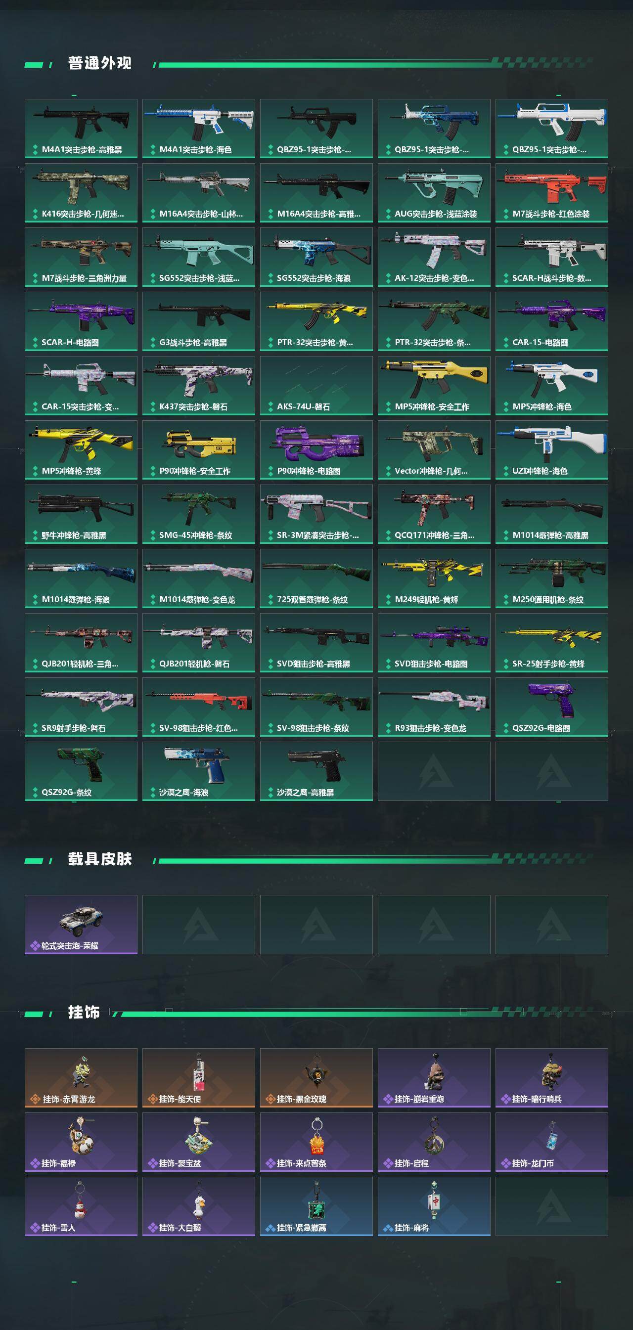 【稀有外观】:AS Val突击步枪-地平线,M4A1突击步枪-繁盛,AKM突击步枪-战术演练,AKM突击步枪-肃杀,QBZ95-1突击步枪-公平竞技,ASh-12战斗步枪-繁盛,M7战斗步枪-捣蛋鬼,SG552突击步枪-2026,SG552突击步枪-贴花艺术,SCAR-H战斗步枪-荣耀列队,SCAR-H战斗步枪-黄昏,G3战斗步枪-战术演练,G3战斗步枪-主宰*2,腾龙突击步枪-前沿科技,腾龙突击步枪-冰天雪地,MP5冲锋枪-弄臣,MP5冲锋枪-哈夫克卫队,P90冲锋枪-黄昏,Vector冲锋枪-先锋,UZI冲锋枪-亚特兰蒂斯,SMG-45-行动开启,SMG-45冲锋枪-幻影结构,勇士冲锋枪-主宰,M1014霰弹枪-幻影结构,S12K霰弹枪-战术演练,QJB201轻机枪-黄昏,QJB