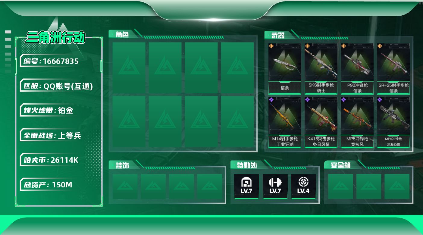[16667835]【特价出售/店主推荐】150m总资产-26114k哈伏币-60烽火等级-铂金-22战场等级-上等兵 【近战皮肤】:近战-信条,近战-黑鹰 【传说外观】:P90冲锋枪-信条,SKS射手步枪-骑士,SR-25射手步枪-信条 【史诗外观】:K416突击步枪-冬日风情,SCAR-H战斗步枪-囚徒,MP5冲锋枪-深海恐惧,MP5冲锋枪-竞技风,Vector冲锋枪-阿萨拉文明,QJB201轻机枪-炽焰,M14射手步枪-工业狂潮,SV-98狙击步枪-囚徒 【稀有外观】:MP5冲锋枪-星之彩,SG552突击步枪-天际线,AKM突击步枪-肃杀,K416突击步枪-一帆风顺,SG552突击步枪-2026,SG552突击步枪-贴花艺术,SCAR-H战斗步枪-荣耀列队,MP5冲锋枪-哈夫克卫队,SMG-45-行动开启,勇士冲锋枪-冰天雪地,M249轻机枪-冰天雪地,Mini-14射手步枪-荣耀列队,SR-25-行动开启 【普通外观】:M249轻机枪-古铜,M4A1突击步枪-粉色涂装,M4A1突击步枪-海色,QBZ95-1突击步枪-海浪,QBZ95-1突击步枪-海色,QBZ95-1突击步枪-2026,QBZ191突击步枪-三角洲力量,K416突击步枪-高雅黑,M16A4突击步枪-高雅黑,AUG突击步枪-浅蓝涂装,M7战斗步枪-红色涂装,SG552突击步枪-浅蓝涂装,SG552突击步枪-海浪,G3战斗步枪-高雅黑,PTR-32突击步枪-黄蜂,MP5冲锋枪-海色,Vector冲锋枪-几何迷彩,野牛冲锋枪-高雅黑,M1014霰弹枪-高雅黑,M249轻机枪-黄蜂,QJB201轻机枪-典雅,SVD狙击步枪-高雅黑,SR-25射手步枪-黄蜂,沙漠之鹰-海浪,沙漠之鹰-高雅黑,G17-2026 【载具外观】:轮式突击炮-荣耀 【挂饰】:挂饰-窃风密探,挂饰-赤霄游龙,挂饰-信条,挂饰-崩岩重炮,挂饰-福禄,挂饰-聚宝盆,挂饰-仪典匕首,挂饰-牛角,挂饰-紧急撤离*7,挂饰-麻将*5