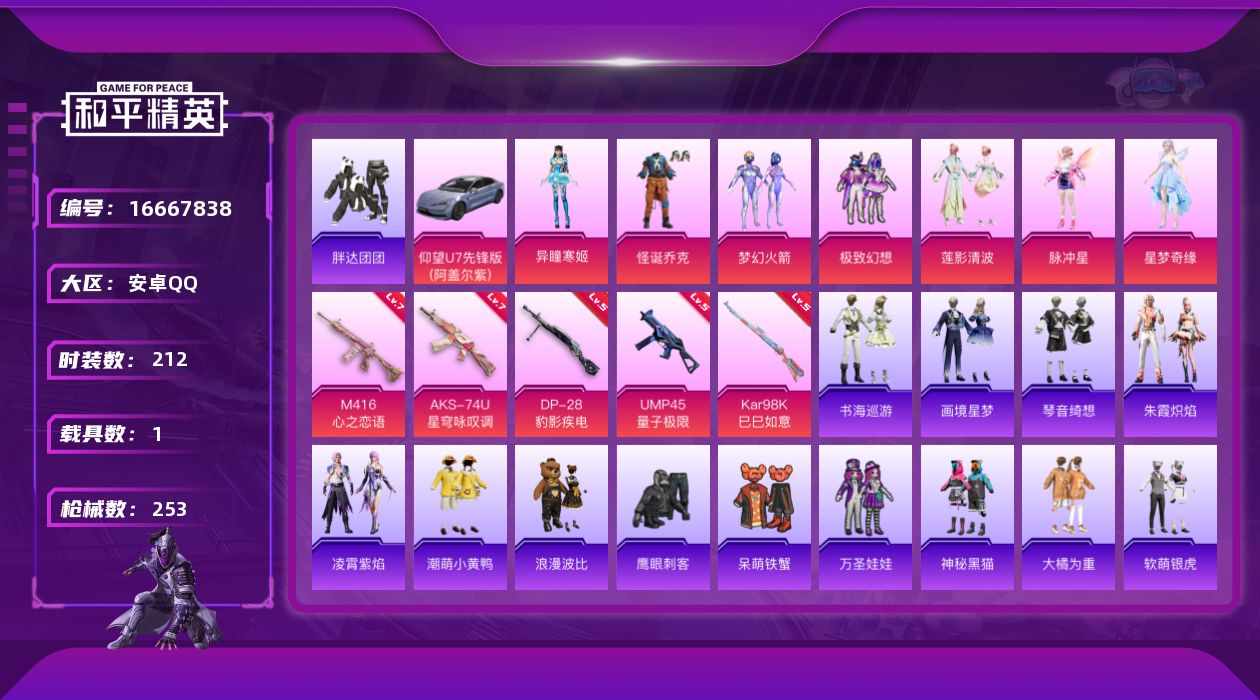 [16667838]自带点卷1000 活跃礼包里面没有领取【特价出售/店主推荐】安卓 手Q-7粉装-5特效枪-1载具-2粉色飞行器-80192热力值-14王牌印记-212套装-253枪皮【热门品类】:粉装-怪诞乔克,粉装-梦幻火箭,套装-浪漫天命,套装-小丑鱼,套装-胖达团团,旭日初心兜帽大衣,套装-龟仙人,套装-潮萌小黄鸭,套装-暗影哥特,套装-浪漫波比套装-粉红小猪【粉色套装】:粉装-怪诞乔克,粉装-梦幻火箭,粉装-极致幻想,粉装-莲影清波,角色-脉冲星,角色-星梦奇缘,角色-异瞳寒姬【粉色枪皮等级】:M416-心之恋语(七级),UMP45-量子极限(五级),AKS-74U-星穹咏叹调(七级),Kar98K-巳巳如意(五级),DP-28-豹影疾电(五级)【粉色载具】:仰望U7(阿盖尔紫)【粉色枪皮】:M416-心之恋语,UMP45-量子极限,AKS-74U-星穹咏叹调,Kar98K-巳巳如意,DP-28-豹影疾电【粉色飞行器】:电糖天使飞行器