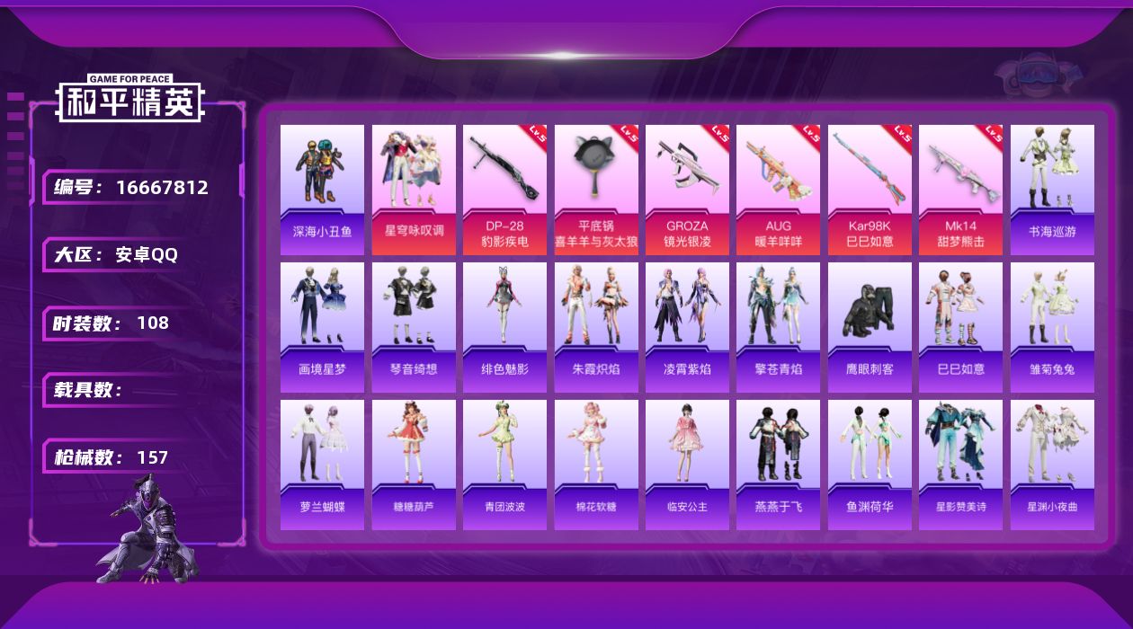 [16667812]【特价出售/店主推荐】安卓 手Q-1粉装-7特效枪-0载具-1粉色飞行器-41624热力值-6王牌印记-108套装-157枪皮 【热门品类】:套装-深海小丑鱼 【粉色套装】:粉装-星穹咏叹调 【粉色枪皮等级】:GROZA-镜光银凌(五级),AUG-暖羊咩咩(五级),AKS-74U-森灵之息(五级),Kar98K-巳巳如意(五级),Mk14-甜梦熊击(五级),DP-28-豹影疾电(五级),平底锅-喜羊羊与灰太狼(七级) 【粉色枪皮】:GROZA-镜光银凌,AUG-暖羊咩咩,AKS-74U-森灵之息,Kar98K-巳巳如意,Mk14-甜梦熊击,DP-28-豹影疾电,平底锅-喜羊羊与灰太狼 【粉色降落伞】:齐天大圣降落伞,星穹咏叹调降落伞,双重狂想降落伞,冷漠罗丽降落伞,喜羊羊与灰太狼降落伞,炫彩糖果降落伞 【稀有套装】:套装-巳巳如意,套装-雪国风尚,套装-炫彩糖果,套装-雏菊兔兔,套装-萝兰蝴蝶,套装-糖糖葫芦,套装-青团波波,套装-棉花软糖,角色-临安公主,套装-燕燕于飞,套装-鱼渊荷华,套装-星影赞美诗,套装-星渊小夜曲,套装-彩虹兔,套装-云朵鹅,套装-雪绒豹,角色-夜瞳黯灵,套装-朱霞炽焰,套装-凌霄紫焰,套装-擎苍青焰,角色-绯色魅影,套装-书海巡游,套装-画境星梦,套装-琴音绮想 【稀有枪皮】:AUG-冰晶雪宝,AKM-霓虹街区,SCAR-L-夜灯,SCAR-L-炫彩节奏,SCAR-L-小狗蛇点点,M416-蓝色火焰,GROZA-影袭,AUG-天降萌叽,AUG-幻影战神,AUG-耀粉歌者,QBZ-彩虹符号,M762-天降萌叽,M762-云朵鹅,M762-登顶巅峰,蜜獾-天降萌叽,ACE32-画境星梦,ARX-凌霄紫焰,UZI-啾咪啾咪,UZI-影袭,UZI-红色方程式,UZI-幻影飞狐,UMP45-夜灯,UMP45-生命誓言,汤姆逊-天降萌叽,汤姆逊-炫彩节奏,汤姆逊-耀粉歌者,MP5K-画境星梦,JS9-凌霄紫焰,P90-巳巳如意,Kar98K-影袭,M24-影袭,SKS-迅猛狂鲨,VSS-彩虹符号,Mini14-耀粉歌者,Mk14-治愈之星,M200-爆裂游戏,SVD-云朵鹅,M1加兰德-画境星梦,S686-巳巳如意,S1897-炫彩节奏,S12K-玩趣呆呆,S12K-夜灯,DBS-月影灵韵,AA12-G-炫光之旅,AA12-G-画境星梦,SPAS-