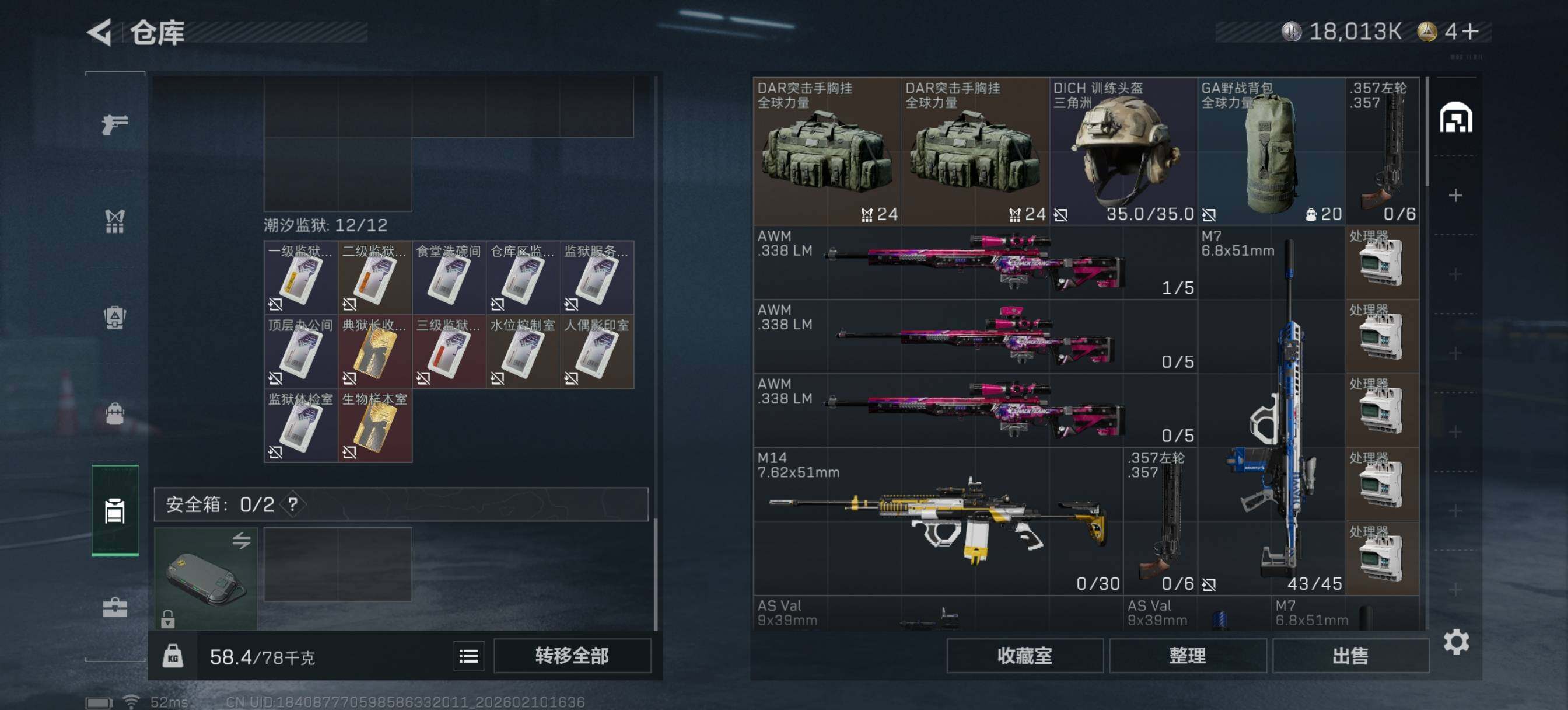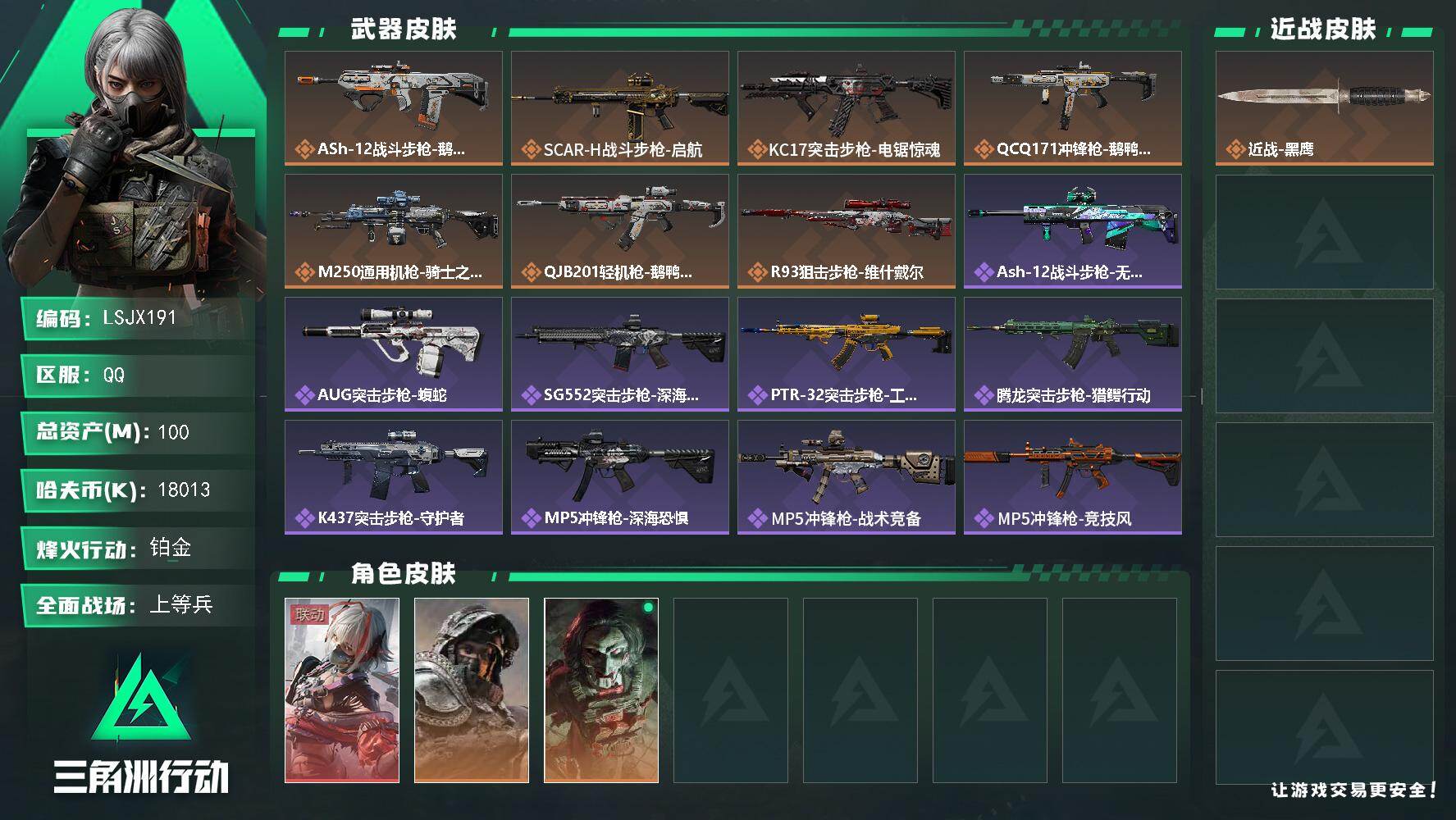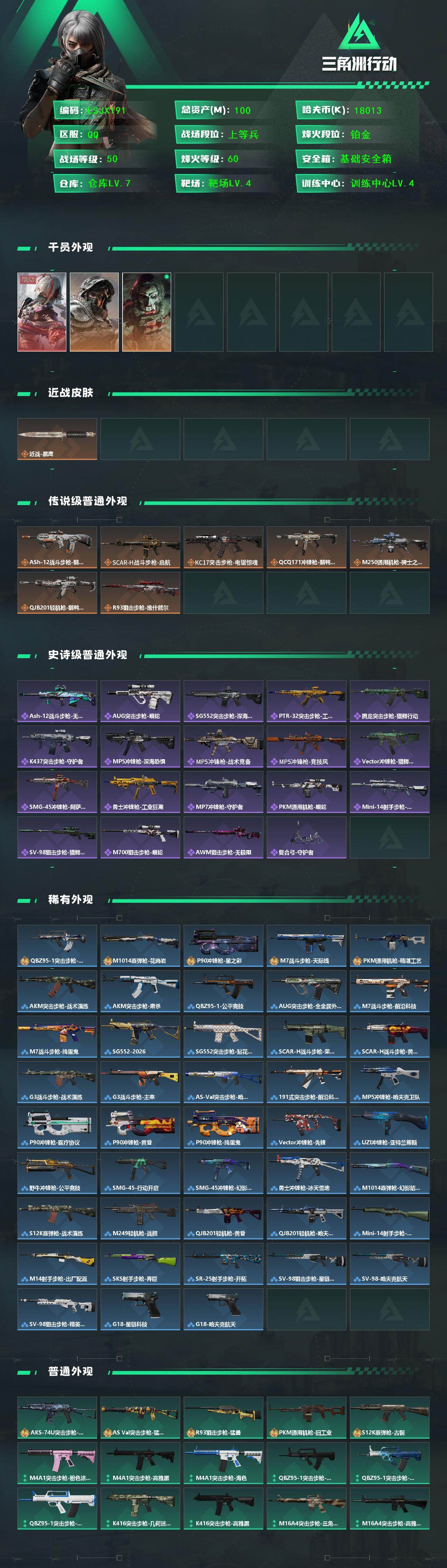 [16667915]【特价出售/店主推荐】100m总资产-18013k哈伏币-60烽火等级-铂金-50战场等级-上等兵 【干员外观】:骇爪-维什戴尔,深蓝-不破誓约,红狼-电锯惊魂 【近战皮肤】:近战-黑鹰 【传说外观】:ASh-12战斗步枪-鹅鸭杀,SCAR-H战斗步枪-启航,KC17突击步枪-电锯惊魂,QCQ171冲锋枪-鹅鸭杀,M250通用机枪-骑士之心,QJB201轻机枪-鹅鸭杀,R93狙击步枪-维什戴尔 【史诗外观】:ASh-12战斗步枪-无极限,AUG突击步枪-蝮蛇,SG552突击步枪-深海恐惧,PTR-32突击步枪-工业狂潮,腾龙突击步枪-猎鳄行动,K437突击步枪-守护者,MP5冲锋枪-深海恐惧,MP5冲锋枪-战术竞备,MP5冲锋枪-竞技风,Vector冲锋枪-猎鳄行动,SMG-45冲锋枪-阿萨拉特攻,勇士冲锋枪-工业狂潮,MP7冲锋枪-守护者,PKM通用机枪-蝮蛇,Mini-14射手步枪-守护者,SV-98狙击步枪-猎鳄行动,M700狙击步枪-蝮蛇,AWM狙击步枪-无极限,复合弓-守护者 【稀有外观】:QBZ95-1突击步枪-花岗岩,M1014霰弹枪-花岗岩,P90冲锋枪-星之彩,M7战斗步枪-天际线,PKM通用机枪-精湛工艺,AKM突击步枪-战术演练,AKM突击步枪-肃杀,QBZ95-1突击步枪-公平竞技,AUG突击步枪-全金属外壳,M7战斗步枪-前沿科技,M7战斗步枪-捣蛋鬼,SG552突击步枪-2026,SG552突击步枪-贴花艺术,SCAR-H战斗步枪-荣耀列队,SCAR-H战斗步枪-黄昏,G3战斗步枪-战术演练,G3战斗步枪-主宰,AS Val突击步枪-哈夫克科技,腾龙突击步枪-前沿科技,MP5冲锋枪-哈夫克卫队,P90冲锋枪-医疗协议,P90冲锋枪-黄昏,P90冲锋枪-捣蛋鬼,Vector冲锋枪-先锋,UZI冲锋枪-亚特兰蒂斯,野牛冲锋枪-公平竞技,SMG-45-行动开启,SMG-45冲锋枪-幻影结构,勇士冲锋枪-冰天雪地,M1014霰弹枪-幻影结构,S12K霰弹枪-战术演练,M249轻机枪-战损,QJB201轻机枪-黄昏,QJB201轻机枪-哈夫克卫队,Mini-14射手步枪-荣耀列队,M14射手步枪-出厂配置,SKS射手步枪-弄臣,SR-25射手步枪-开拓,SV-98狙击步枪-星链科技,SV-98狙击步枪-哈夫克航天,SV-98狙击步枪-精英联盟,G