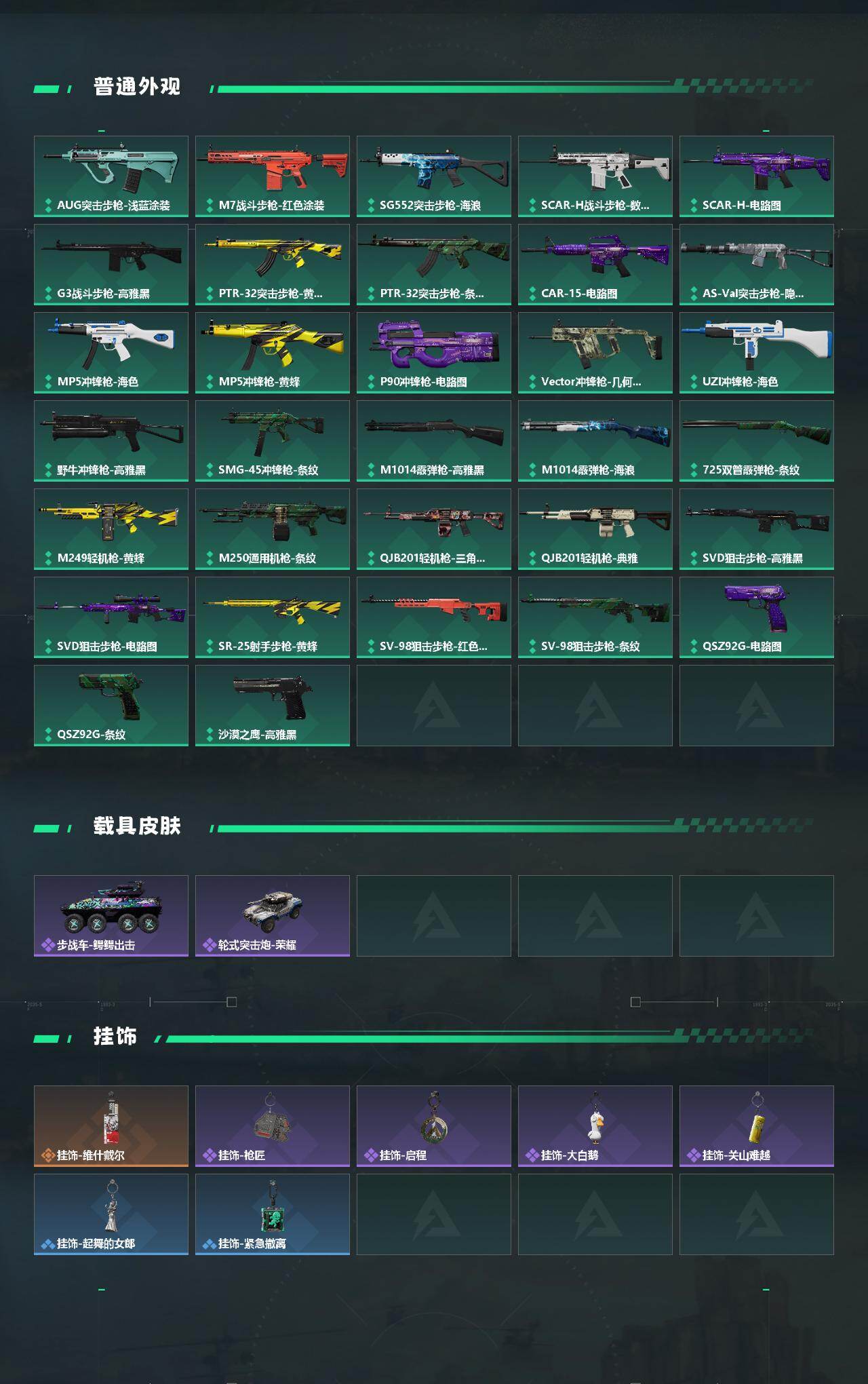 【稀有外观】:QBZ95-1突击步枪-花岗岩,M1014霰弹枪-花岗岩,P90冲锋枪-星之彩,M7战斗步枪-天际线,PKM通用机枪-精湛工艺,AKM突击步枪-战术演练,AKM突击步枪-肃杀,QBZ95-1突击步枪-公平竞技,AUG突击步枪-全金属外壳,M7战斗步枪-前沿科技,M7战斗步枪-捣蛋鬼,SG552突击步枪-2026,SG552突击步枪-贴花艺术,SCAR-H战斗步枪-荣耀列队,SCAR-H战斗步枪-黄昏,G3战斗步枪-战术演练,G3战斗步枪-主宰,AS Val突击步枪-哈夫克科技,腾龙突击步枪-前沿科技,MP5冲锋枪-哈夫克卫队,P90冲锋枪-医疗协议,P90冲锋枪-黄昏,P90冲锋枪-捣蛋鬼,Vector冲锋枪-先锋,UZI冲锋枪-亚特兰蒂斯,野牛冲锋枪-公平竞技,SMG-45-行动开启,SMG-45冲锋枪-幻影结构,勇士冲锋枪-冰天雪地,M1014霰弹枪-幻影结构,S12K霰弹枪-战术演练,M249轻机枪-战损,QJB201轻机枪-黄昏,QJB201轻机枪-哈夫克卫队,Mini-14射手步枪-荣耀列队,M14射手步枪-出厂配置,SKS射手步枪-弄臣,SR-25射手步枪-开拓,SV-98狙击步枪-星链科技,SV-98狙击步枪-哈夫克航天,SV-98狙击步枪-精英联盟,G