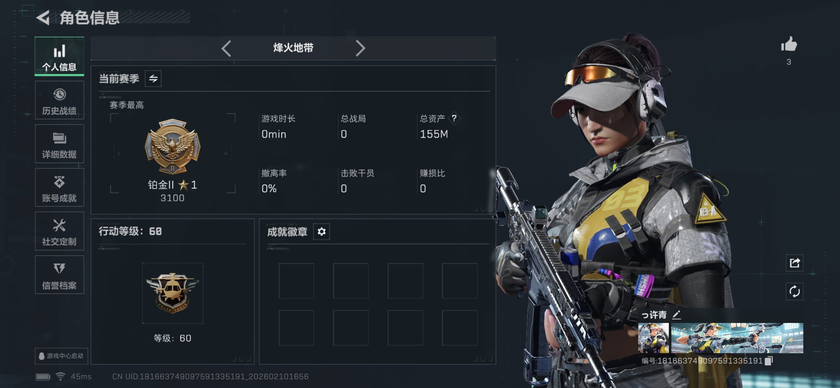 [16668026]【特价出售/店主推荐】 155m总资产-95328k哈伏币-60烽火等级-铂金-1战场等级-无军衔
