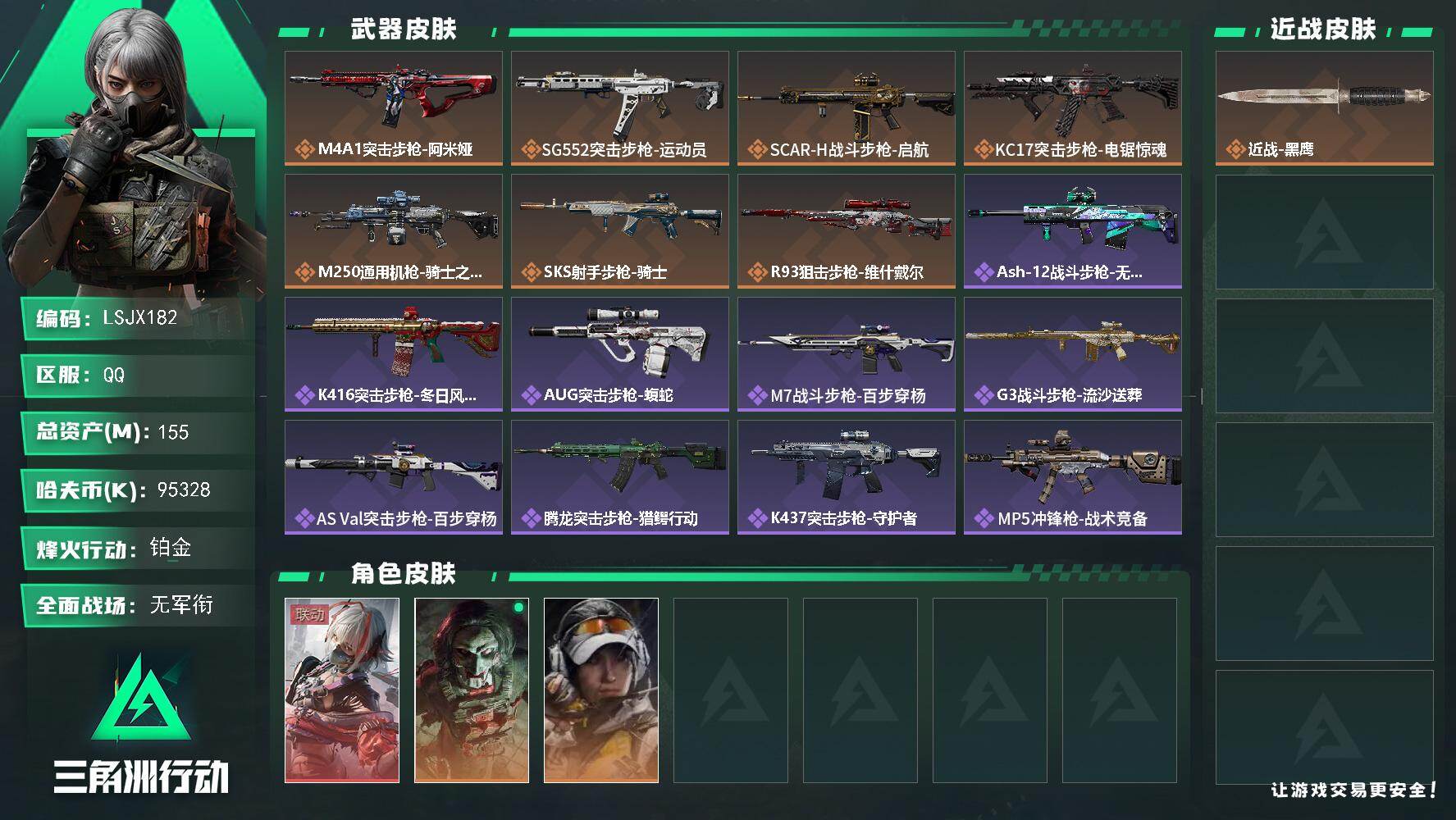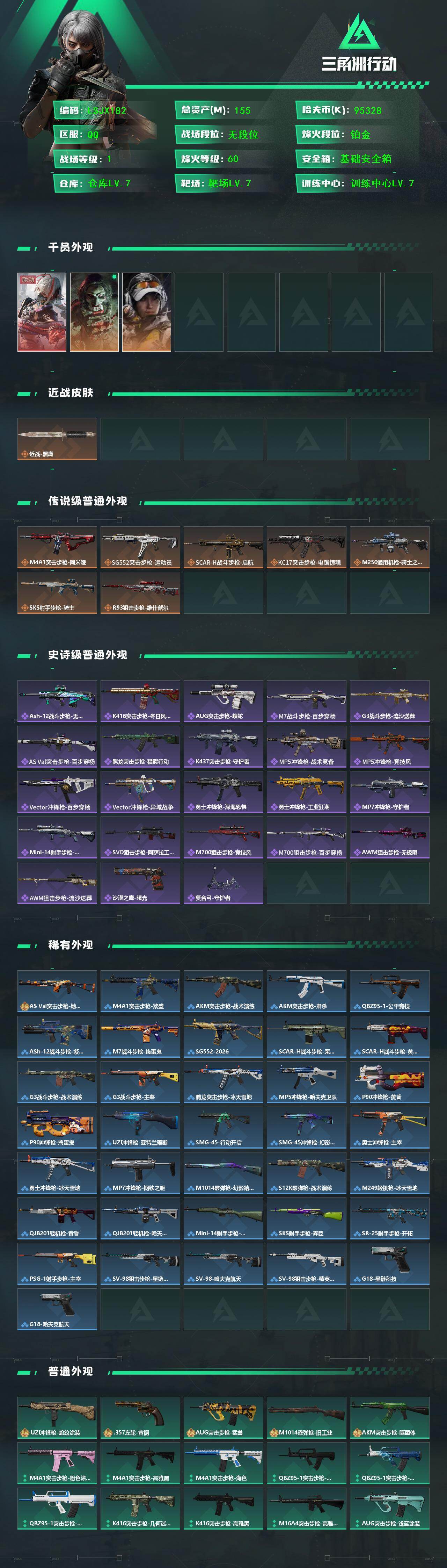 [16668026]【特价出售/店主推荐】 155m总资产-95328k哈伏币-60烽火等级-铂金-1战场等级-无军衔 【干员外观】:骇爪-维什戴尔,红狼-电锯惊魂,露娜-金牌射手 【近战皮肤】:近战-黑鹰 【传说外观】:M4A1突击步枪-阿米娅,SG552突击步枪-运动员,SCAR-H战斗步枪-启航,KC17突击步枪-电锯惊魂,M250通用机枪-骑士之心,SKS射手步枪-骑士,R93狙击步枪-维什戴尔 【史诗外观】:ASh-12战斗步枪-无极限,K416突击步枪-冬日风情,AUG突击步枪-蝮蛇,M7战斗步枪-百步穿杨,G3战斗步枪-流沙送葬,AS Val突击步枪-百步穿杨,腾龙突击步枪-猎鳄行动,K437突击步枪-守护者,MP5冲锋枪-战术竞备,MP5冲锋枪-竞技风,Vector冲锋枪-百步穿杨,Vector冲锋枪-异域战争,勇士冲锋枪-深海恐惧,勇士冲锋枪-工业狂潮,MP7冲锋枪-守护者,Mini-14射手步枪-守护者,SVD狙击步枪-阿萨拉工艺,M700狙击步枪-竞技风,M700狙击步枪-百步穿杨,AWM狙击步枪-无极限,AWM狙击步枪-流沙送葬,沙漠之鹰-曙光,复合弓-守护者 【稀有外观】:AS Val突击步枪-地平线,M4A1突击步枪-繁盛,AKM突击步枪-战术演练,AKM突击步枪-肃杀,QBZ95-1突击步枪-公平竞技,ASh-12战斗步枪-繁盛,M7战斗步枪-捣蛋鬼,SG552突击步枪-2026,SCAR-H战斗步枪-荣耀列队,SCAR-H战斗步枪-黄昏,G3战斗步枪-战术演练,G3战斗步枪-主宰*2,腾龙突击步枪-冰天雪地,MP5冲锋枪-哈夫克卫队,P90冲锋枪-黄昏,P90冲锋枪-捣蛋鬼,UZI冲锋枪-亚特兰蒂斯,SMG-45-行动开启,SMG-45冲锋枪-幻影结构,勇士冲锋枪-主宰,勇士冲锋枪-冰天雪地,MP7冲锋枪-钢铁之躯,M1014霰弹枪-幻影结构,S12K霰弹枪-战术演练,M249轻机枪-冰天雪地,QJB201轻机枪-黄昏,QJB201轻机枪-哈夫克卫队,Mini-14射手步枪-荣耀列队,SKS射手步枪-弄臣,SR-25射手步枪-开拓,PSG-1射手步枪-主宰,SV-98狙击步枪-星链科技,SV-98狙击步枪-哈夫克航天,SV-98狙击步枪-精英联盟,G18-星链科技,G18-哈夫克航天 【普通外观】:UZI冲锋枪-蛇纹涂装,.357左轮-黄铜,AUG突击
