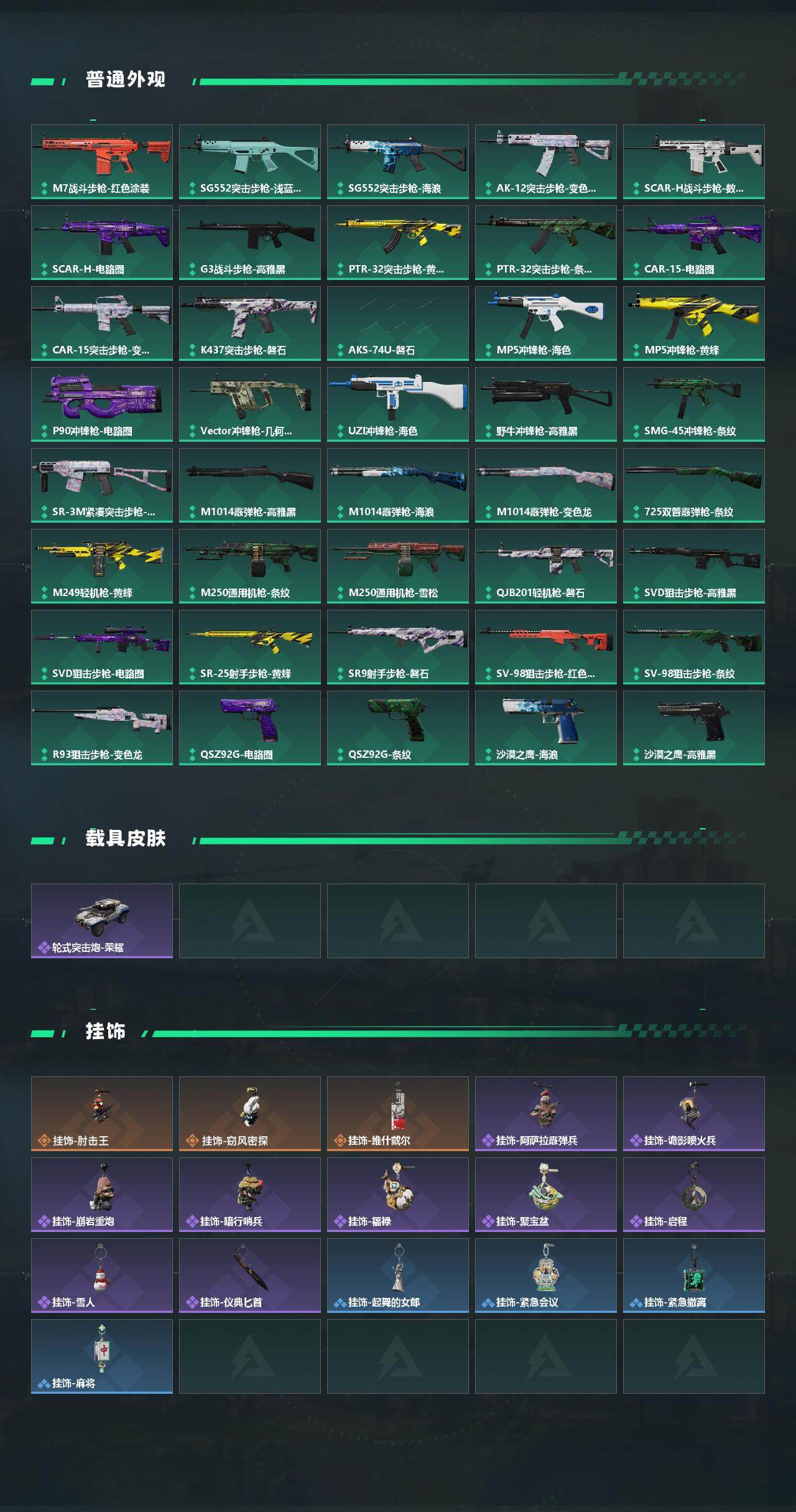 【稀有外观】:AS Val突击步枪-地平线,M4A1突击步枪-繁盛,AKM突击步枪-战术演练,AKM突击步枪-肃杀,QBZ95-1突击步枪-公平竞技,ASh-12战斗步枪-繁盛,M7战斗步枪-捣蛋鬼,SG552突击步枪-2026,SCAR-H战斗步枪-荣耀列队,SCAR-H战斗步枪-黄昏,G3战斗步枪-战术演练,G3战斗步枪-主宰*2,腾龙突击步枪-冰天雪地,MP5冲锋枪-哈夫克卫队,P90冲锋枪-黄昏,P90冲锋枪-捣蛋鬼,UZI冲锋枪-亚特兰蒂斯,SMG-45-行动开启,SMG-45冲锋枪-幻影结构,勇士冲锋枪-主宰,勇士冲锋枪-冰天雪地,MP7冲锋枪-钢铁之躯,M1014霰弹枪-幻影结构,S12K霰弹枪-战术演练,M249轻机枪-冰天雪地,QJB201轻机枪-黄昏,QJB201轻机枪-哈夫克卫队,Mini-14射手步枪-荣耀列队,SKS射手步枪-弄臣,SR-25射手步枪-开拓,PSG-1射手步枪-主宰,SV-98狙击步枪-星链科技,SV-98狙击步枪-哈夫克航天,SV-98狙击步枪-精英联盟,G18-星链科技,G18-哈夫克航天