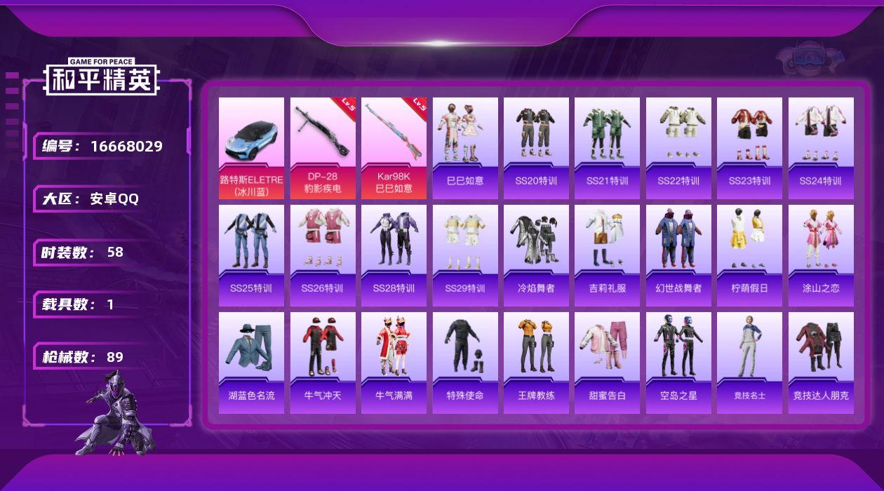 [16668029]【特价出售/店主推荐】安卓 手Q-0粉装-2特效枪-1载具-1粉色飞行器-25031热力值-2王牌印记-58套装-89枪皮【粉色枪皮等级】:Kar98K-巳巳如意(五级),DP-28-豹影疾电(五级)【粉色载具】:路特斯ELETRE(冰川蓝)【粉色枪皮】:Kar98K-巳巳如意,DP-28-豹影疾电