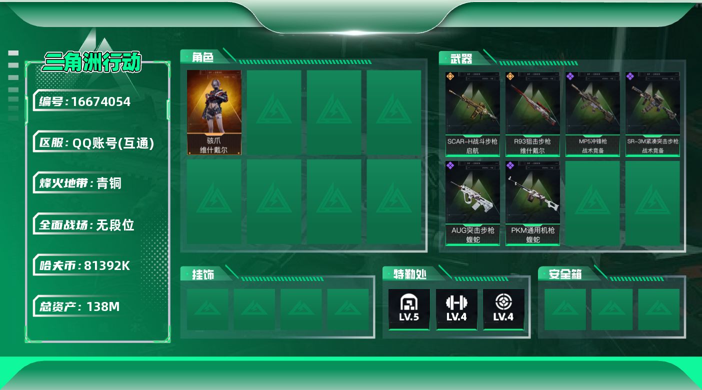 [16674054]【店主推荐捡漏号!可直接换绑】 81392k哈伏币-132m流动资产-48烽火等级-青铜-4战场等级-无军衔 【干员外观】:骇爪-维什戴尔 【近战皮肤】:近战-黑鹰 【传说外观】:SCAR-H战斗步枪-启航,R93狙击步枪-维什戴尔 【史诗外观】:AUG突击步枪-蝮蛇,MP5冲锋枪-战术竞备,SR-3M紧凑突击步枪-战术竞备,PKM通用机枪-蝮蛇 【稀有外观】:K416突击步枪-星之彩,AS Val突击步枪-地平线,M7战斗步枪-捣蛋鬼,SCAR-H战斗步枪-荣耀列队,MP5冲锋枪-弄臣,P90冲锋枪-捣蛋鬼,SMG-45-行动开启,M1014霰弹枪-幻影结构,PKM轻机枪-前沿科技,QJB201轻机枪-哈夫克卫队,Mini-14射手步枪-荣耀列队,SKS射手步枪-弄臣,SR-25射手步枪-开拓,G18-星链科技,G18-哈夫克航天 【普通外观】:M16A4突击步枪-常青藤,AK-12突击步枪-旧工业,M4A1突击步枪-海色,QBZ95-1突击步枪-高雅黑,QBZ95-1突击步枪-海浪,K416突击步枪-几何迷彩,M16A4突击步枪-高雅黑,AUG突击步枪-浅蓝涂装,SG552突击步枪-海浪,G3战斗步枪-高雅黑,PTR-32突击步枪-黄蜂,MP5冲锋枪-海色,MP5冲锋枪-黄蜂,Vector冲锋枪-几何迷彩,UZI冲锋枪-海色,野牛冲锋枪-高雅黑,M249轻机枪-黄蜂,M250通用机枪-条纹,SVD狙击步枪-高雅黑,SR-25射手步枪-黄蜂,QSZ92G-条纹,沙漠之鹰-海浪,沙漠之鹰-高雅黑 【载具外观】:轮式突击炮-荣耀 【军牌】:军牌-装备修理,军牌-修整,军牌-信誉优秀 【挂饰】:挂饰-维什戴尔,挂饰-蚀金玫瑰,挂饰-阿萨拉狙击兵,挂饰-阿萨拉霰弹兵,挂饰-诡影狙击兵*4,挂饰-诡影喷火兵*2,挂饰-启程,挂饰-阿萨拉徽章*8