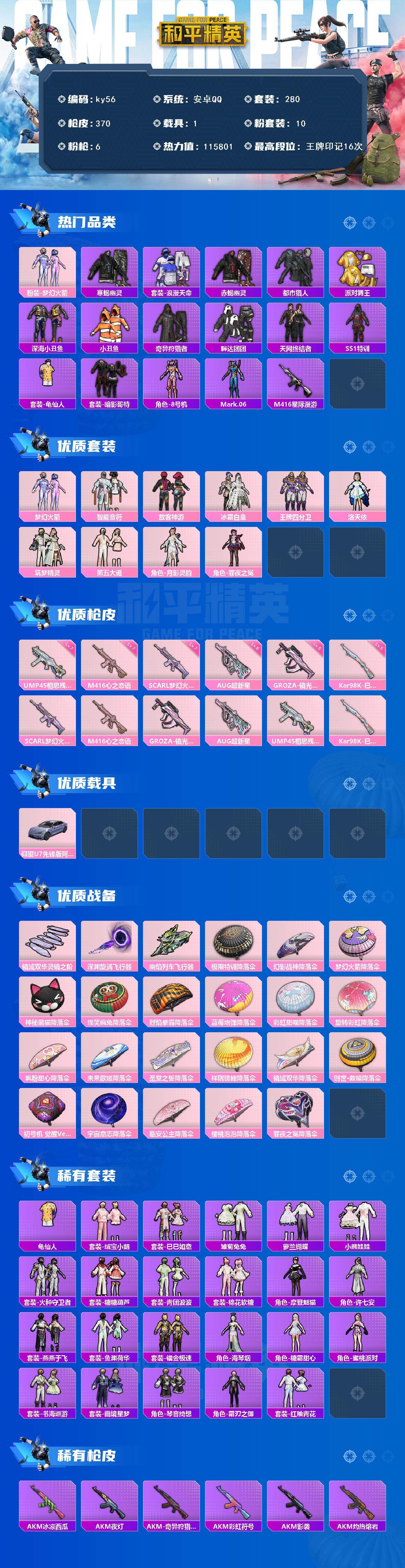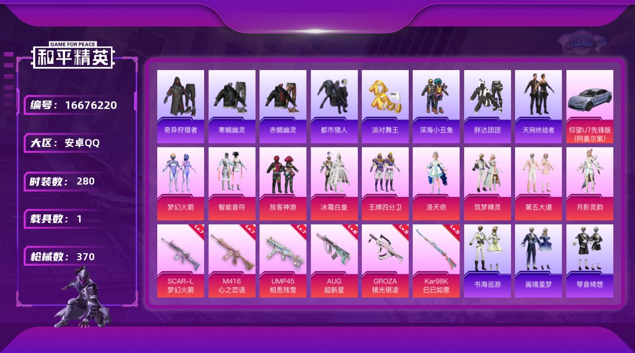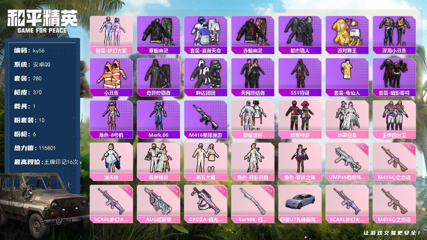 [16676220]安卓 手Q-10粉装-6特效枪-1载具-3粉色飞行器-115801热力值-16王牌印记-280套装-370枪皮