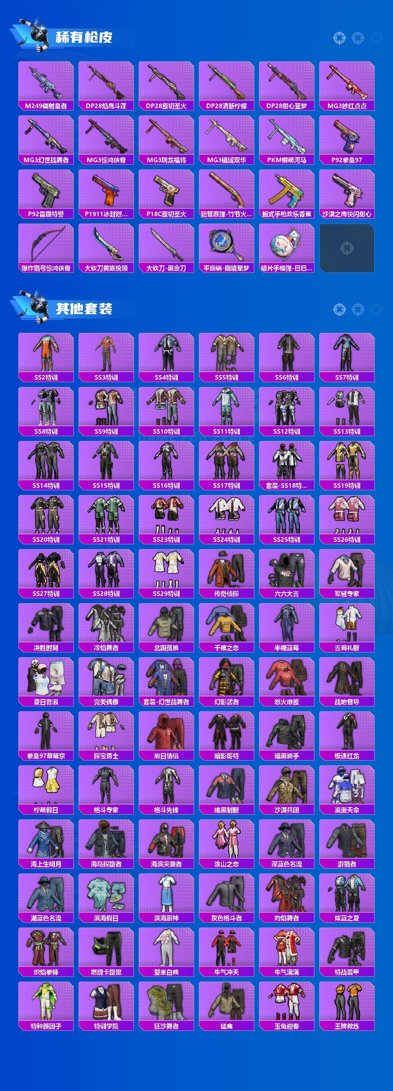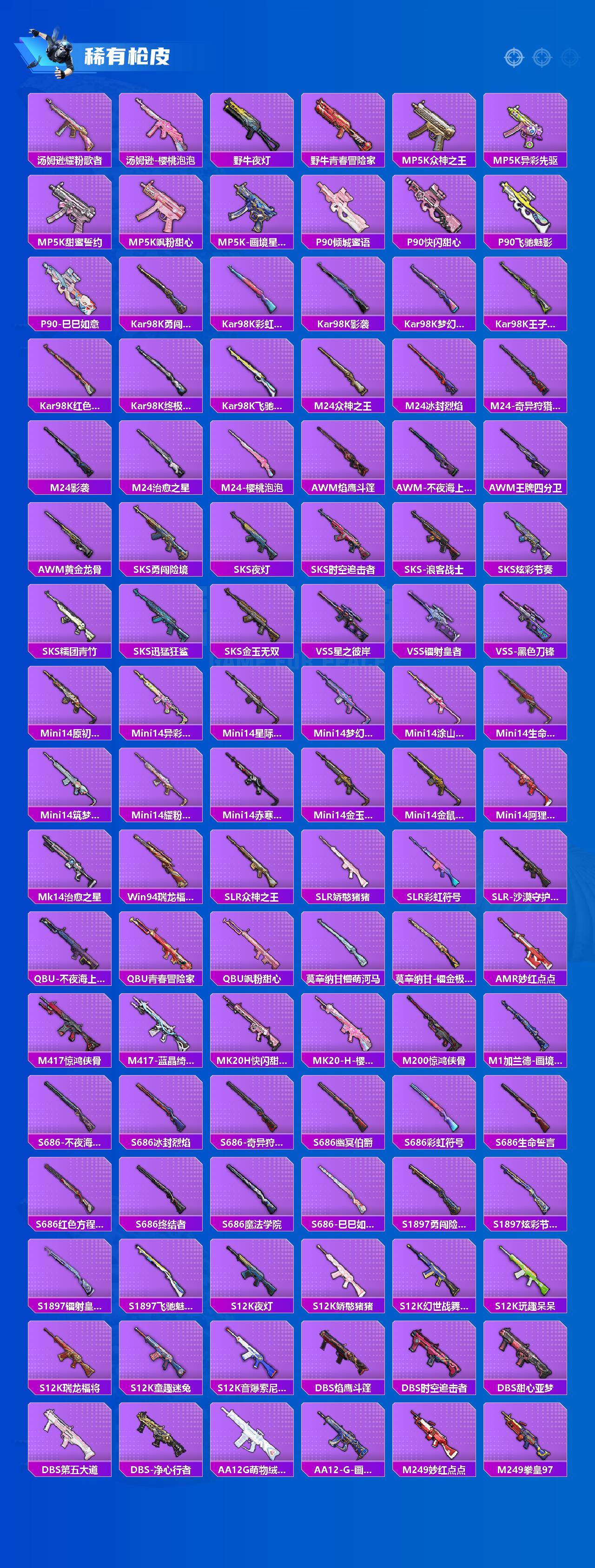 M416-星际漫游,AKM-奇异狩猎者,AKM-百万伏特,AKM-缤纷海域,M416-仓鼠灰灰,M416-黄金龙骨,M762-奇异狩猎者,M762-瑞龙福将,Kar98K-终极赛罗,M24-奇异狩猎者,AWM-黄金龙骨,S686-奇异狩猎者