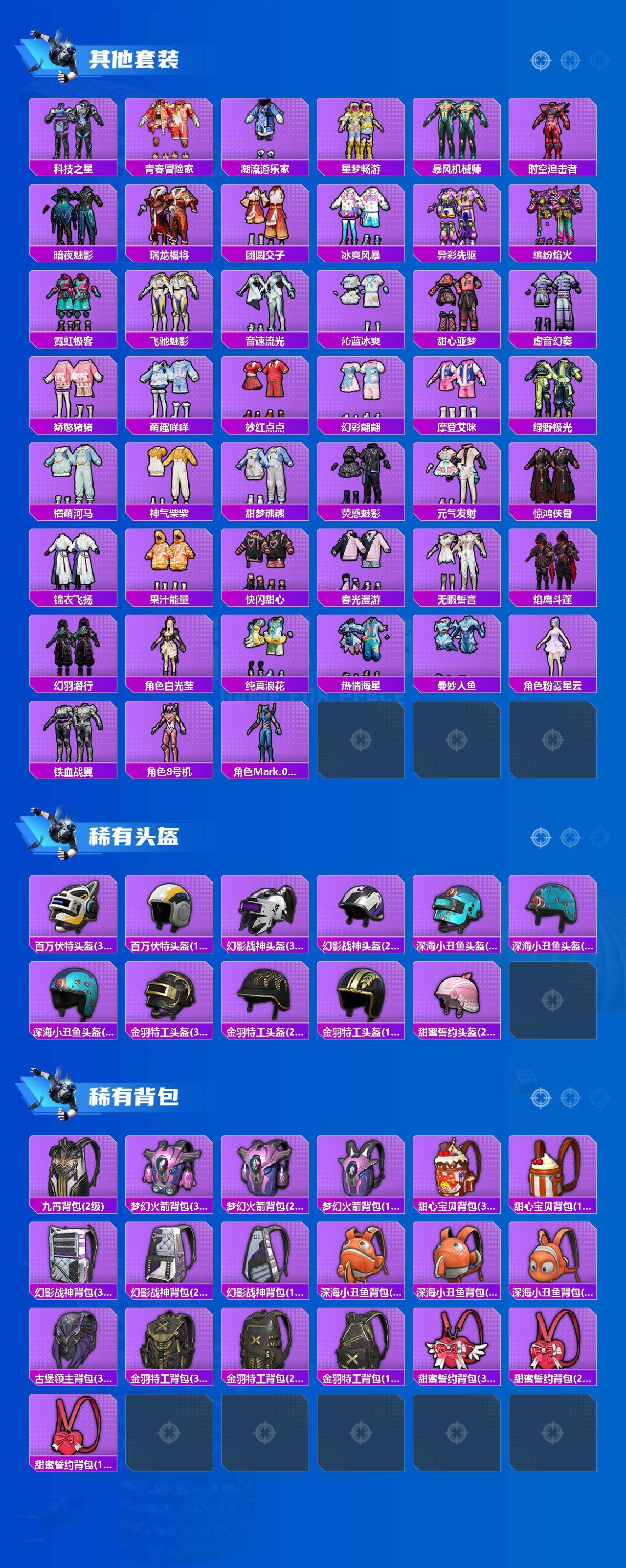 套装-梦幻火箭,套装-寒蝎幽灵,套装-赤蝎幽灵,套装-都市猎人,套装-派对舞王,套装-深海小丑鱼,套装-奇异狩猎者,套装-胖达团团,套装-智能音符,套装-放客神游,套装-王牌四分卫,角色-洛天依,套装-筑梦精灵,套装-第五大道,角色-月影灵韵,套装-爱崽白熊,套装-鹰眼刺客,套装-呆萌铁蟹,套装-迅捷狂鲨,套装-东方飞龙,套装-梦魇先生,套装-软萌银虎