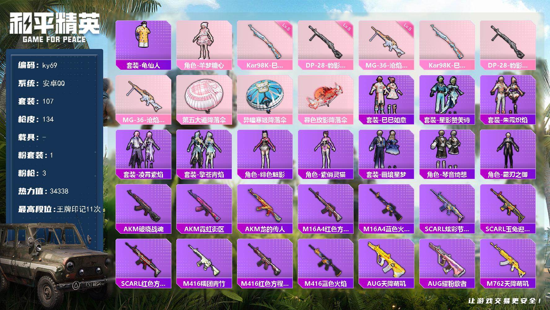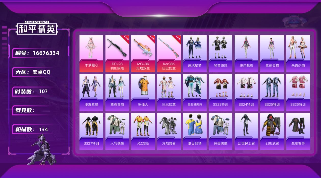 [16676334]安卓 手Q-1粉装-3特效枪-0载具-1粉色飞行器-34338热力值-11王牌印记-107套装-134枪皮 【热门品类】:套装-龟仙人 【粉色套装】:角色-羊梦糖心 【粉色枪皮等级】:Kar98K-巳巳如意(五级),DP-28-豹影疾电(五级),MG-36-沧焰双生(五级) 【粉色枪皮】:Kar98K-巳巳如意,DP-28-豹影疾电,MG-36-沧焰双生 【粉色降落伞】:第五大道降落伞,异瞳寒姬降落伞,炫彩糖果降落伞,暮色玫影降落伞 【稀有套装】:套装-龟仙人,套装-巳巳如意,套装-雪国风尚,套装-炫彩糖果,套装-星影赞美诗,套装-朱霞炽焰,套装-凌霄紫焰,套装-擎苍青焰,角色-绯色魅影,角色-紫俏灵猫,套装-画境星梦,套装-琴音绮想,角色-霜刃之御 【稀有枪皮】:AUG-冰晶雪宝,AKM-破晓战魂,AKM-霓虹街区,AKM-龙的传人,M16A4-红色方程式,M16A4-蓝色火焰,SCAR-L-炫彩节奏,SCAR-L-玉兔迎春,SCAR-L-红色方程式,M416-糯团青竹,M416-红色方程式,M416-蓝色火焰,AUG-天降萌叽,AUG-耀粉歌者,M762-天降萌叽,蜜獾-天降萌叽,ACE32-画境星梦,ARX-凌霄紫焰,UZI-啾咪啾咪,UZI-天降萌叽,UZI-红色方程式,UMP45-涂山之恋,UMP45-生命誓言,UMP45-蓝色火焰,Vector-焰鹰斗篷,Vector-彩虹符号,Vector-生命誓言,汤姆逊-天降萌叽,汤姆逊-炫彩节奏,汤姆逊-耀粉歌者,MP5K-画境星梦,JS9-凌霄紫焰,Kar98K-红色方程式,AWM-焰鹰斗篷,AWM-奇迹舞步,SKS-炫彩节奏,SKS-糯团青竹,VSS-彩虹符号,Mini14-耀粉歌者,M1加兰德-画境星梦,S686-生命誓言,S686-红色方程式,S12K-玩趣呆呆,S12K-破晓战魂,DBS-焰鹰斗篷,DBS-圣堂之誓,DBS-彩虹符号,DBS-荧海星豚,AA12-G-画境星梦,M249-彩虹符号,M249-破晓战魂,M249-糯团青竹,DP-28-焰鹰斗篷,MG3-幻世战舞者,MG3-第五大道,MG-36-凌霄紫焰,P92-凌霄紫焰,平底锅-凌霄紫焰,平底锅-画境星梦 【其他套装】:套装-SS23特训,套装-SS24特训,套装-SS25特训,套装-SS26特训,套装-SS27特训,套装-人气偶像,套装-