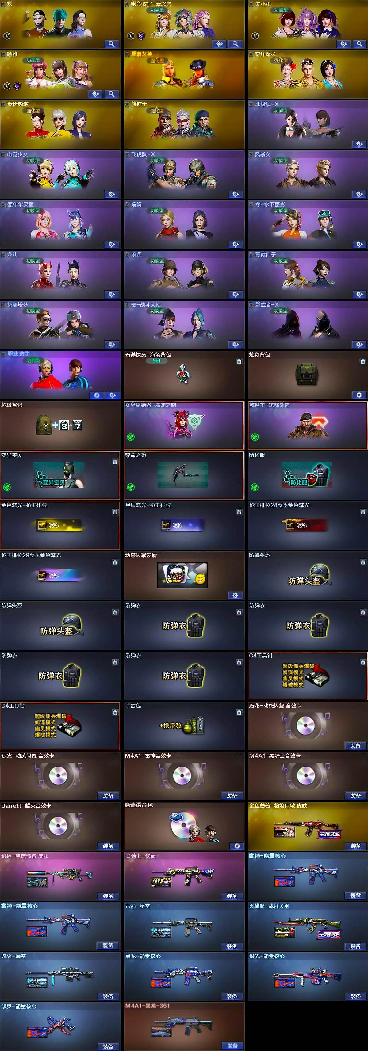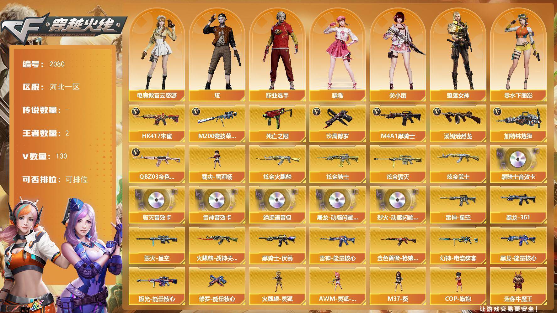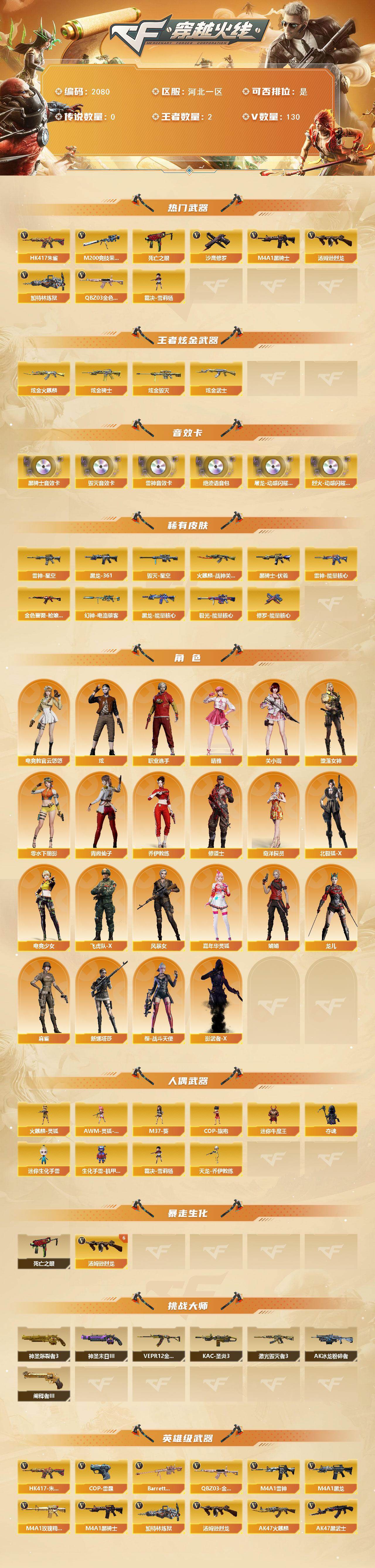 [16676667]河北一区-131V-2王者武器数-4炫金武器数 【热门武器】:QBZ03-金色蔷薇,HK417-朱雀,M200-竞技荣光,死亡之眼*4,M4A1-黑骑士,汤姆逊-烈龙*6,加特林-炼狱,裁决-雪莉杨,沙鹰-修罗*2 【王者炫金武器】:炫金火麒麟,炫金骑士,炫金武士,炫金毁灭 【音效卡】:屠龙-动感闪耀 音效卡,烈火-动感闪耀 音效卡,M4A1-雷神音效卡,M4A1-黑骑士音效卡,Barrett-毁灭音效卡,绝迹语音包 【皮肤】:幻神-电流骇客 皮肤,金色蔷薇-枪娘阿敏 皮肤,雷神-能量核心*2,雷神-星空,火麒麟-战神关羽,毁灭-星空,黑龙-能量核心,M4A1-黑龙-361,黑骑士-伏羲,极光-能量核心,修罗-能量核心 【角色】:炫,电竞教官-云悠悠,关小雨,晴雅,堕落女神,奇洋探员,乔伊教练,修道士,北极狐-X,电竞少女,飞虎队-X,风暴女,嘉年华灵狐,娟娟,零-水下丽影,龙儿,麻雀,青霞仙子,新娜塔莎,樱-战斗天使,影武者-X,职业选手 【人偶武器】:裁决-雪莉杨,火麒麟-灵狐*2,天龙-乔伊教练,AWM-灵狐-15周年嘉年华,M37-葵,COP-旗袍,迷你牛魔王,夺魂,迷你生化手雷,生化手雷-机甲核心 【暴走生化】:死亡之眼*4 【挑战大师】:神圣爆裂者III,AK47-冰龙粉碎者,VEPR-12-金魔,激光毁灭者III,KAC-圣炎切割者III,神圣爆裂者-末日III*2,阐释者III*2 【英雄级武器】:AK47-火麒麟,M4A1-黑龙,M4A1-雷神*2,M4A1-黑骑士,AK47-黑武士,AN94-超新星*2,M4A1-武圣,AK47-黑鲨,M4A1-雷霆,HK417-朱雀,M4A1-夜魔,黑武士-锦绣游龙,M4A1-玫瑰精灵,QBZ03-金色蔷薇,烈火-动感闪耀,王者之魄-觉醒版,AK-47-猩红传说,王者猎神-觉醒版,AWM-天龙,Barrett-毁灭,Barrett-极光,AWM-裁决,M200-竞技荣光,VSK-94-金蚀,Barrett-金色蔷薇*2,加特林-炼狱,汤姆逊-烈龙*6,沙鹰-修罗*2,沙鹰-天神*2,COP-雷霆,柯尔特-竞技荣光,破空枪刃-夜魔,Glock18-武圣,天神-动感闪耀,屠龙*3,龙啸*4,马来剑-夜魔,擎天,麒麟刺,擎天-竞技荣光*2,屠龙-动感闪耀,斩神刀-雷暴,高爆手雷-雷霆*7,高爆手雷-雷暴*2,高爆手
