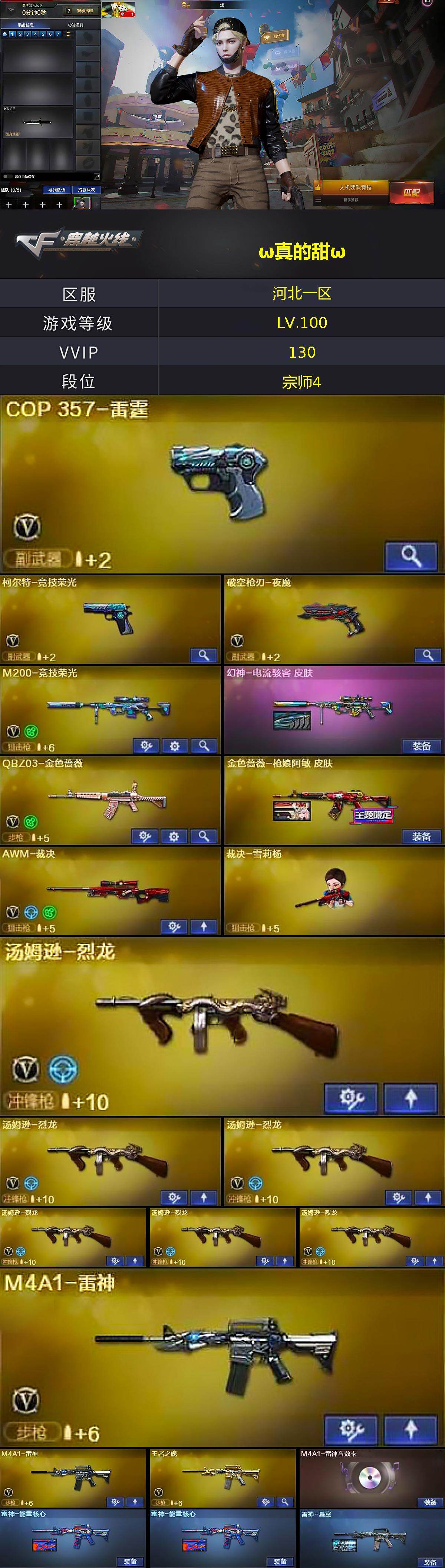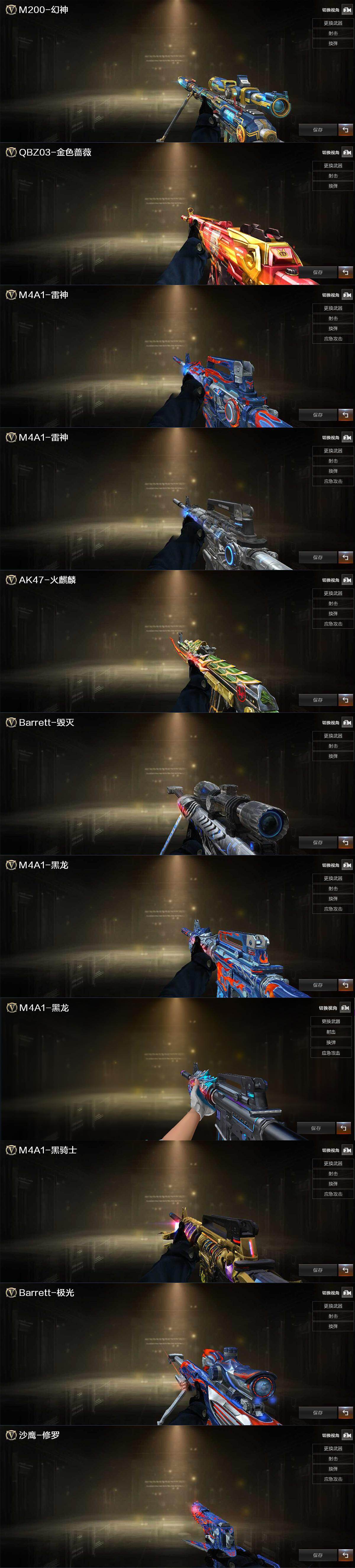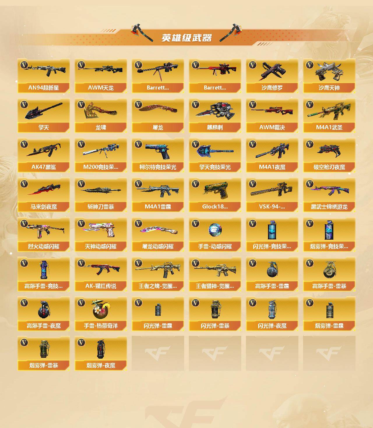 【英雄级武器】:AK47-火麒麟,M4A1-黑龙,M4A1-雷神*2,M4A1-黑骑士,AK47-黑武士,AN94-超新星*2,M4A1-武圣,AK47-黑鲨,M4A1-雷霆,HK417-朱雀,M4A1-夜魔,黑武士-锦绣游龙,M4A1-玫瑰精灵,QBZ03-金色蔷薇,烈火-动感闪耀,王者之魄-觉醒版,AK-47-猩红传说,王者猎神-觉醒版,AWM-天龙,Barrett-毁灭,Barrett-极光,AWM-裁决,M200-竞技荣光,VSK-94-金蚀,Barrett-金色蔷薇*2,加特林-炼狱,汤姆逊-烈龙*6,沙鹰-修罗*2,沙鹰-天神*2,COP-雷霆,柯尔特-竞技荣光,破空枪刃-夜魔,Glock18-武圣,天神-动感闪耀,屠龙*3,龙啸*4,马来剑-夜魔,擎天,麒麟刺,擎天-竞技荣光*2,屠龙-动感闪耀,斩神刀-雷暴,高爆手雷-雷霆*7,高爆手雷-雷暴*2,高爆手