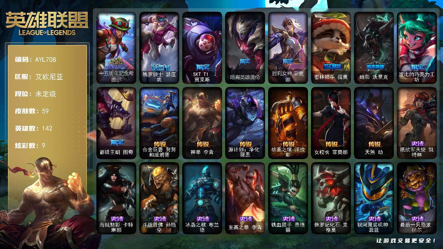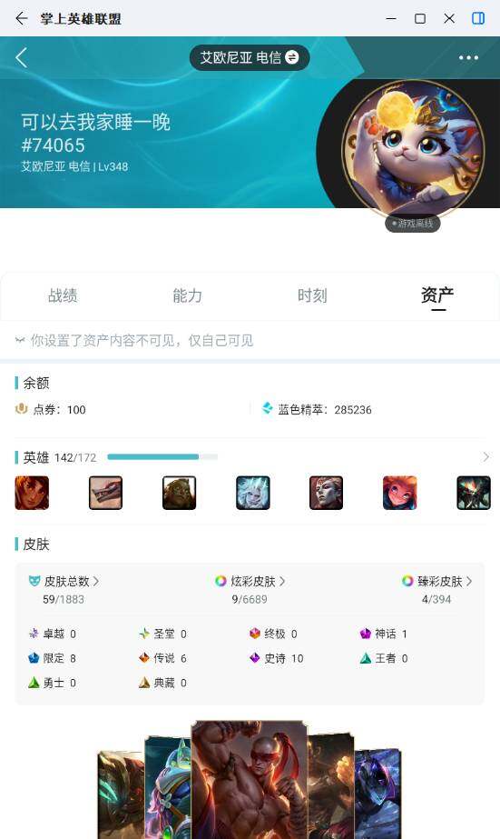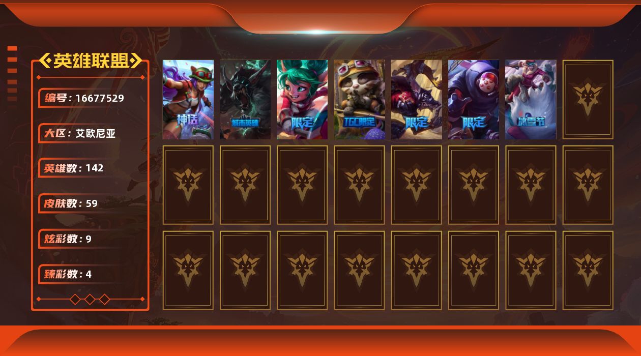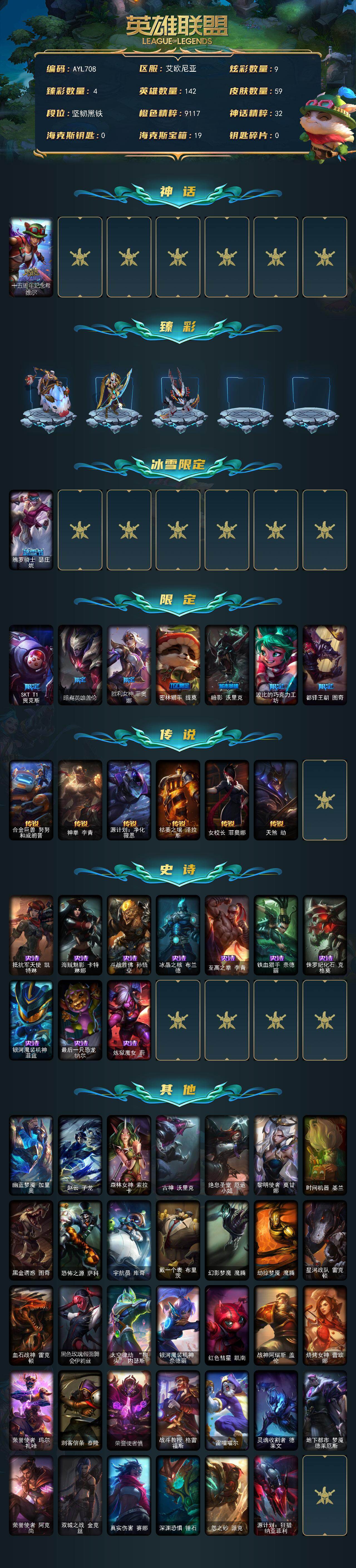 未定级段位-142英雄-59皮肤-9炫彩-0终极-1神话-8限定-6传说-10史诗