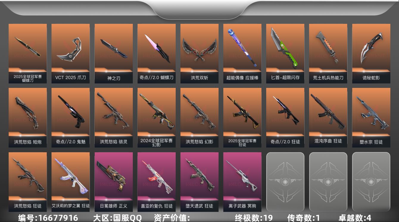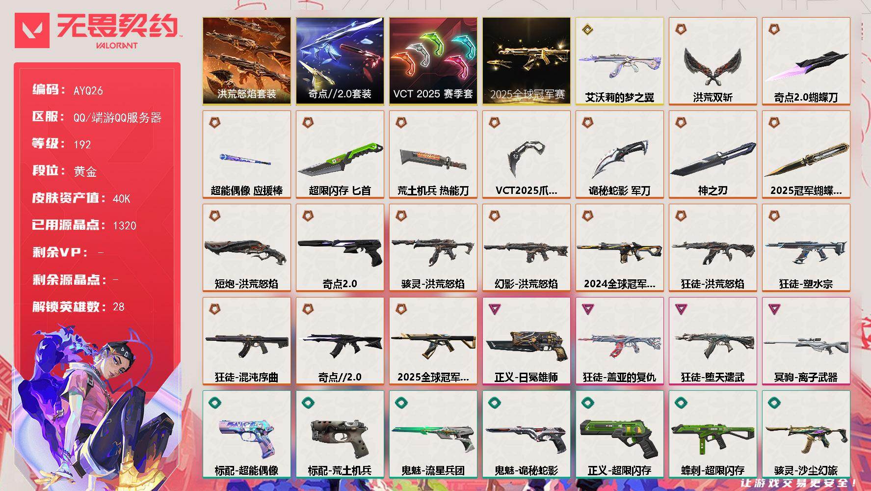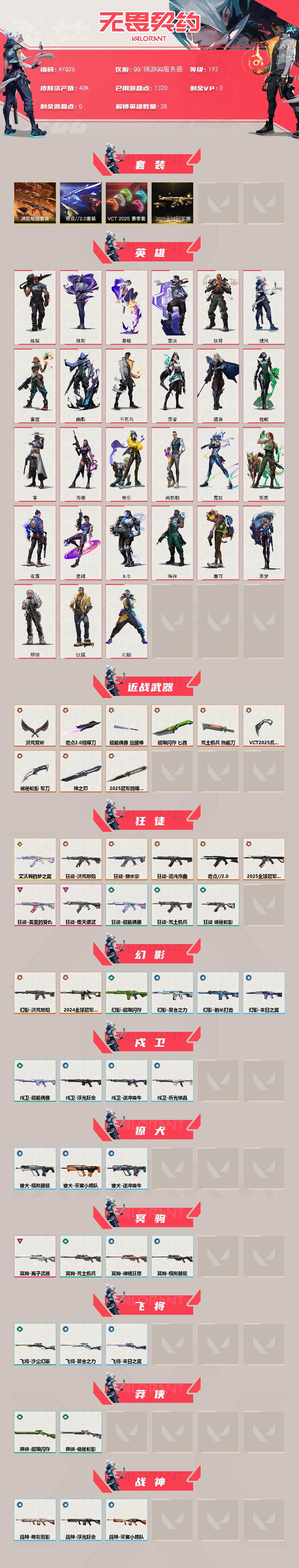 [16677916]【套装】:2025全球冠军赛套装,VCT 2025 赛季套装,奇点//2.0套装,洪荒怒焰套装 【英雄】:幻棱,炼狱,维斯,暮蝶,钛狐,壹决,铁臂,捷风,雷兹,幽影,不死鸟,贤者,猎枭,蝰蛇,零,芮娜,奇乐,尚勃勒,霓虹,斯凯,夜露,星礈,K/O,海神,盖可,黑梦,钢锁 【近战武器】:近战武器-2025全球冠军赛 蝴蝶刀,近战武器-神之刃,近战武器-奇点//2.0 蝴蝶刀,近战武器-VCT 2025 爪刀,近战武器-超能偶像 应援棒,近战武器-超限闪存 匕首,近战武器-洪荒双斩,近战武器-荒土机兵 热能刀,近战武器-诡秘蛇影 军刀 【狂徒】:狂徒-艾沃莉的梦之翼,狂徒-2025全球冠军赛,狂徒-洪荒怒焰,狂徒-混沌序曲,狂徒-奇点//2.0,狂徒-塑水宗,狂徒-堕天遗武,狂徒-盖亚的复仇,狂徒-超能偶像,狂徒-荒土机兵,狂徒-诡秘蛇影 【幻影】:幻影-2024全球冠军赛,幻影-洪荒怒焰,幻影-超限闪存,幻影-聚合之力,幻影-纳米打击,幻影-末日之翼 【戍卫】:戍卫-超能偶像,戍卫-浮光跃金,戍卫-逆冲蛮牛,戍卫-折光棱晶 【獠犬】:獠犬-采蜜小蜂队,獠犬-模拟赫兹,獠犬-逆冲蛮牛 【冥驹】:冥驹-离子武器,冥驹-荒土机兵,冥驹-胡桃狂想,冥驹-模拟赫兹 【飞将】:飞将-沙尘幻旅,飞将-聚合之力,飞将-末日之翼 【莽侠】:莽侠-超限闪存,莽侠-诡秘蛇影 【战神】:战神-采蜜小蜂队,战神-浮光跃金,战神-萌彩剪影 【奥丁】:奥丁-纳米打击,奥丁-末日之翼 【判官】:判官-超能偶像,判官-诡秘蛇影,判官-采蜜小蜂队,判官-萌彩剪影,判官-纳米打击x 【雄鹿】:雄鹿-模拟赫兹,雄鹿-逆冲蛮牛 【骇灵】:骇灵-洪荒怒焰,骇灵-荒土机兵,骇灵-沙尘幻旅,骇灵-浮光跃金 【蜂刺】:蜂刺-超限闪存,蜂刺-胡桃狂想,蜂刺-聚合之力,蜂刺-折光棱晶 【标配】:标配-超能偶像,标配-荒土机兵,标配-浮光跃金,标配-折光棱晶 【正义】:正义-日冕雄师,正义-超限闪存,正义-复古浪潮,正义-纳米打击 【鬼魅】:鬼魅-奇点//2.0,鬼魅-流星兵团,鬼魅-诡秘蛇影,鬼魅-采蜜小蜂队,鬼魅-胡桃狂想,鬼魅-模拟赫兹,鬼魅-星云暗涌 【狂怒】:狂怒-聚合之力,狂怒-萌彩剪影,狂怒-逆冲蛮牛 【短炮】:短炮-洪荒怒焰,短炮-末日之翼 【卡面】:终章:激斗汉堡 卡面,进入射程 卡面,分崩离析 卡面,