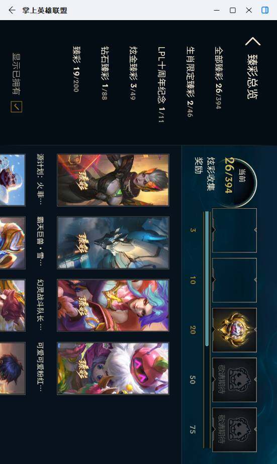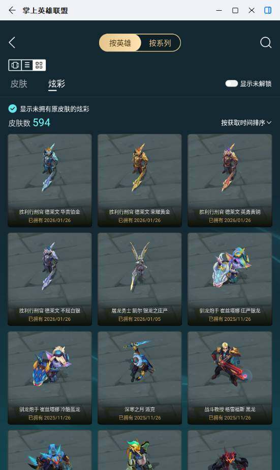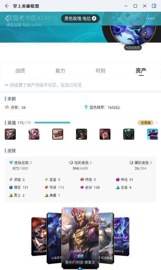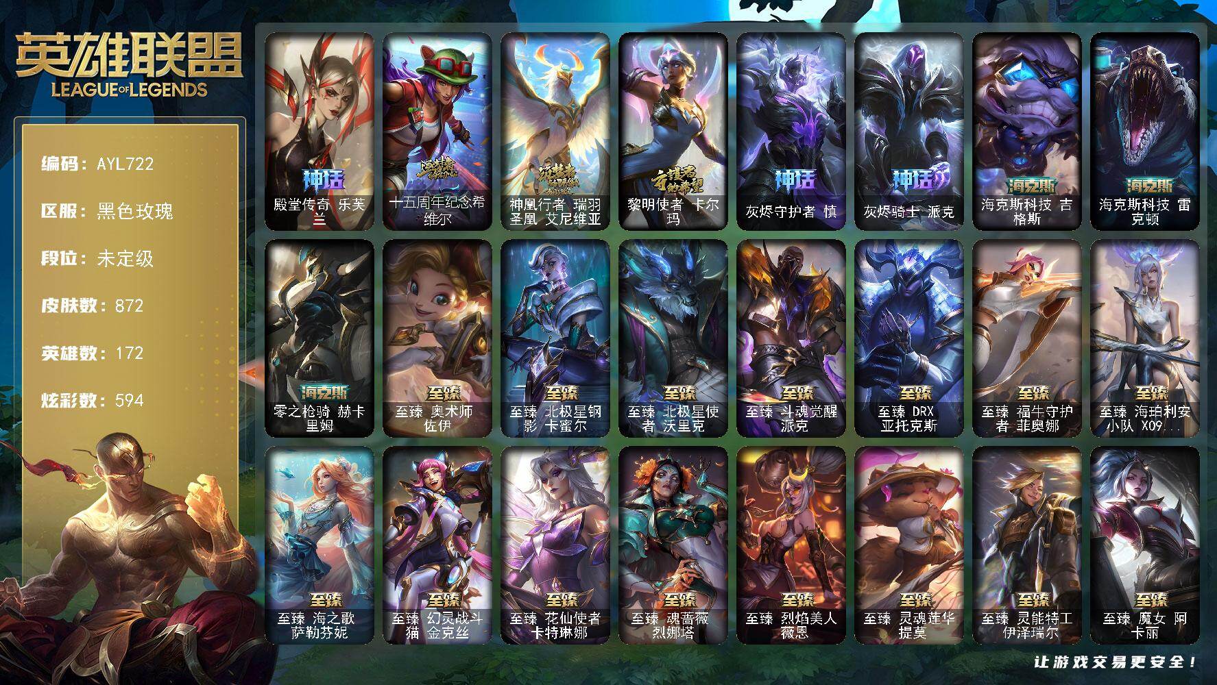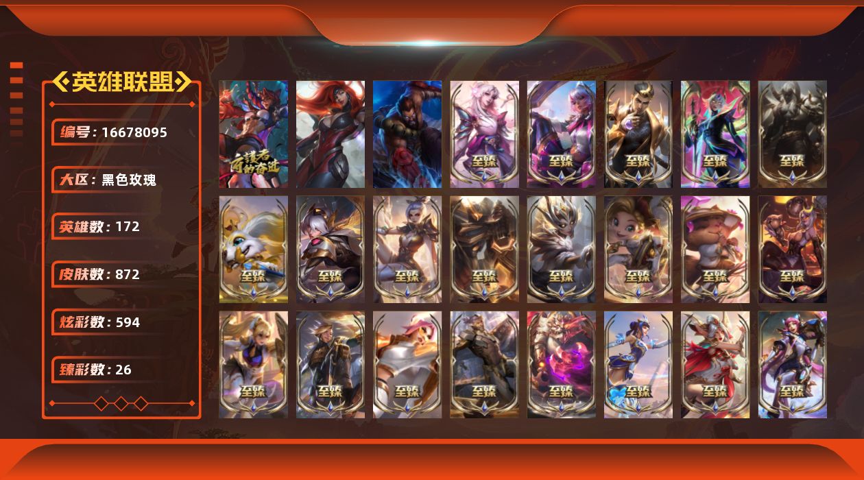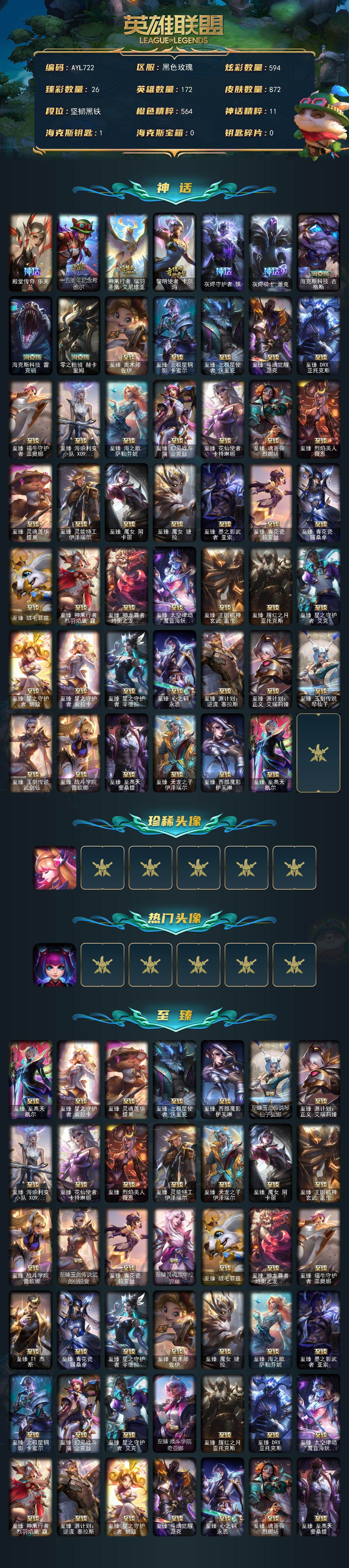 未定级段位-172英雄-872皮肤-594炫彩-3终极-51神话-151限定-111传说-108史诗