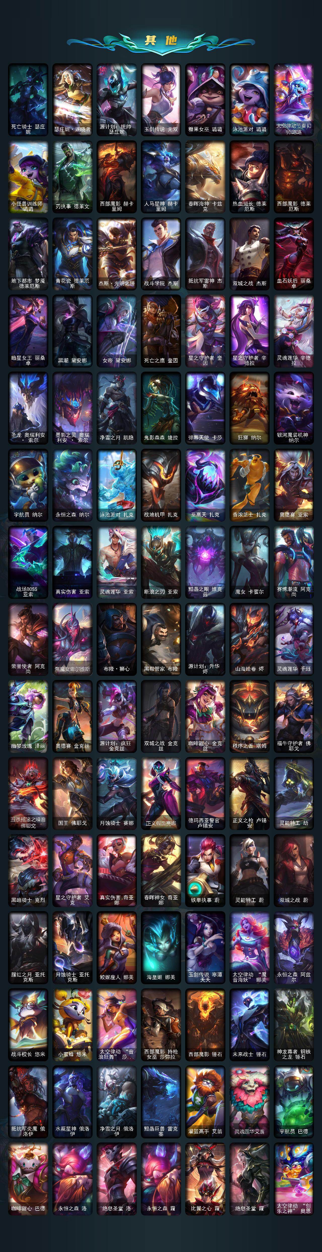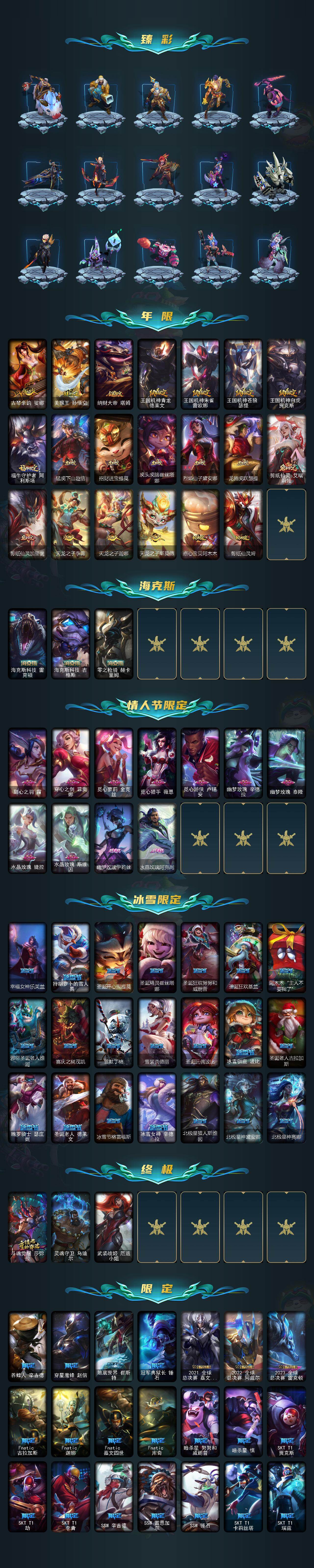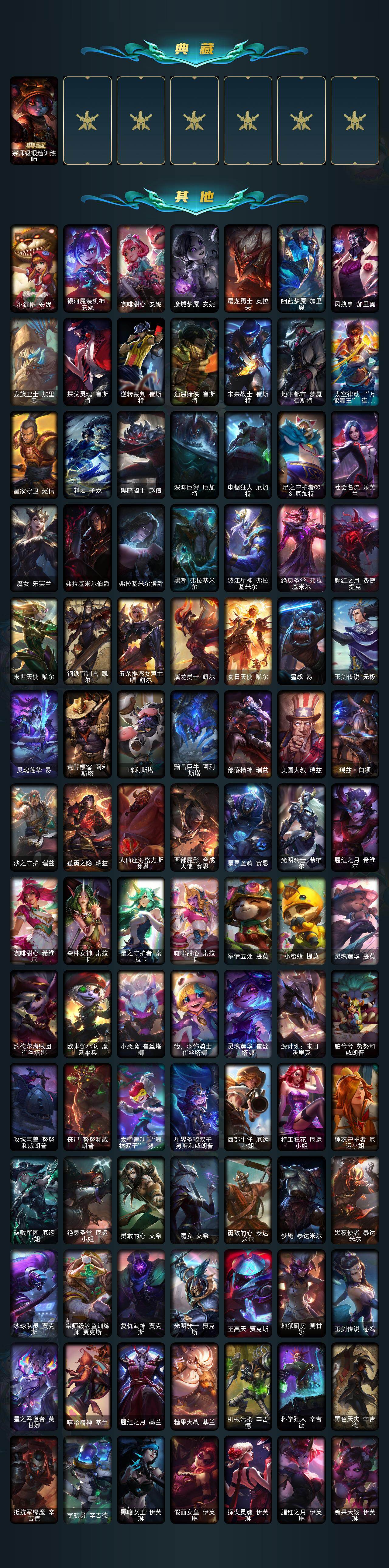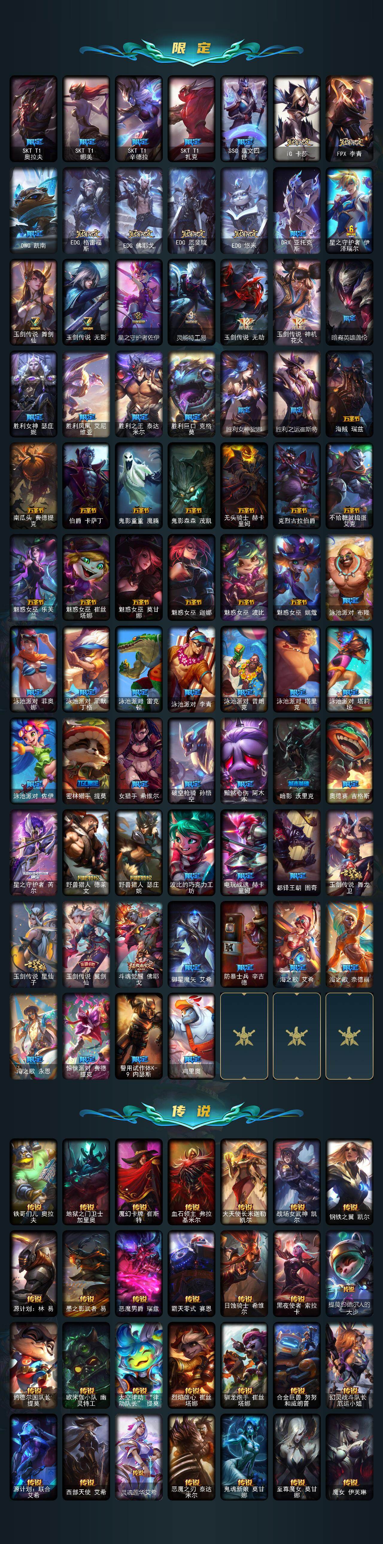 【神话皮肤】:殿堂传奇乐芙兰,十五周年纪念希维尔,神凰行者瑞羽圣凰艾尼维亚,黎明使者卡尔玛,灰烬守护者慎,灰烬骑士派克,海克斯科技吉格斯,海克斯科技雷克顿,零之枪骑赫卡里姆,至臻至高天奎桑提,至臻天龙之子伊泽瑞尔,至臻西部魔影伊芙琳,至臻至高天凯尔,至臻奥术师佐伊,至臻北极星钢影卡蜜尔,至臻北极星使者沃里克,至臻斗魂觉醒派克,至臻DRX亚托克斯,至臻福牛守护者菲奥娜,至臻海珀利安小队X09星环灵风迦娜,至臻海之歌萨勒芬妮,至臻幻灵战斗猫金克丝,至臻花仙使者卡特琳娜,至臻魂蔷薇烈娜塔,至臻烈焰美人薇恩,至臻灵魂莲华提莫,至臻灵能特工伊泽瑞尔,至臻魔女阿卡丽,至臻魔女婕拉,至臻墨之影武者亚索,至臻青花瓷拉克丝,至臻青花瓷丽桑卓,至臻绒毛菲兹,至臻神凰行者烈羽焰凰霞,至臻神龙尊者均衡之龙沃利贝尔,至臻太空律动魔音海妖娜美,至臻王国机神玄武盖伦,至臻腥红之月亚托克斯,至臻星之守护者艾克,至臻星之守护者妮蔻,至臻星之守护者索拉卡,至臻星之守护者辛德拉,至臻心之钢永恩,至臻源计划逆流塞拉斯,至臻源计划正义艾瑞莉娅,至臻玉剑传说琴仙子,至臻玉剑传说武剑仙,至臻战斗学院蕾欧娜
