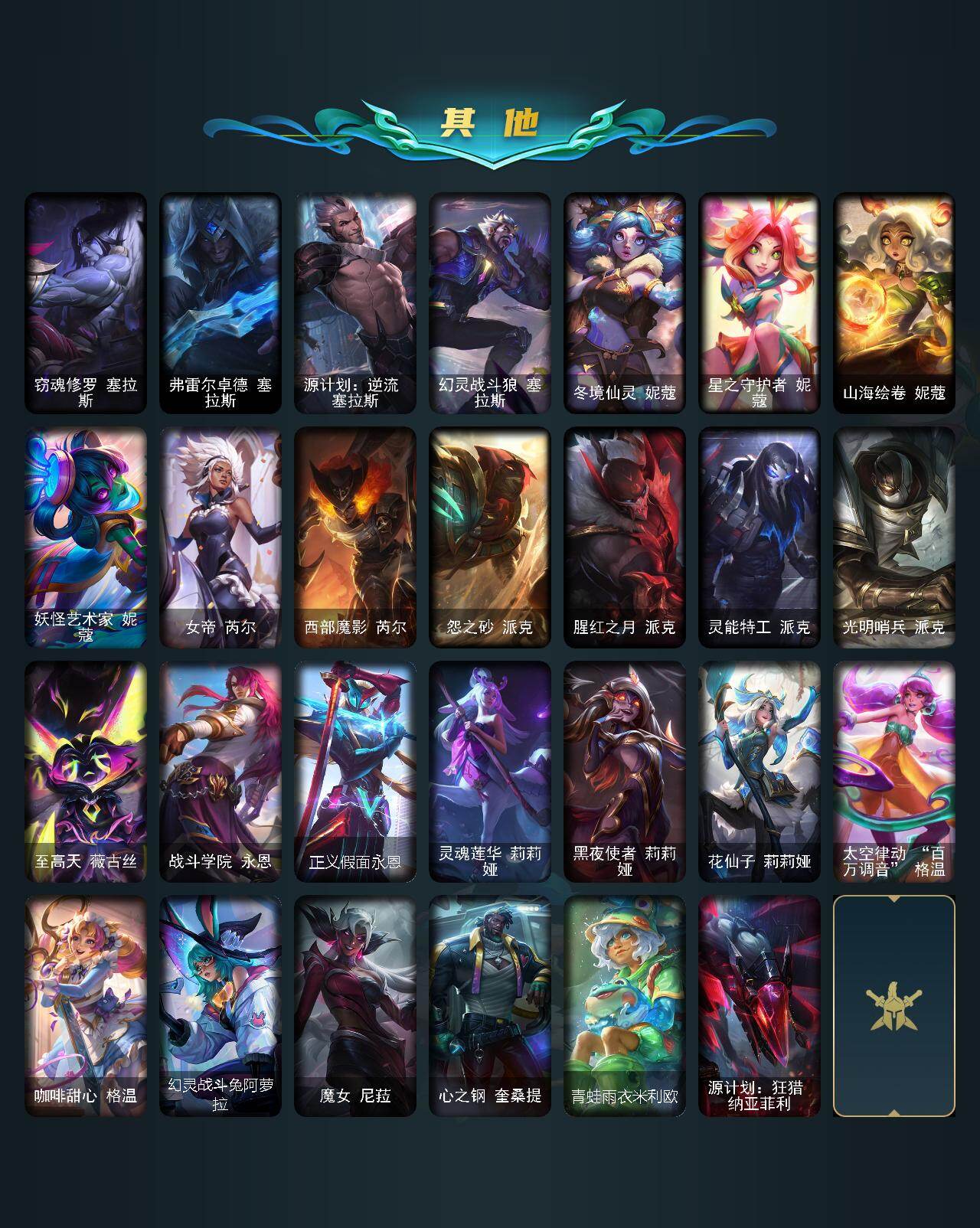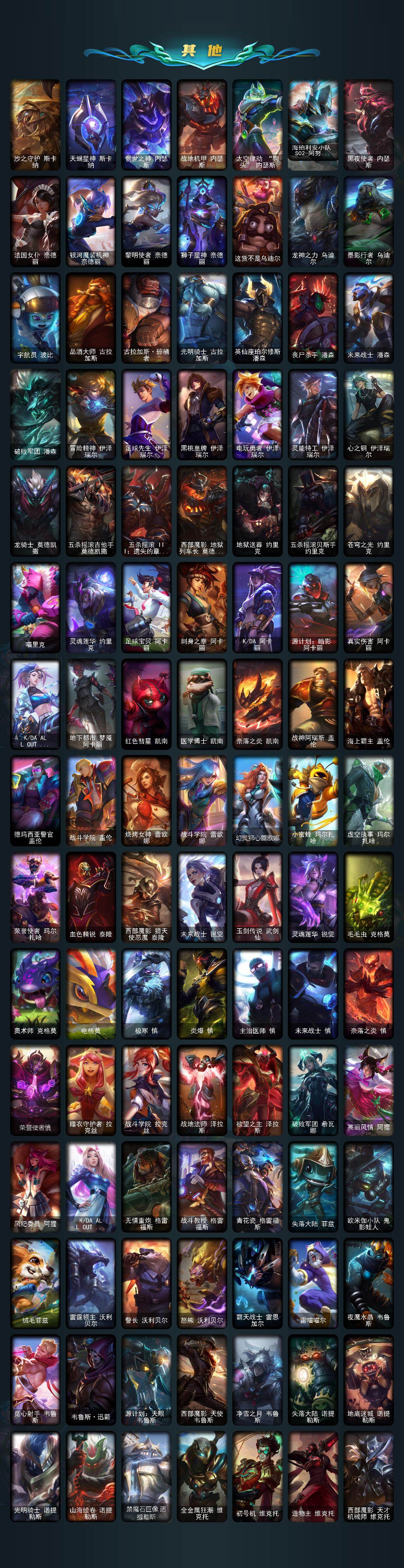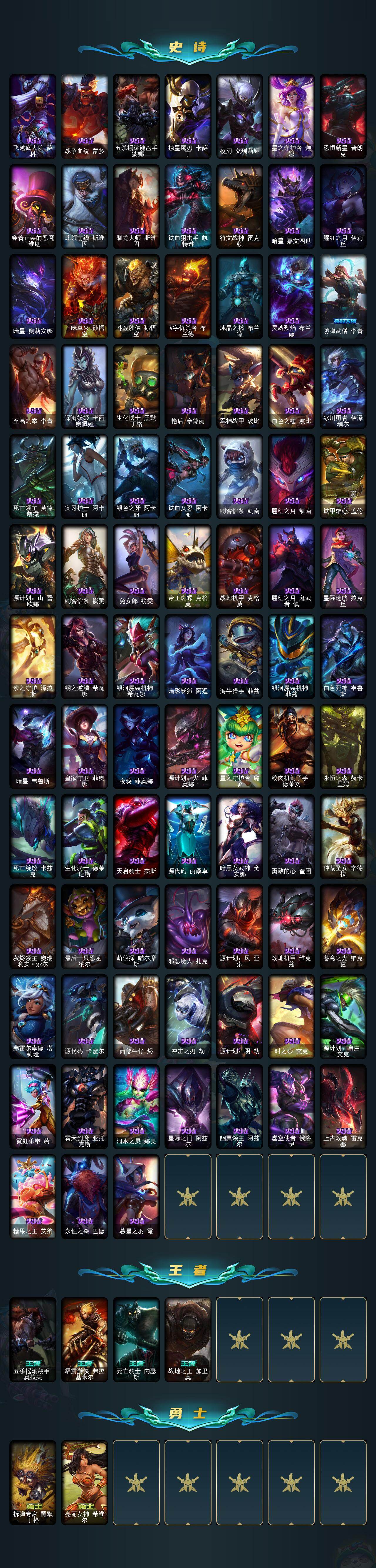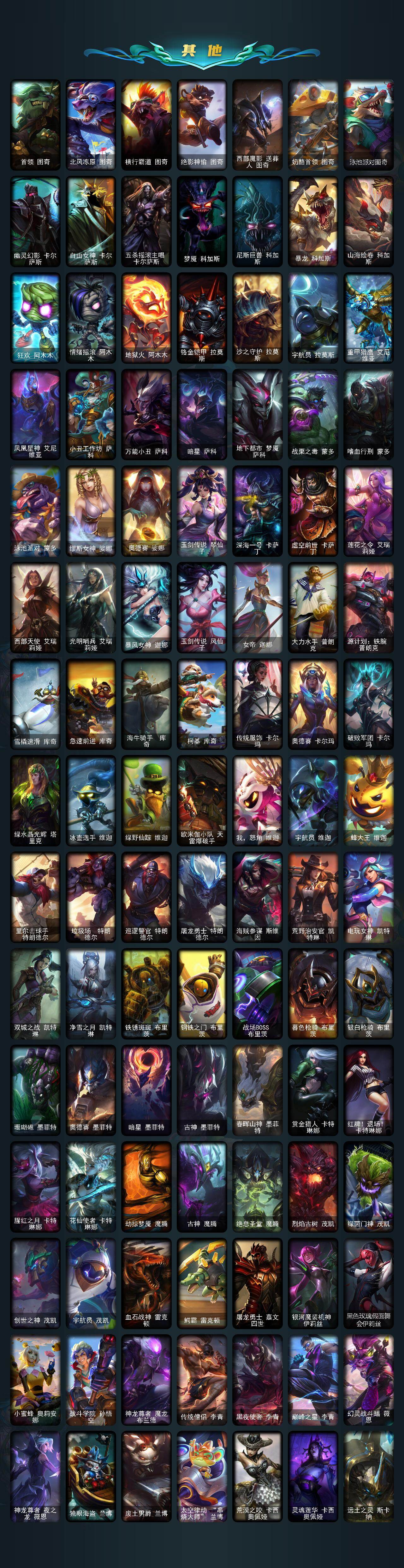 【神话皮肤】:殿堂传奇乐芙兰,十五周年纪念希维尔,神凰行者瑞羽圣凰艾尼维亚,黎明使者卡尔玛,灰烬守护者慎,灰烬骑士派克,海克斯科技吉格斯,海克斯科技雷克顿,零之枪骑赫卡里姆,至臻至高天奎桑提,至臻天龙之子伊泽瑞尔,至臻西部魔影伊芙琳,至臻至高天凯尔,至臻奥术师佐伊,至臻北极星钢影卡蜜尔,至臻北极星使者沃里克,至臻斗魂觉醒派克,至臻DRX亚托克斯,至臻福牛守护者菲奥娜,至臻海珀利安小队X09星环灵风迦娜,至臻海之歌萨勒芬妮,至臻幻灵战斗猫金克丝,至臻花仙使者卡特琳娜,至臻魂蔷薇烈娜塔,至臻烈焰美人薇恩,至臻灵魂莲华提莫,至臻灵能特工伊泽瑞尔,至臻魔女阿卡丽,至臻魔女婕拉,至臻墨之影武者亚索,至臻青花瓷拉克丝,至臻青花瓷丽桑卓,至臻绒毛菲兹,至臻神凰行者烈羽焰凰霞,至臻神龙尊者均衡之龙沃利贝尔,至臻太空律动魔音海妖娜美,至臻王国机神玄武盖伦,至臻腥红之月亚托克斯,至臻星之守护者艾克,至臻星之守护者妮蔻,至臻星之守护者索拉卡,至臻星之守护者辛德拉,至臻心之钢永恩,至臻源计划逆流塞拉斯,至臻源计划正义艾瑞莉娅,至臻玉剑传说琴仙子,至臻玉剑传说武剑仙,至臻战斗学院蕾欧娜