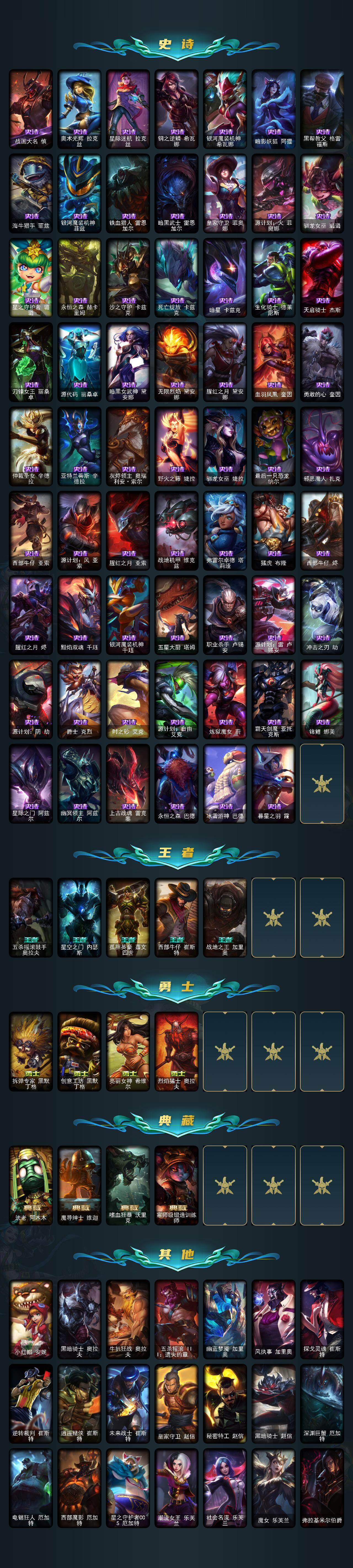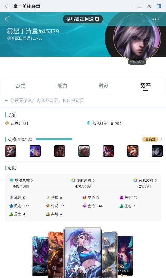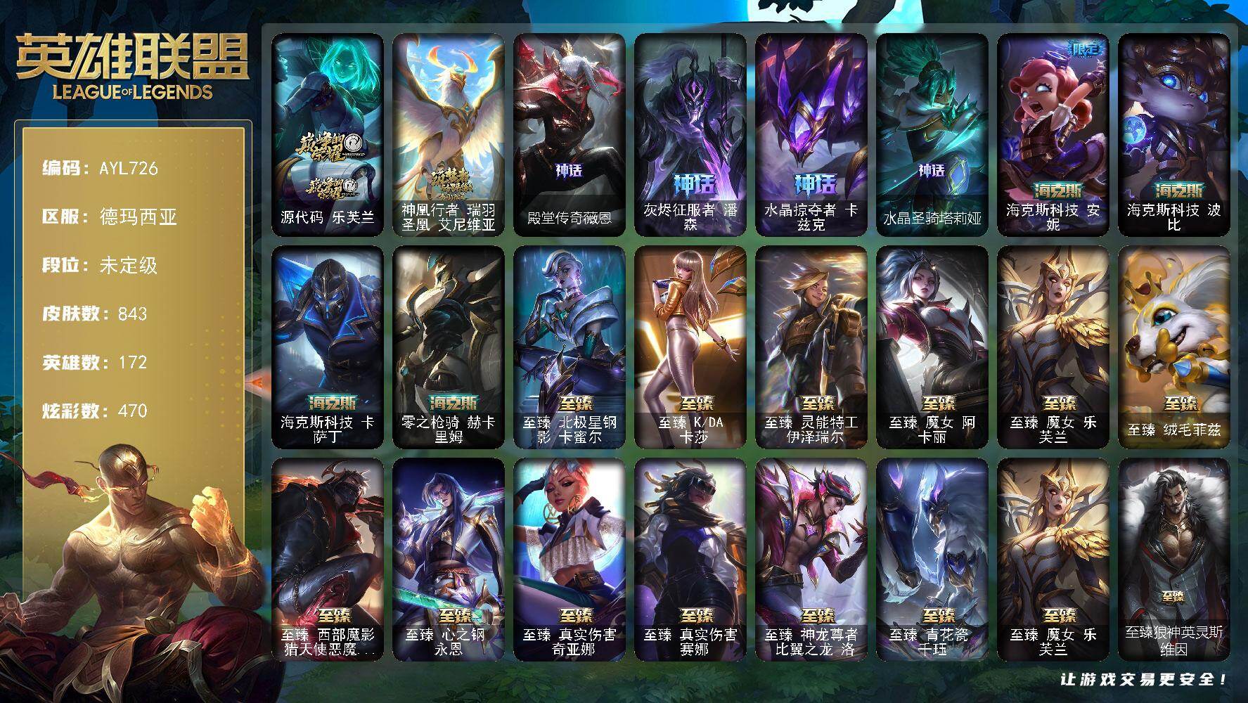 未定级段位-172英雄-843皮肤-470炫彩-3终极-29神话-155限定-77传说-146史诗