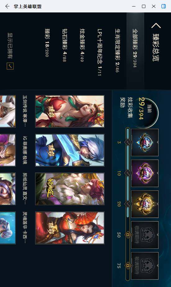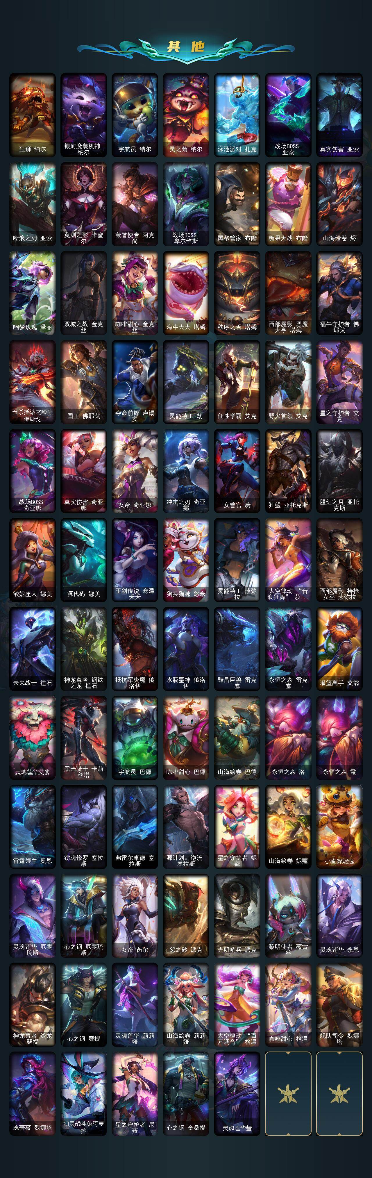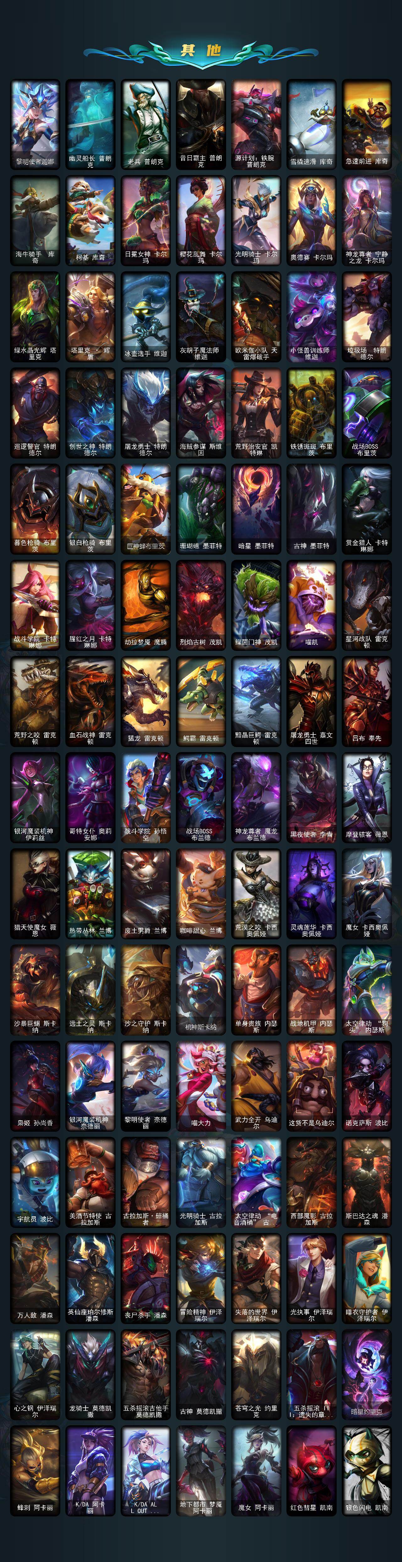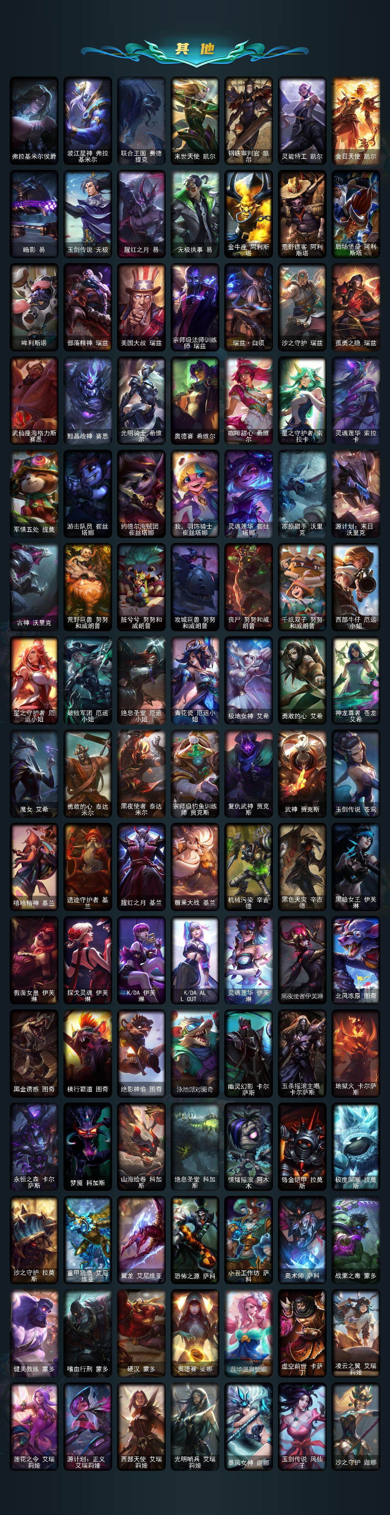 【臻彩皮肤】:剪纸仙灵嘉文四世日进斗金,天龙之子卡莎飞龙乘云,无畏骑士瑟庄妮赤子初心,墨之影武者亚索金墨耀影,玉剑传说无影莫问,冠军典狱长锤石凯旋圣装,冠军之隐劫凯旋圣装,神龙尊者圣龙李青龙腾云起,泳池派对凯特琳粉红冰川,玉剑传说无极麒麟,玉剑传说无影竞星,西部魔影卢锡安贝利尔之怠,泳池派对菲奥娜清凉苹果冰,源计划联合艾希红莲之弓,黎明使者锐雯黑夜使者,灵魂莲华卡西奥佩娅流火,玉剑传说寒潭夭夭胭脂,灵魂莲华亚索霜见之时,可爱可爱粉红红布里茨,魔女阿卡丽虚荣,净雪之月莫甘娜冬虹,幻灵战斗兔阿萝拉梦幻强袭,青花瓷厄运小姐月色,北极星钢影卡蜜尔智慧纽带,心之钢伊泽瑞尔天纵才华