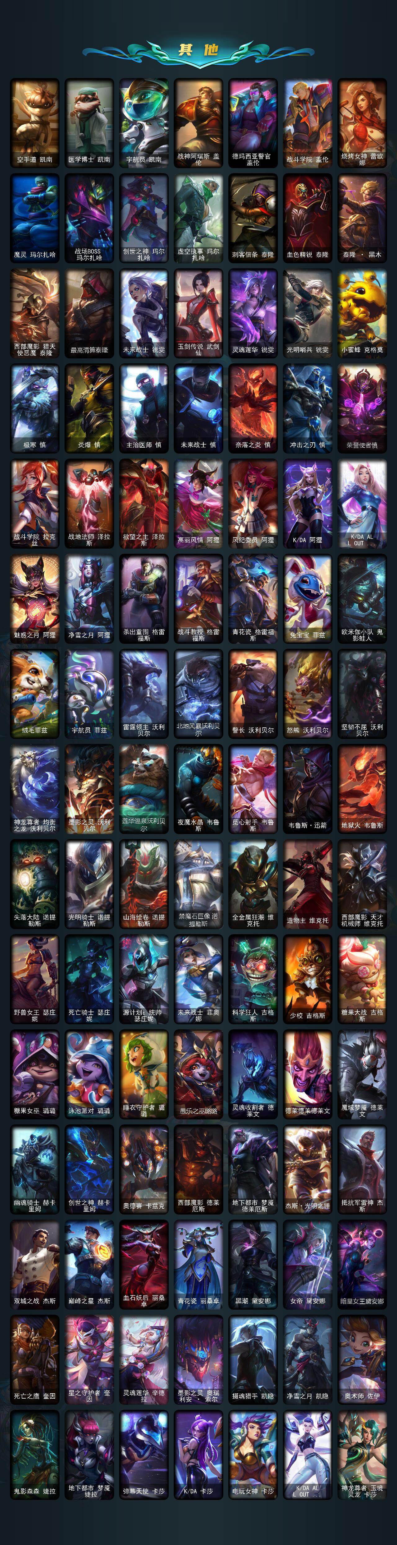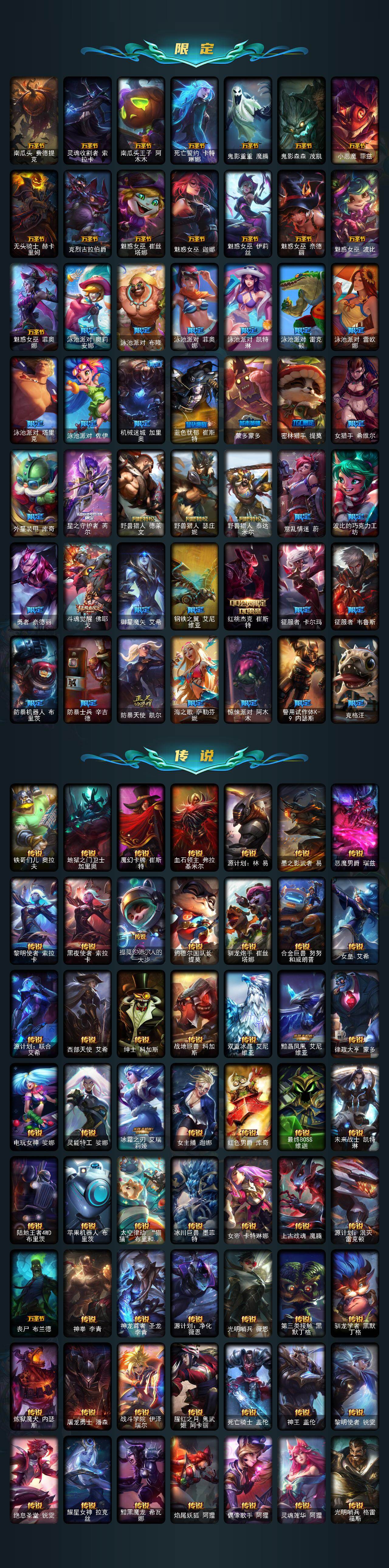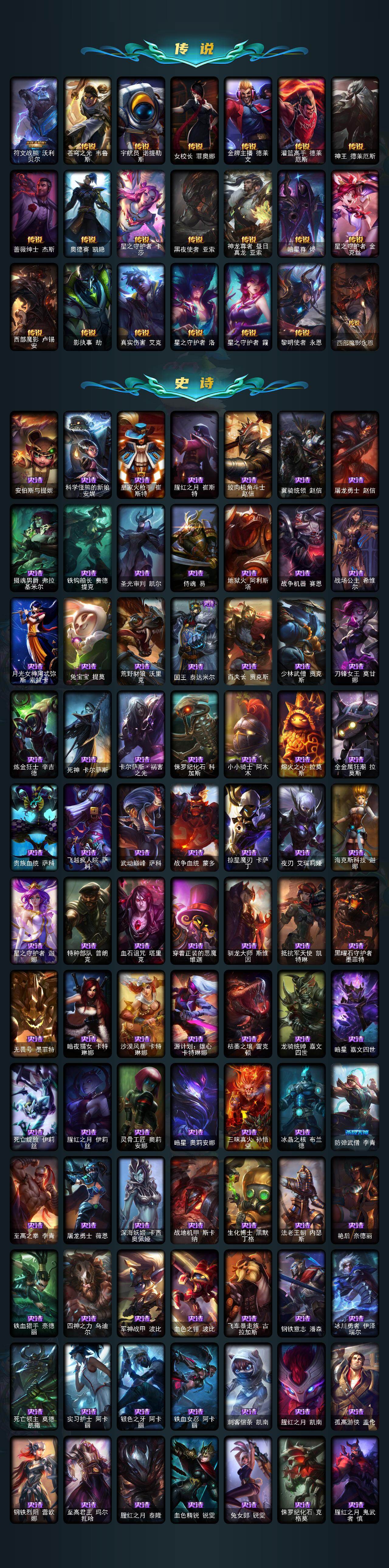 【神话皮肤】:源代码乐芙兰,神凰行者瑞羽圣凰艾尼维亚,殿堂传奇薇恩,灰烬征服者潘森,水晶掠夺者卡兹克,水晶圣骑塔莉娅,海克斯科技安妮,海克斯科技波比,海克斯科技卡萨丁,零之枪骑赫卡里姆,至臻真实伤害奇亚娜,至臻真实伤害赛娜,至臻神龙尊者比翼之龙洛,至臻青花瓷千珏,至臻北极星钢影卡蜜尔,至臻KDA卡莎,至臻灵能特工伊泽瑞尔,至臻魔女阿卡丽,至臻魔女乐芙兰,至臻绒毛菲兹,至臻西部魔影猎天使恶魔泰隆,至臻心之钢永恩
