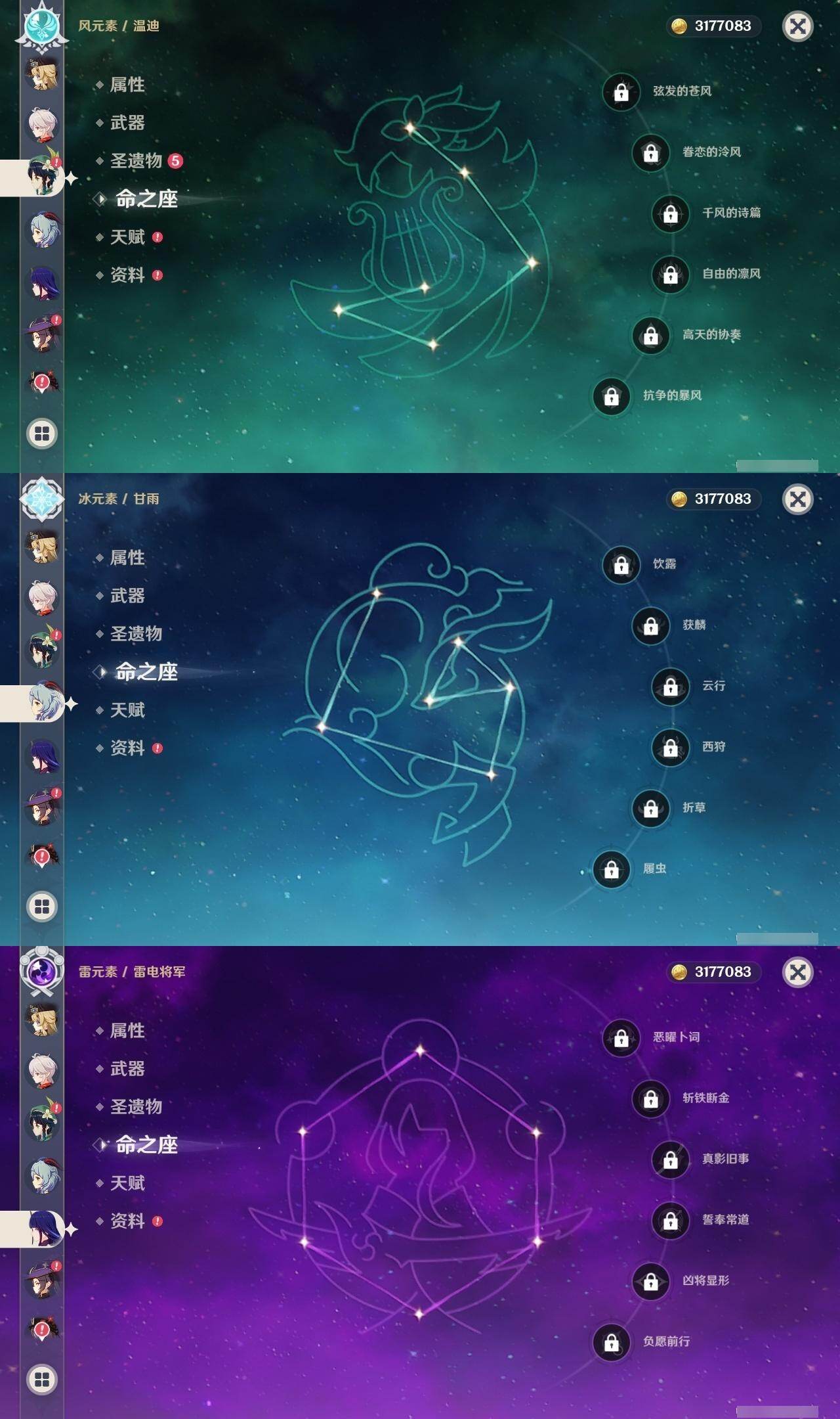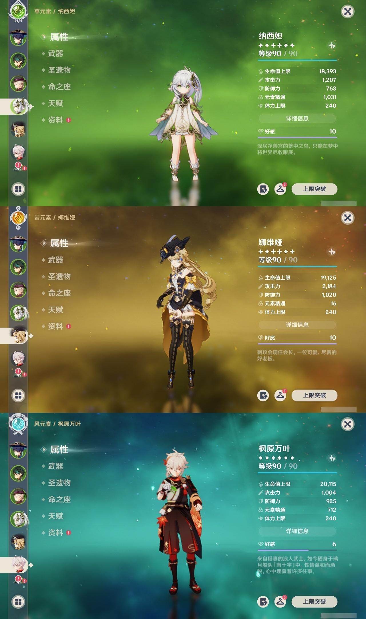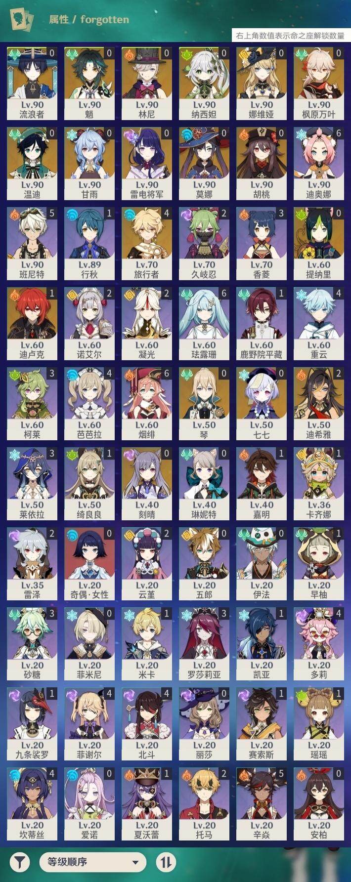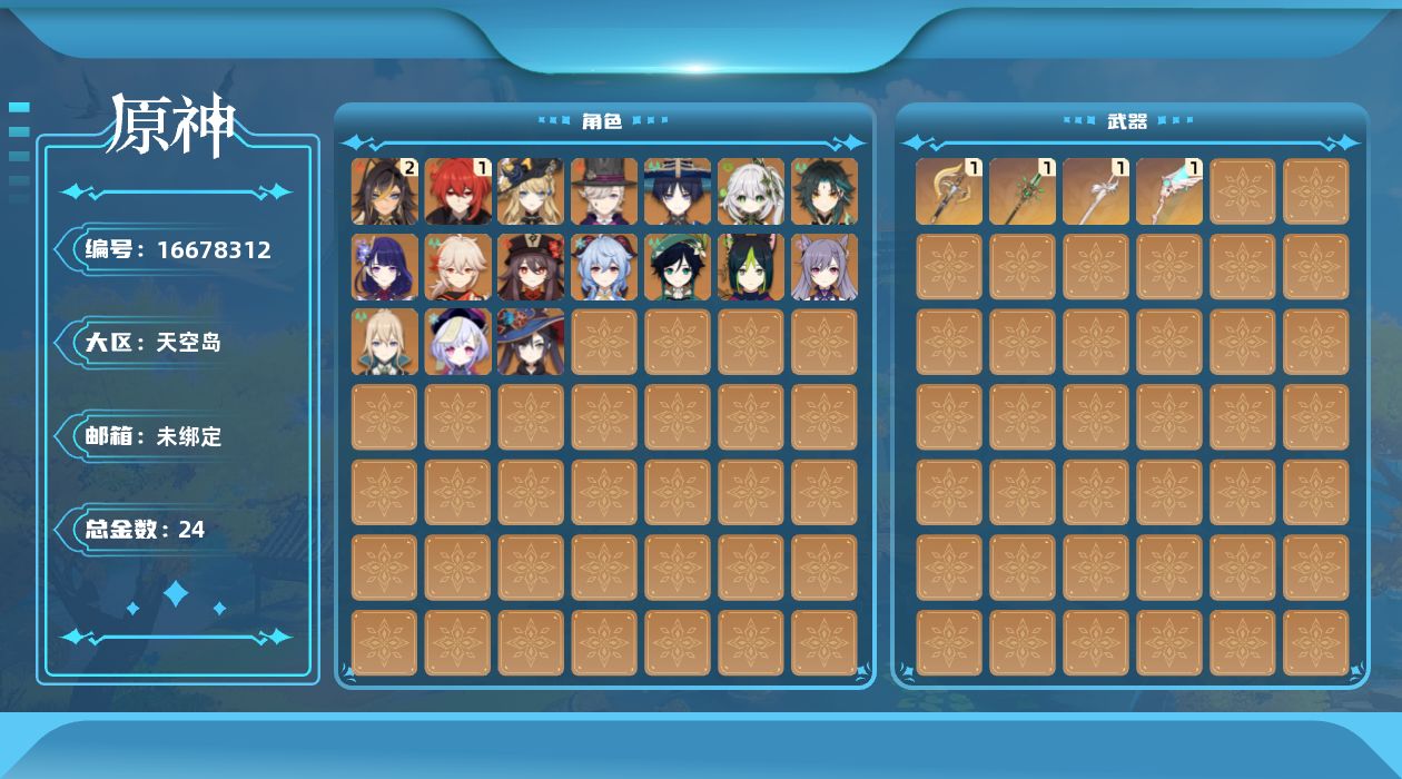 0命娜维娅,0命林尼,2命迪希雅,0命流浪者,0命纳西妲,0命提纳里,0命雷电将军,0命枫原万叶,0命胡桃,0命甘雨,0命魈,0命温迪,0命刻晴,0命七七,0命琴,0命莫娜,1命迪卢克,精1裁断,精1和璞鸢,精1天空之翼,精1风鹰剑